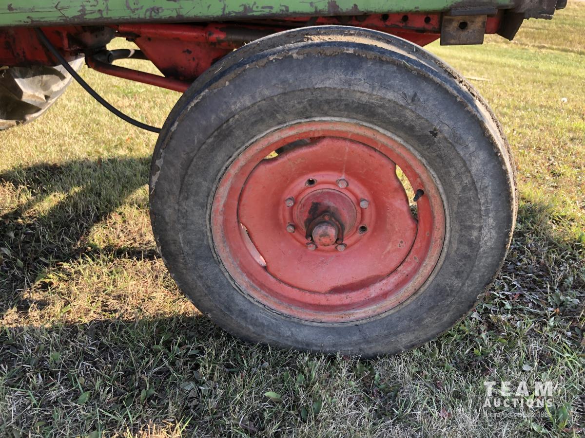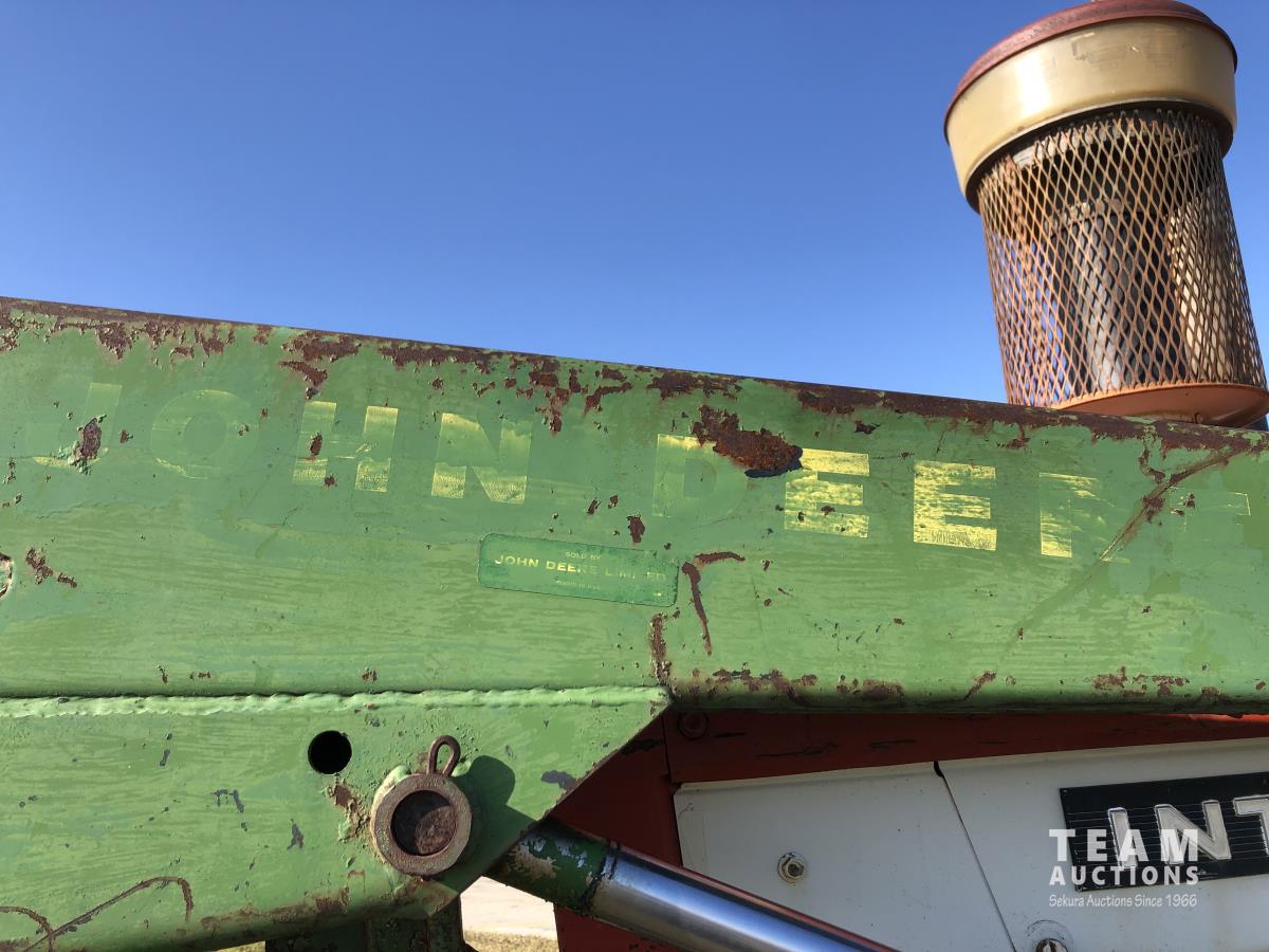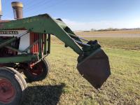 6 cylinder diesel, 8-speed unsynchronized, John Deere loader, 5 ft bucket, 540/1000 PTO, 7.50-20 front tires, 23.1-43 rear tires, hrs unknown