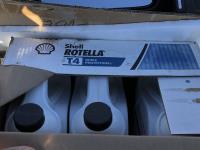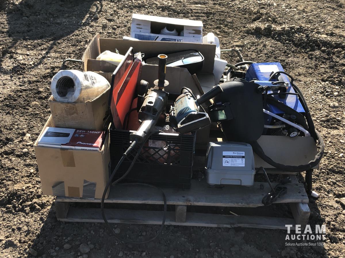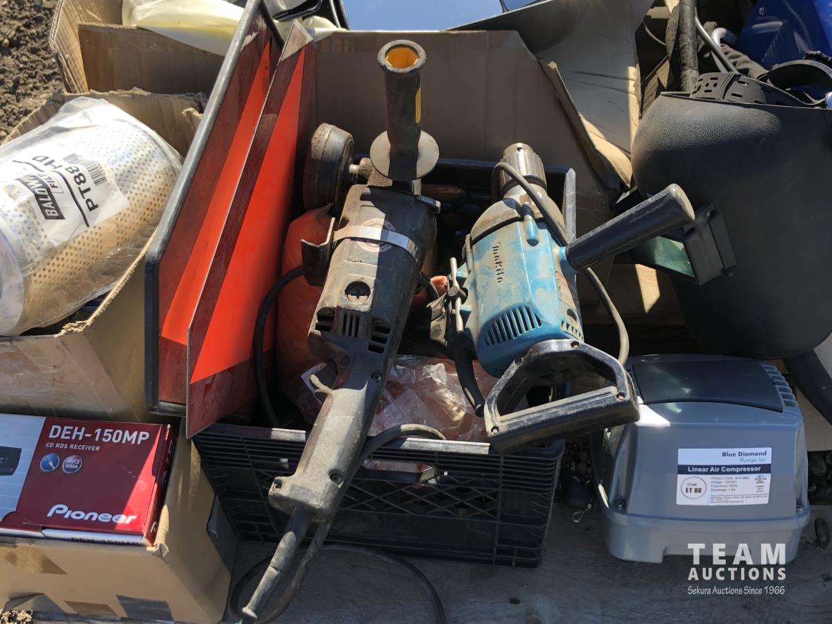 Shell rotella T4-15W-40, 5 liter jugs of oil, Biltek welder, welding helmet, Blue Diamond linear air compressor (unused), miscellaneous automotive bulbs, battery warmer, rain jacket, slow moving signs, Makita drill, Dewalt grinder, Dodge driver side electric mirror, hydraulic rams w/ hose