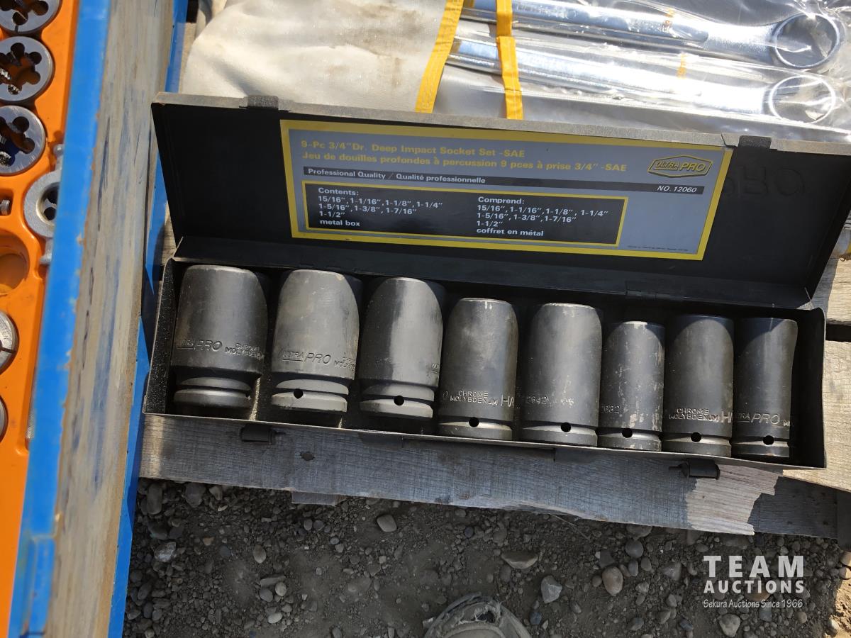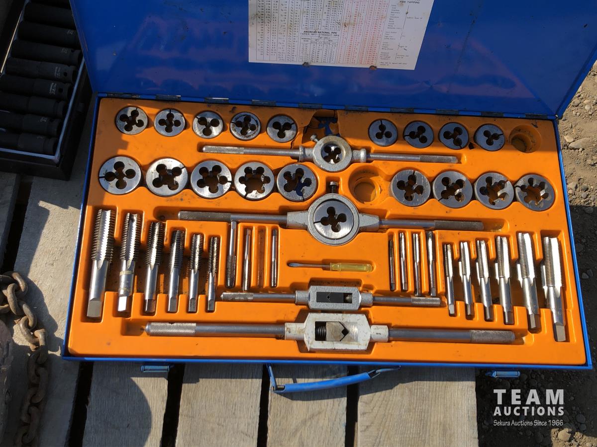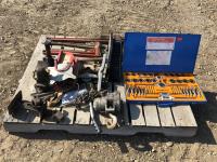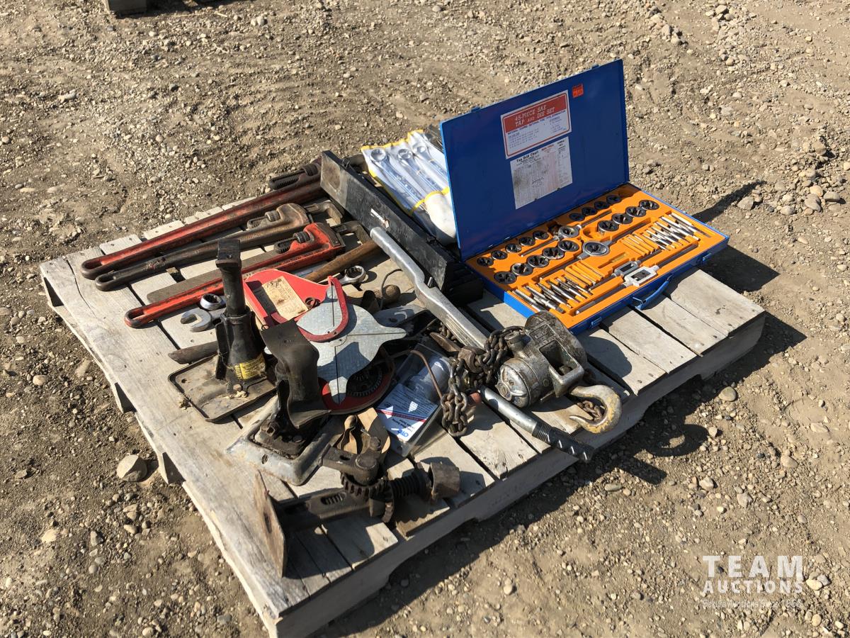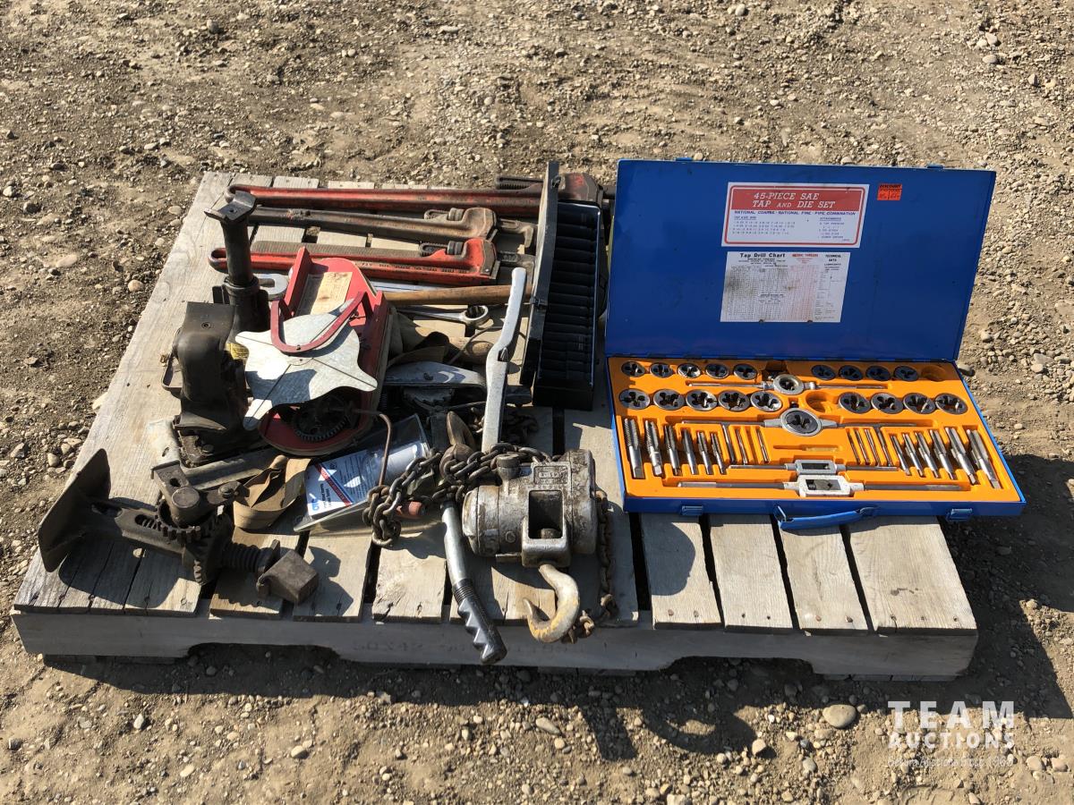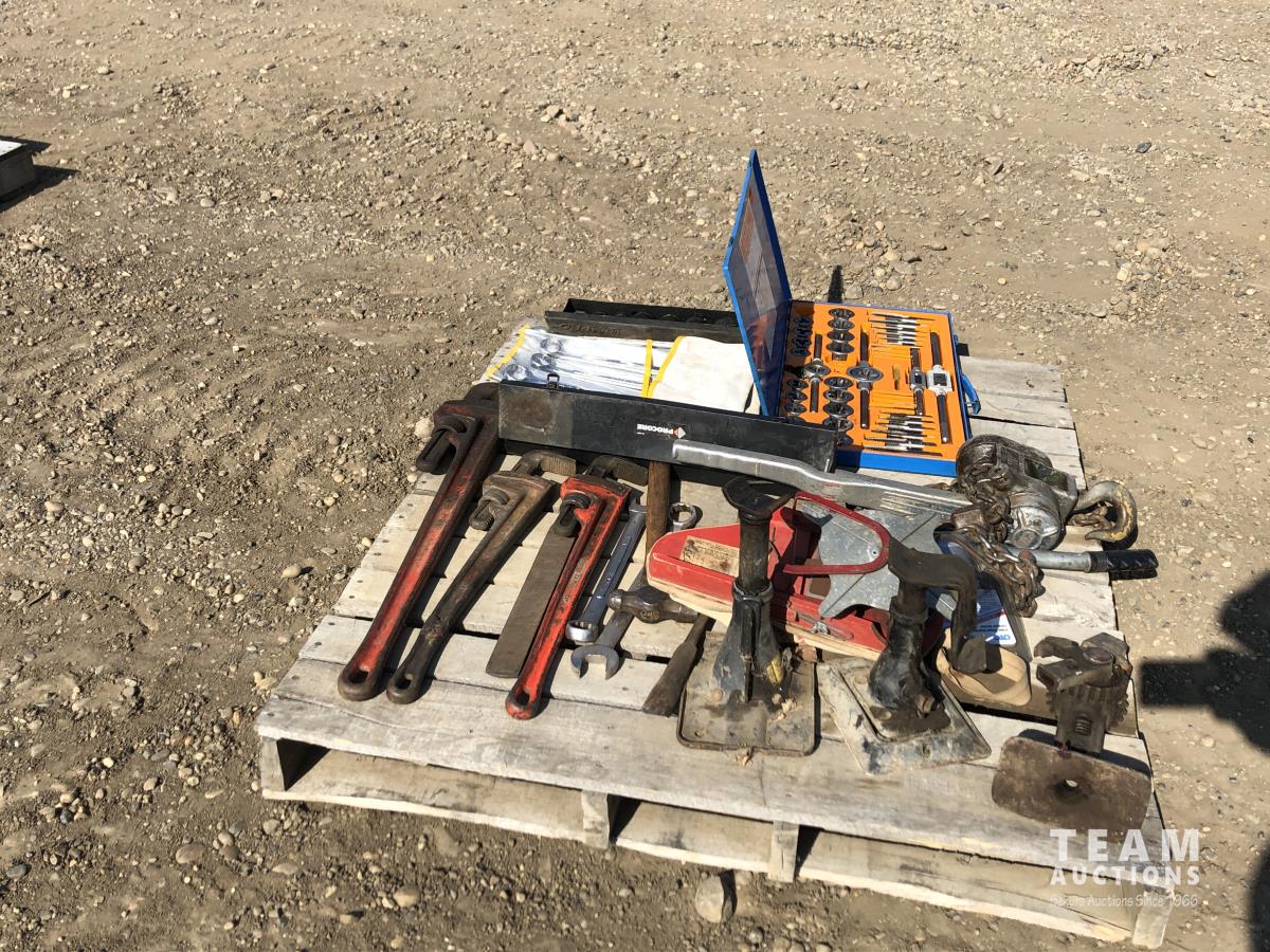 Pipe wrench, jacks, wrenches, sockets, tap & die set, 1-1/2 ton pulley