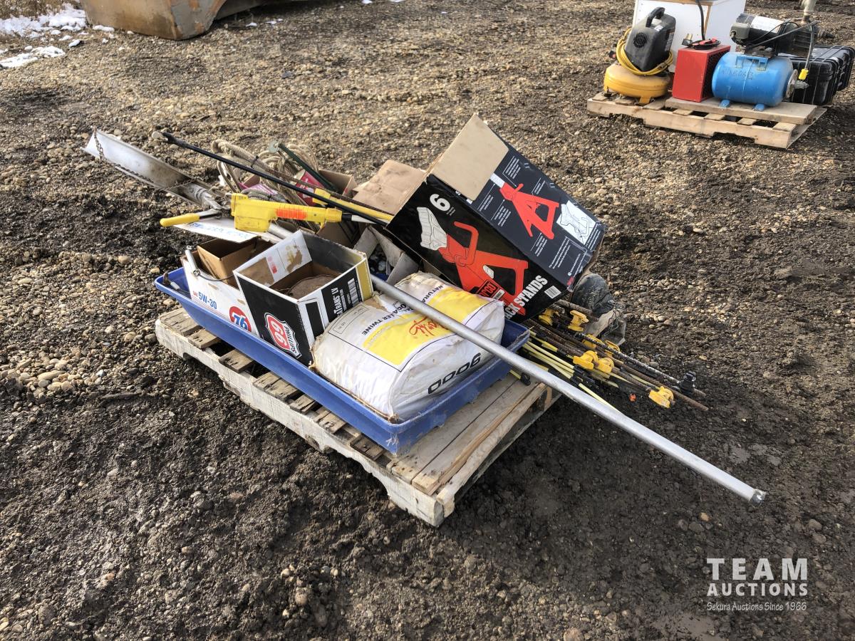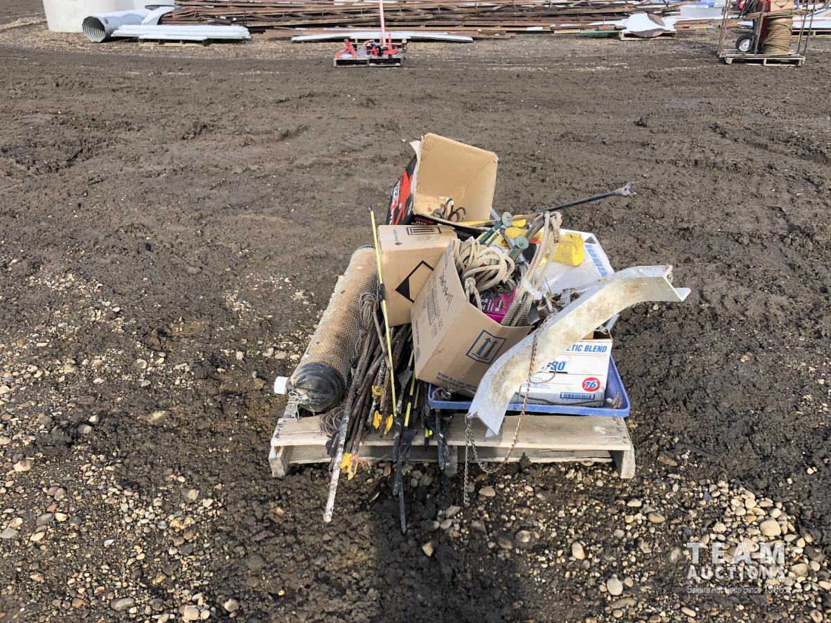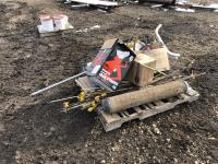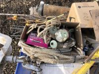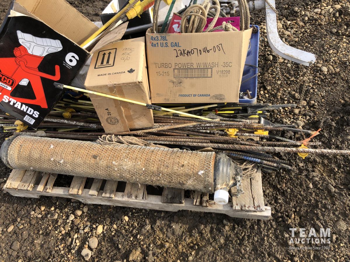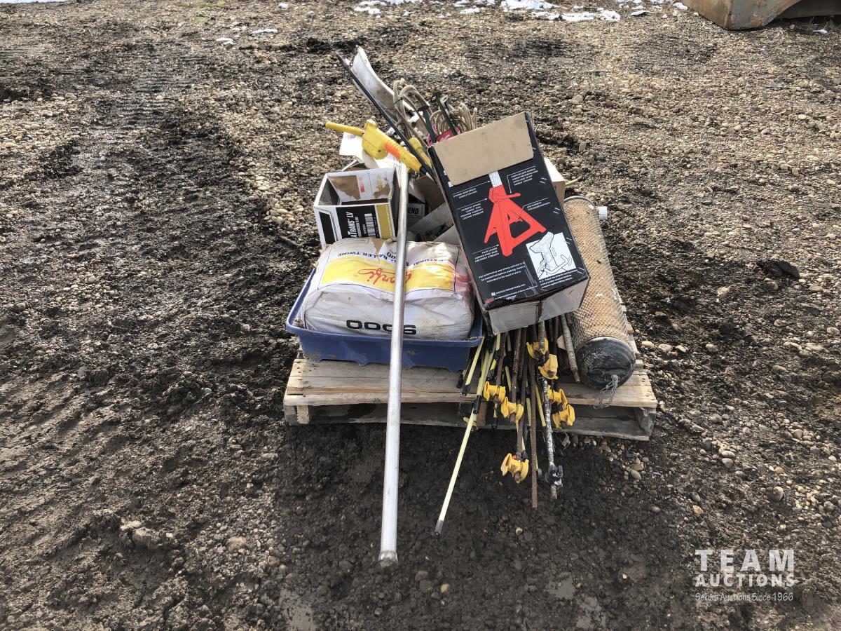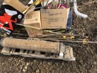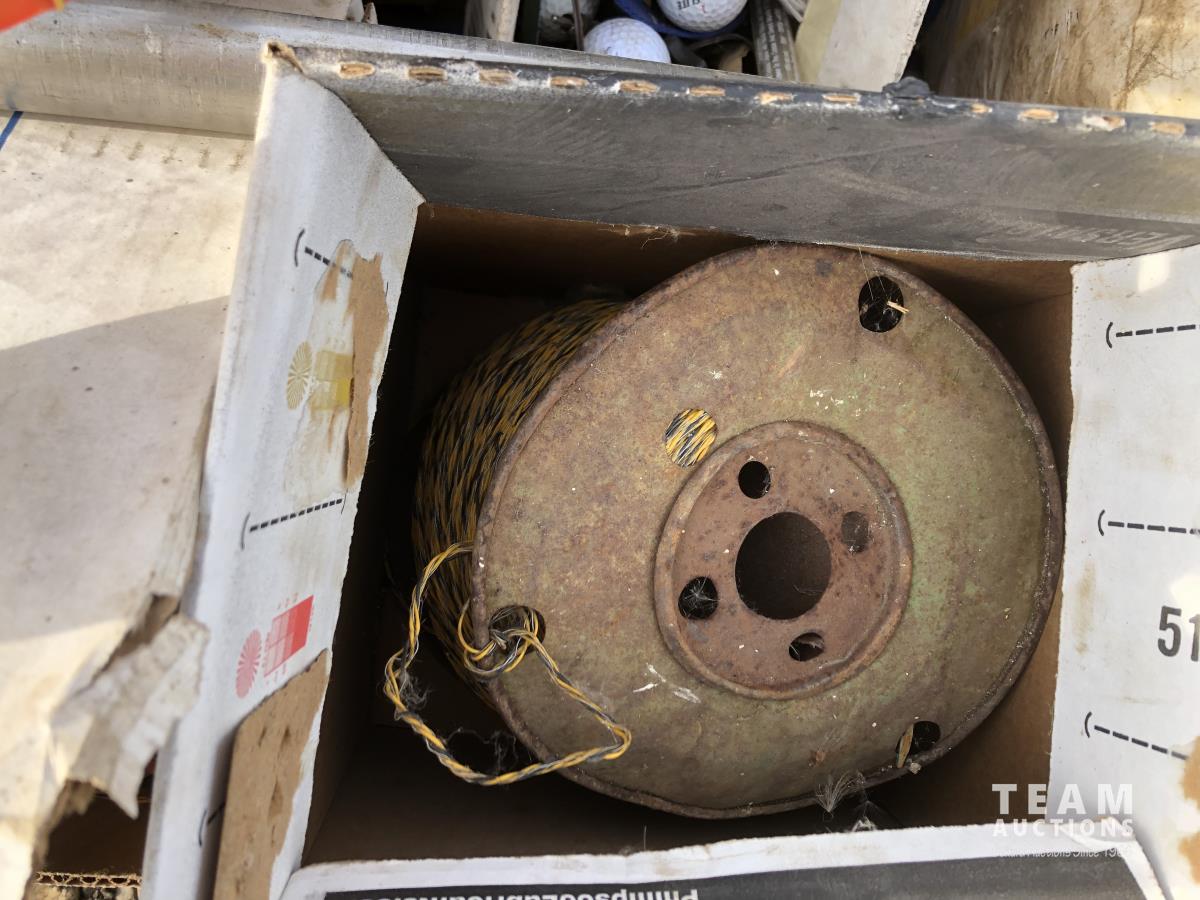 Miscellaneous rods for electric fencer, calf puller, 9000 Sisel wire treater, roll of electric fence wire, calf sleigh, cattle prod, labiate ropes