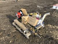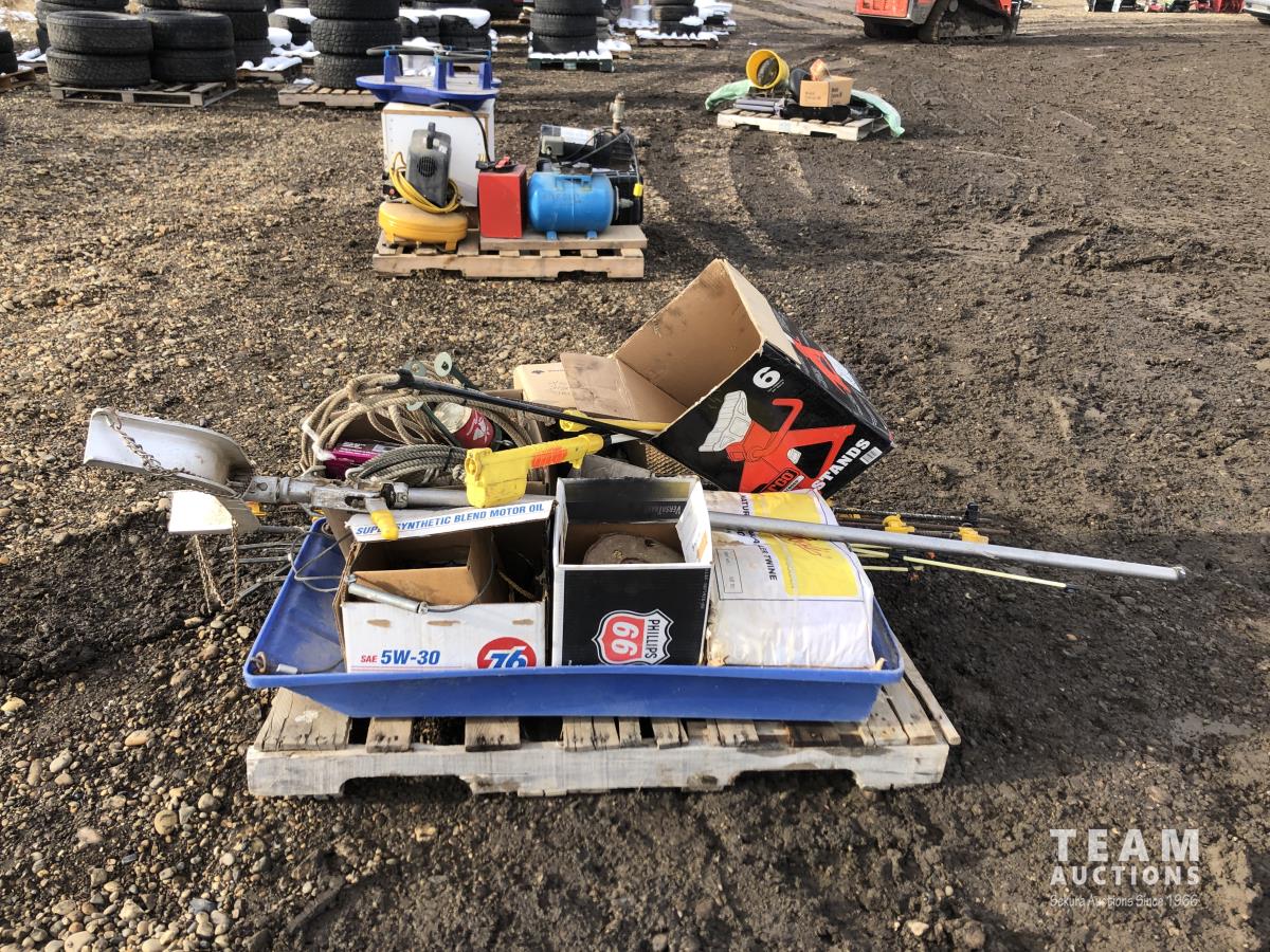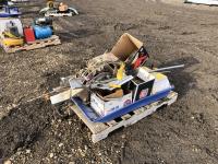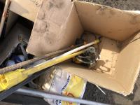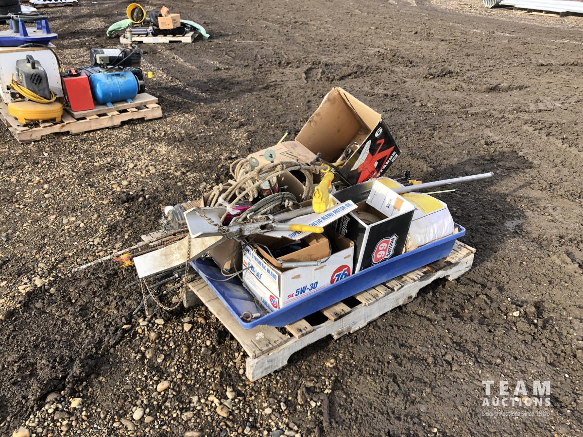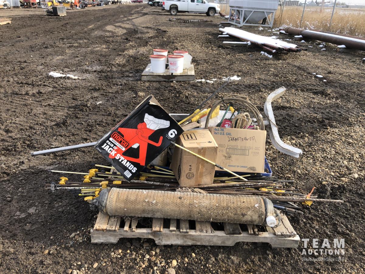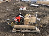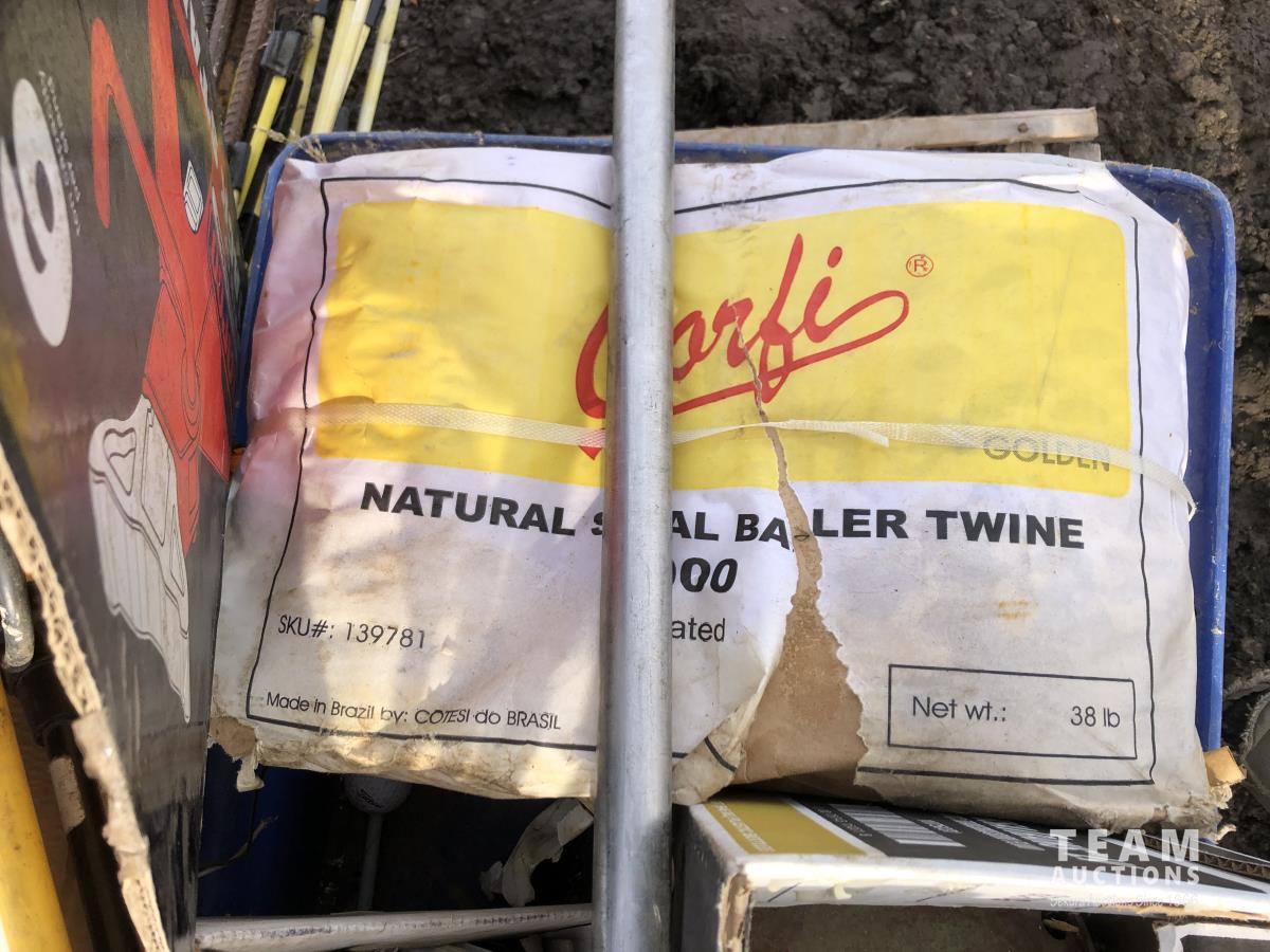 Miscellaneous rods for electric fencer, calf puller, 9000 Sisel wire treater, roll of electric fence wire, calf sleigh, cattle prod, labiate ropes