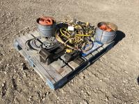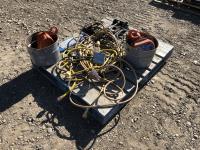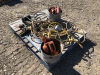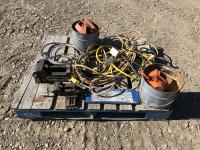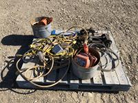 2 ton chain hoist, 1 ton chain hoist, electrical cords, (2) tap & die set, bench vices