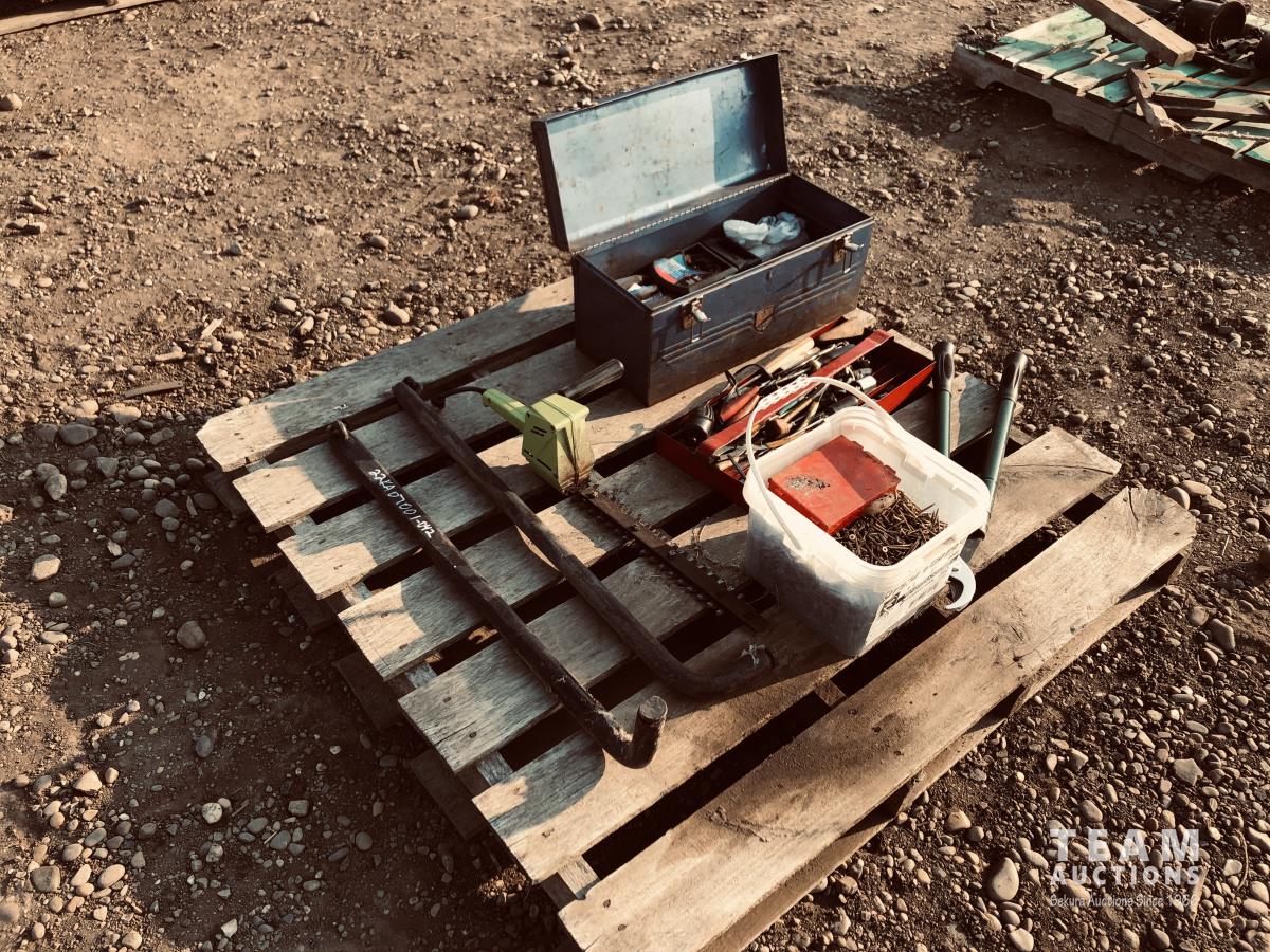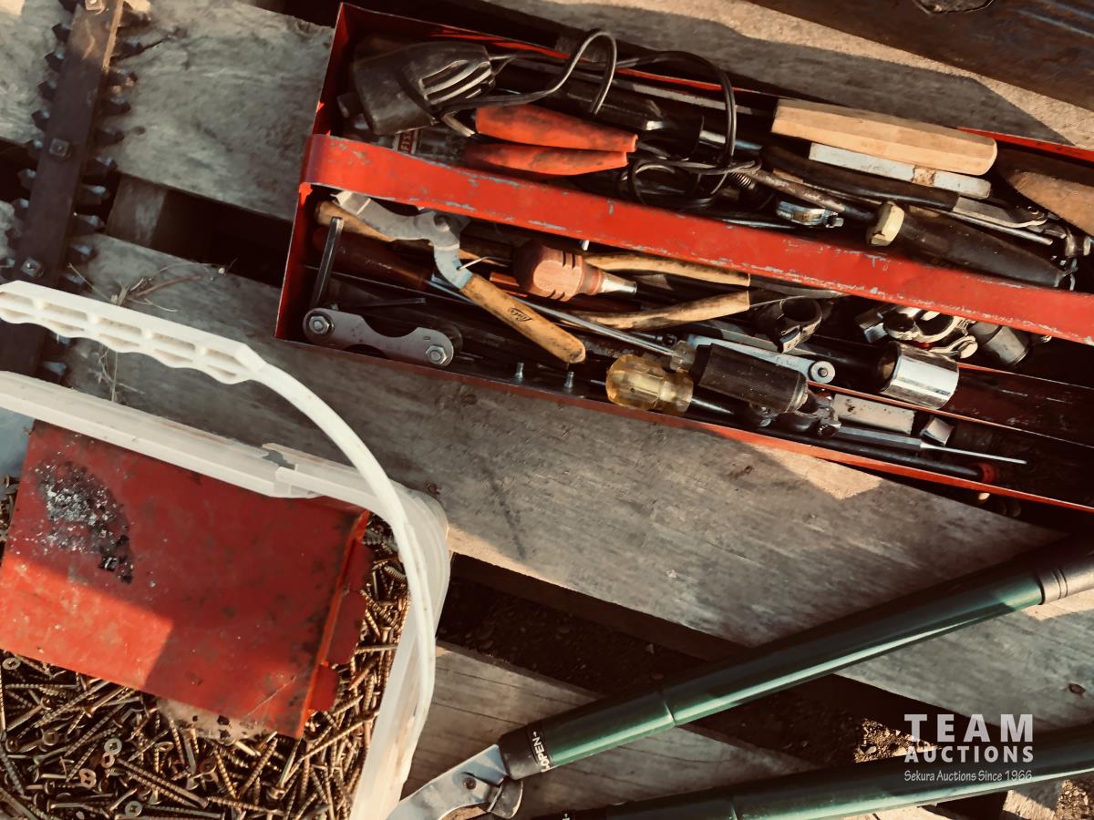 Toolbox of miscellaneous tools, pail of screws, set of sway bars, hedge trimmers