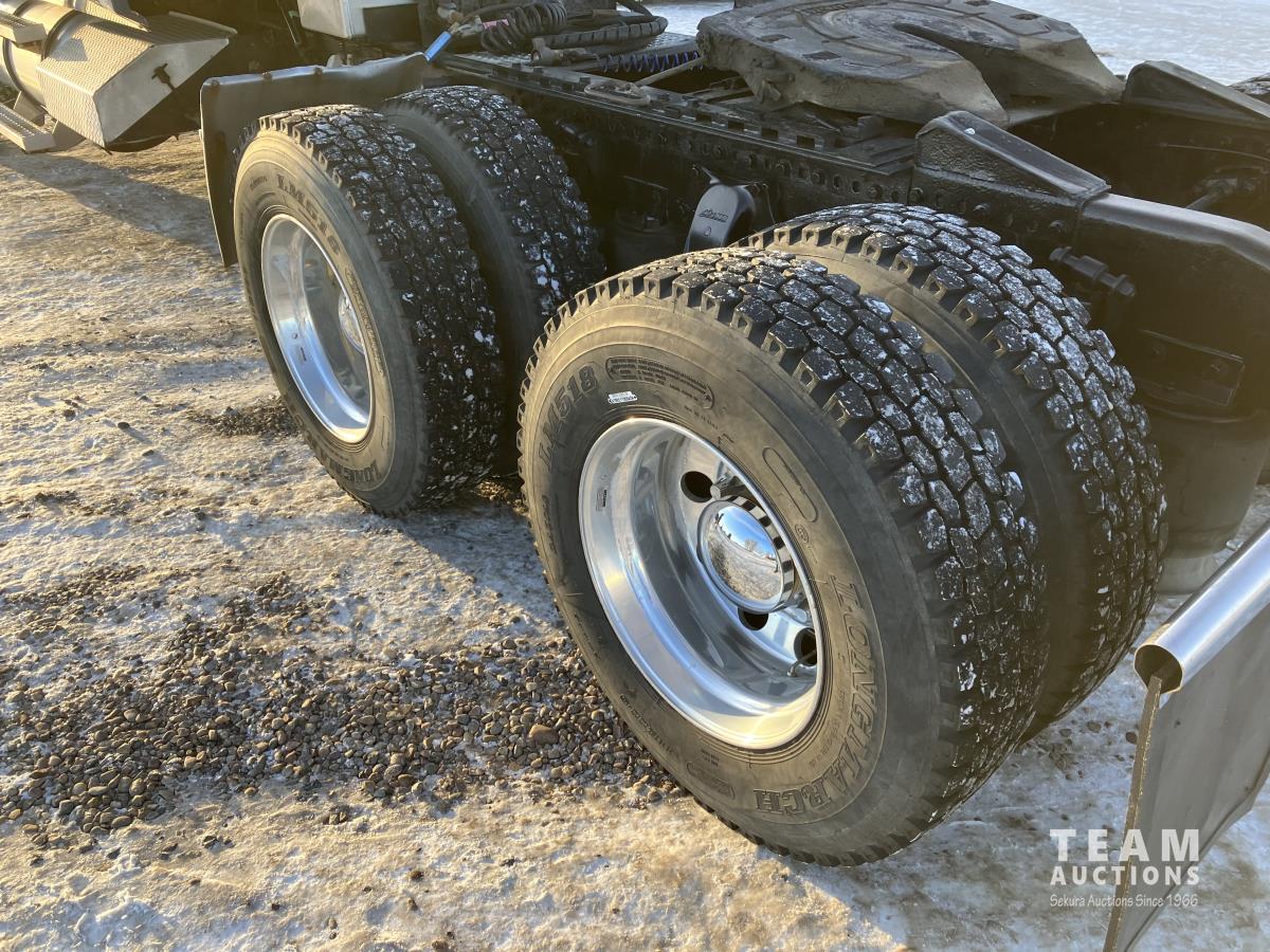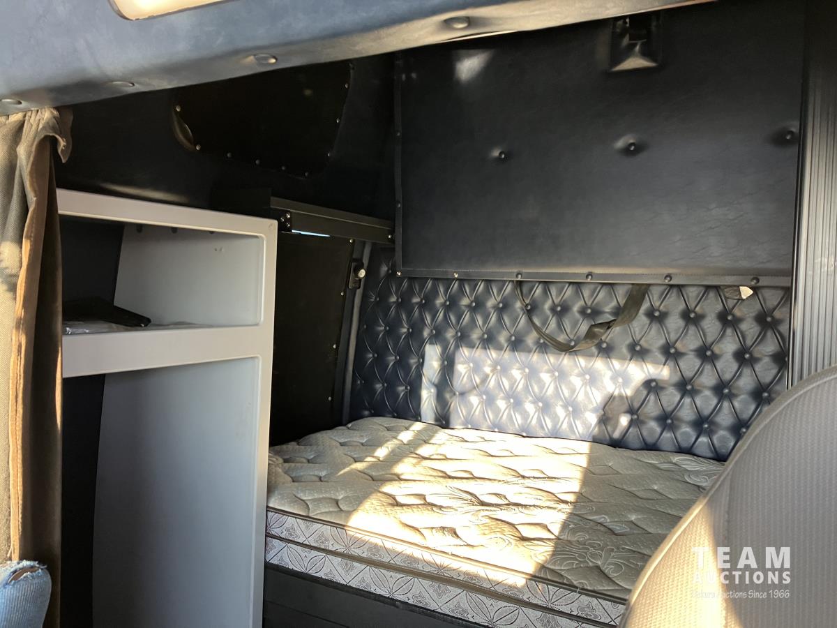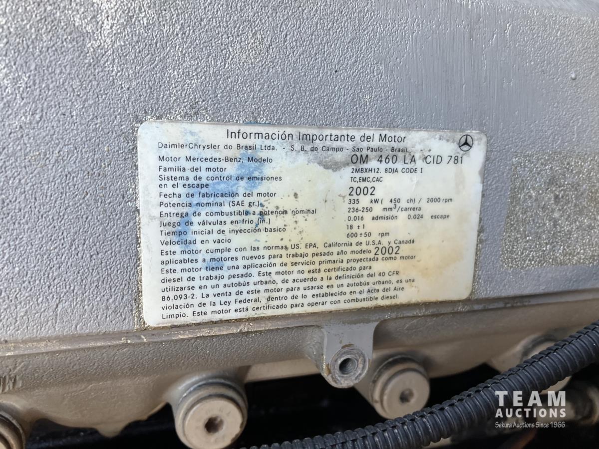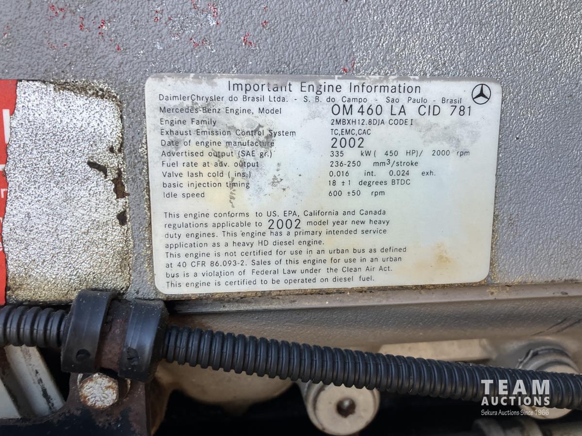 Mercedes 450 HP diesel engine, engine brake, engine block heater, Eaton Fuller 13 speed manual transmission, wet kit, air suspension, 12,000 lb front axles, 20,000 lb rear axles, diff lock, 244 inch WB, A/C, air ride driver seat, 68 inch sleeper, sleeper heater, fridge, bunk beds, all aluminum wheels, 11R22.5 tires