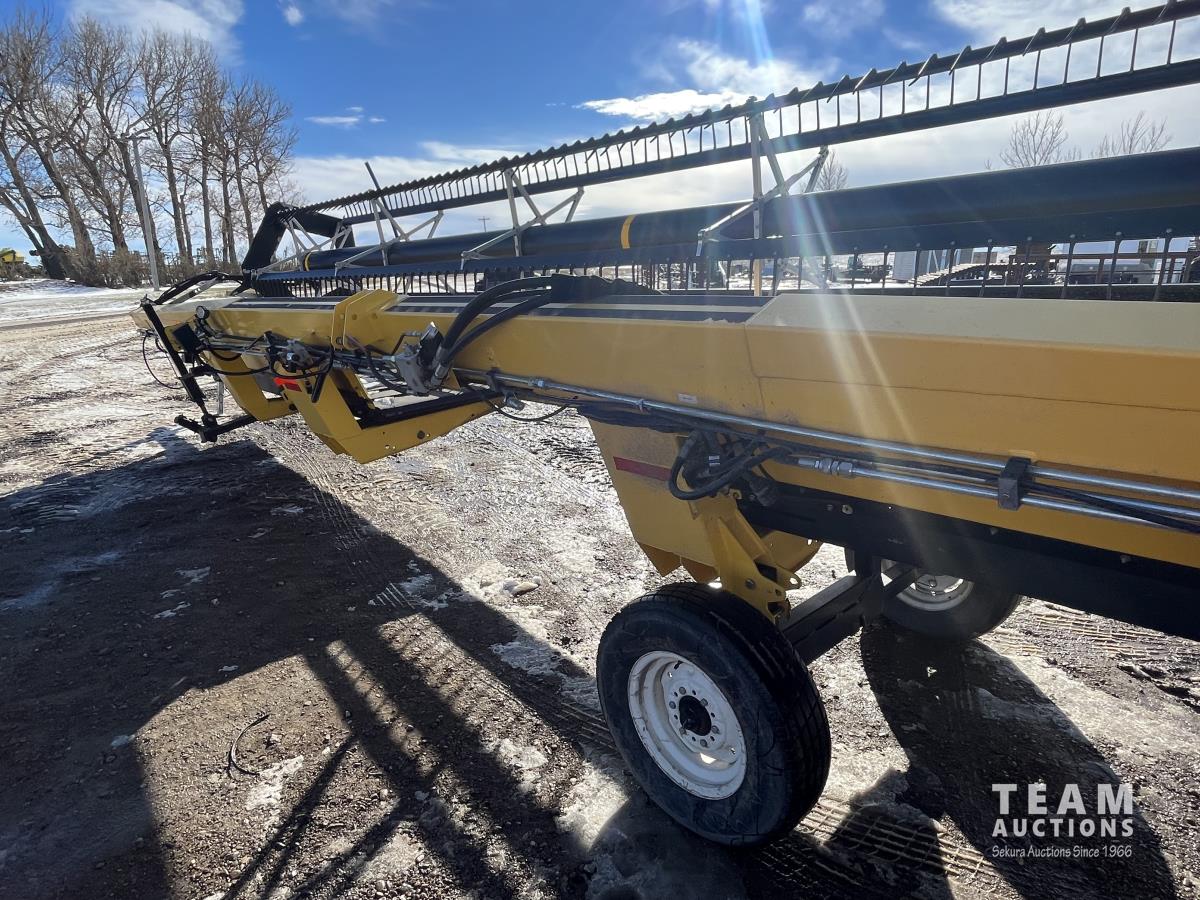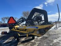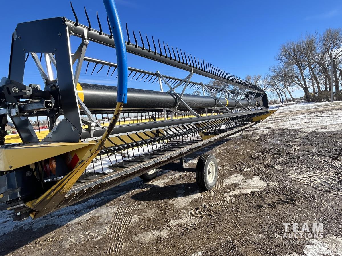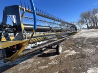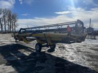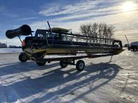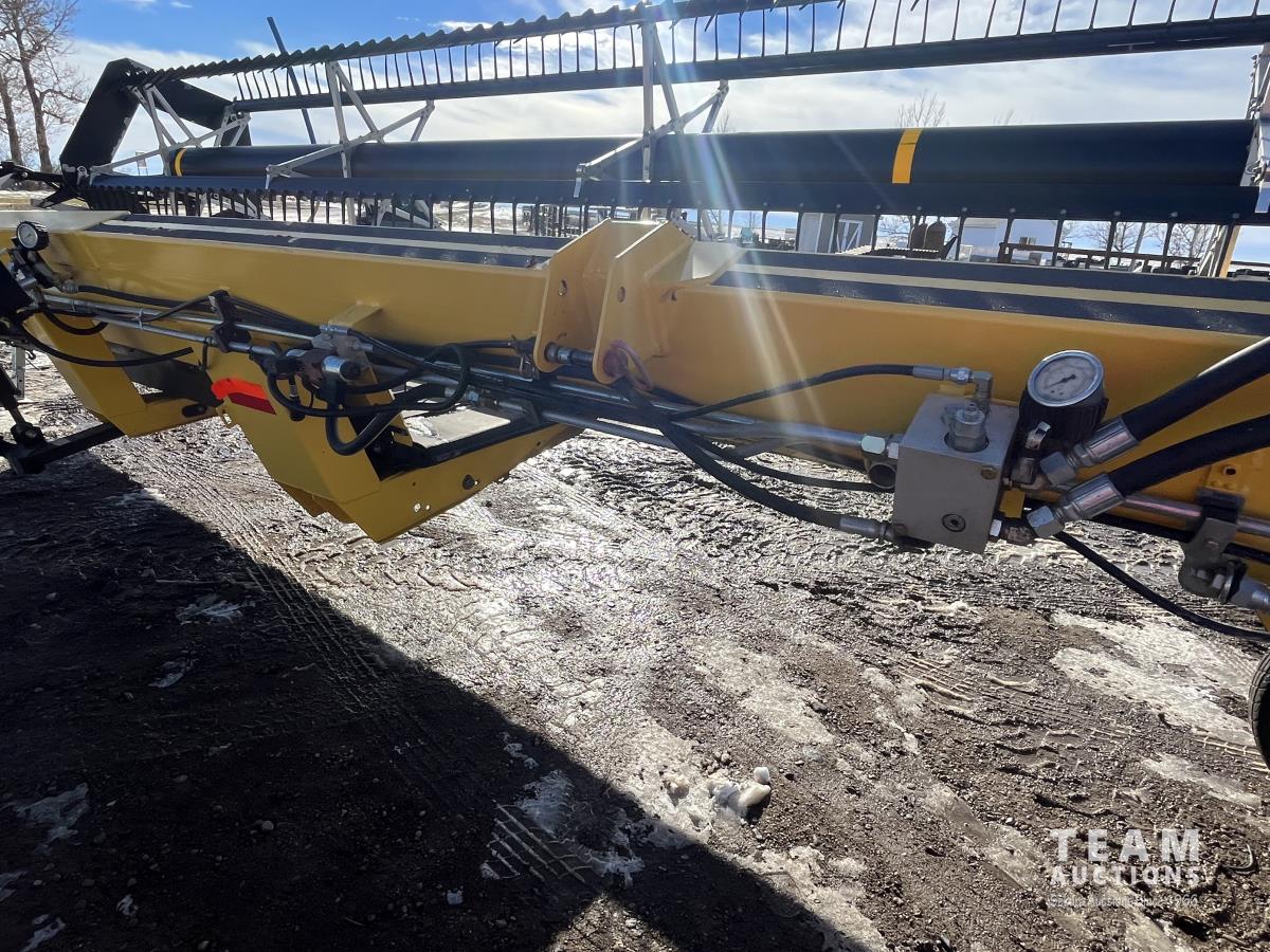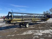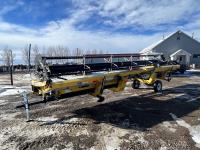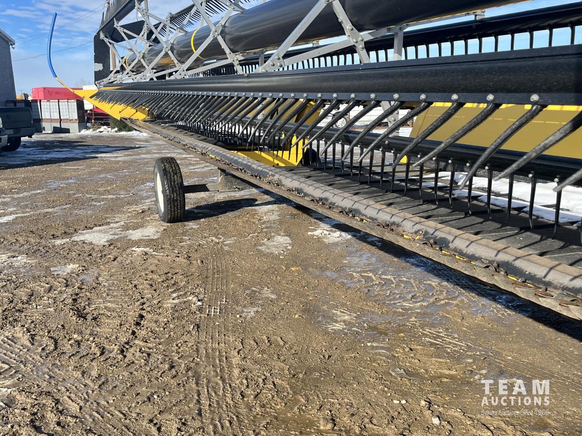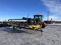 36 ft header, double knife drive, transport trailer w/ transport light kit, hydraulic fore & aft, poly tapered swath roller, 18.4R26 front, 14L-19.1 rear
