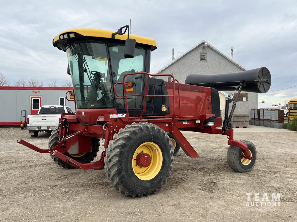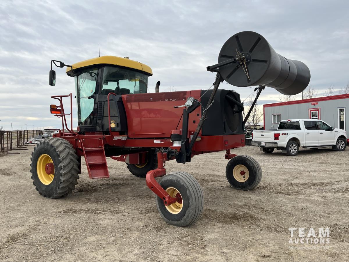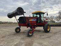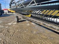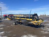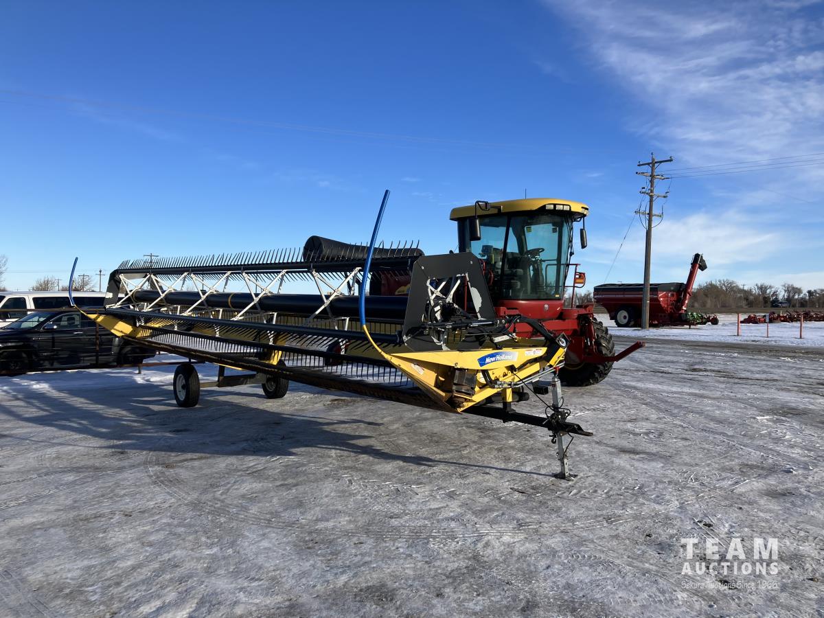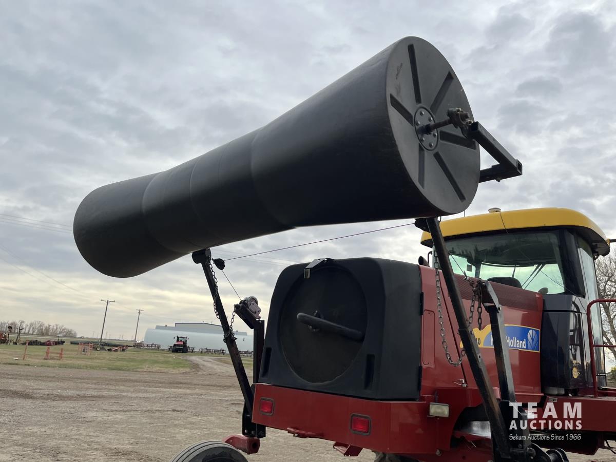36 ft header, double knife drive, transport trailer w/ transport light kit, hydraulic fore & aft, poly tapered swath roller, 18.4R26 front, 14L-19.1 rear