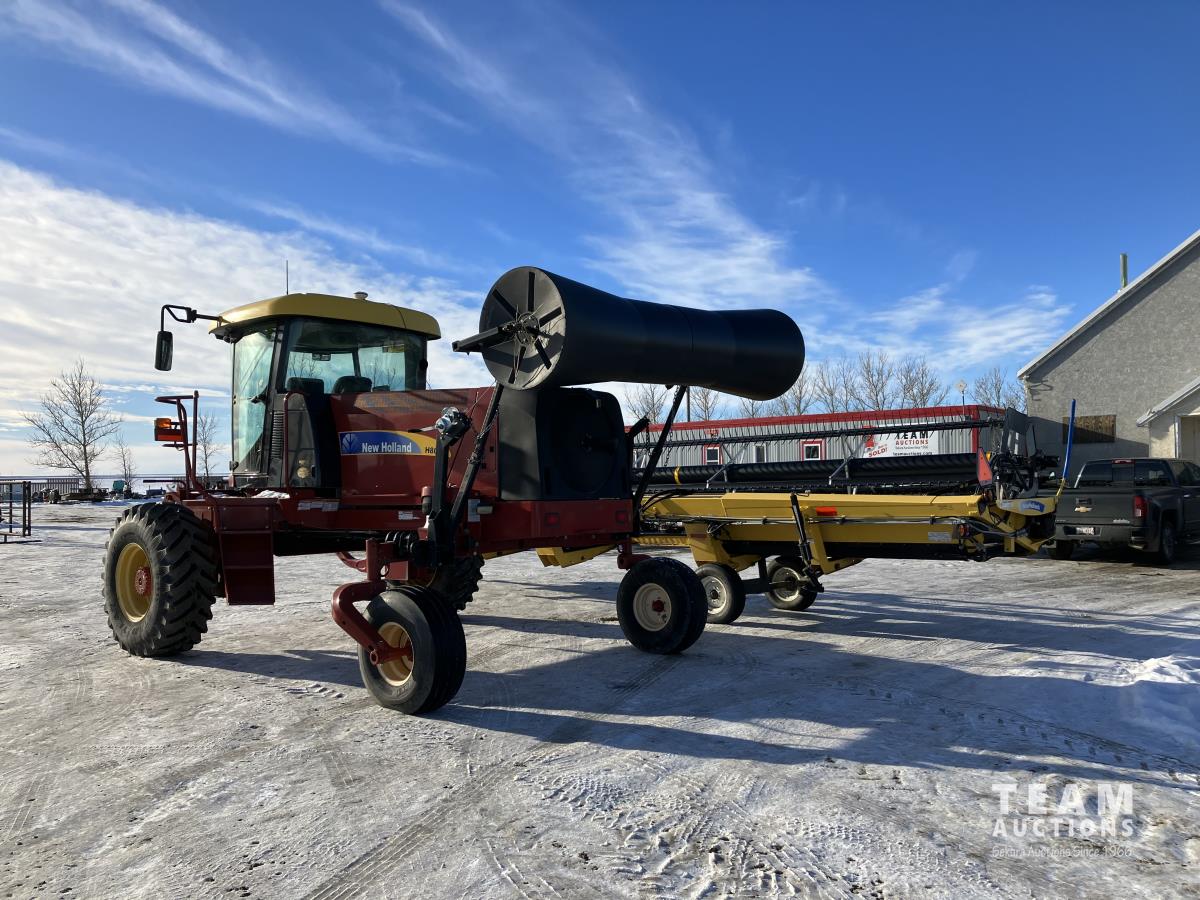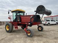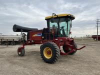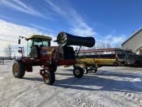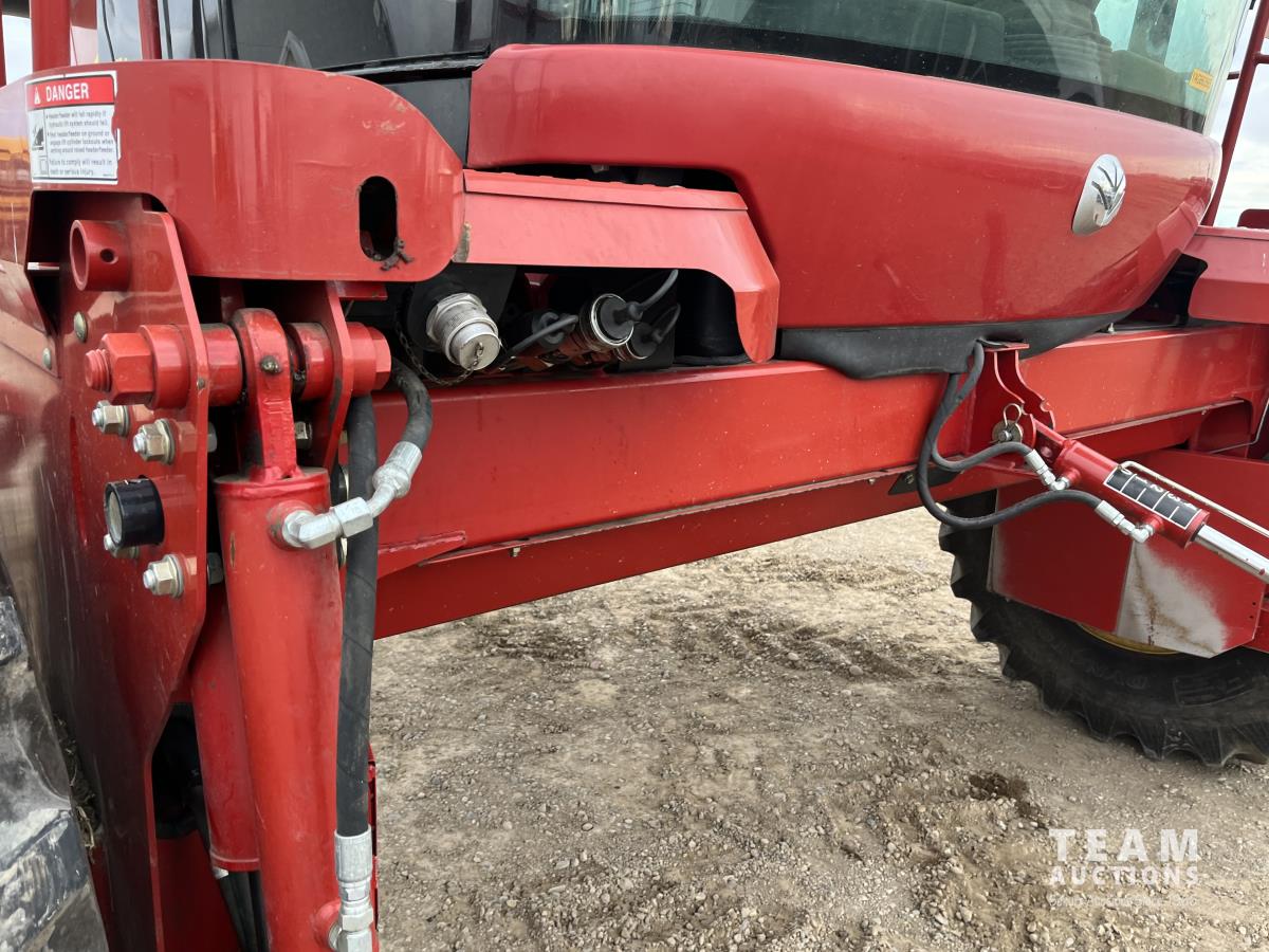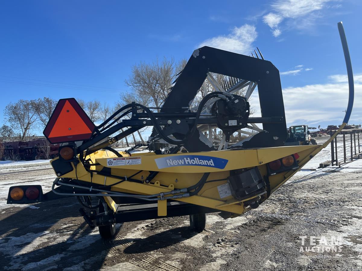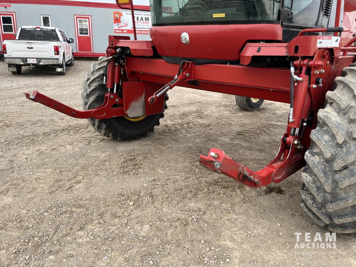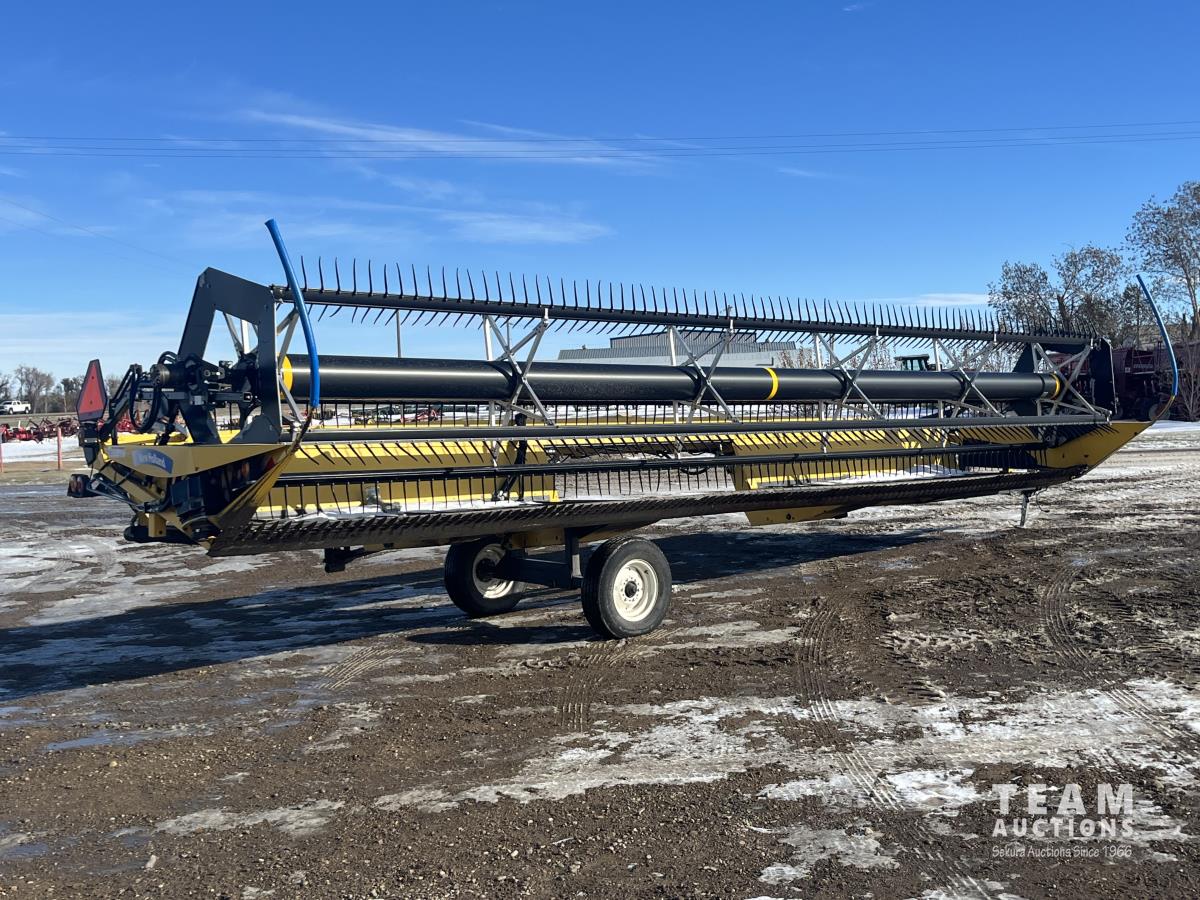 36 ft header, double knife drive, transport trailer w/ transport light kit, hydraulic fore & aft, poly tapered swath roller, 18.4R26 front, 14L-19.1 rear