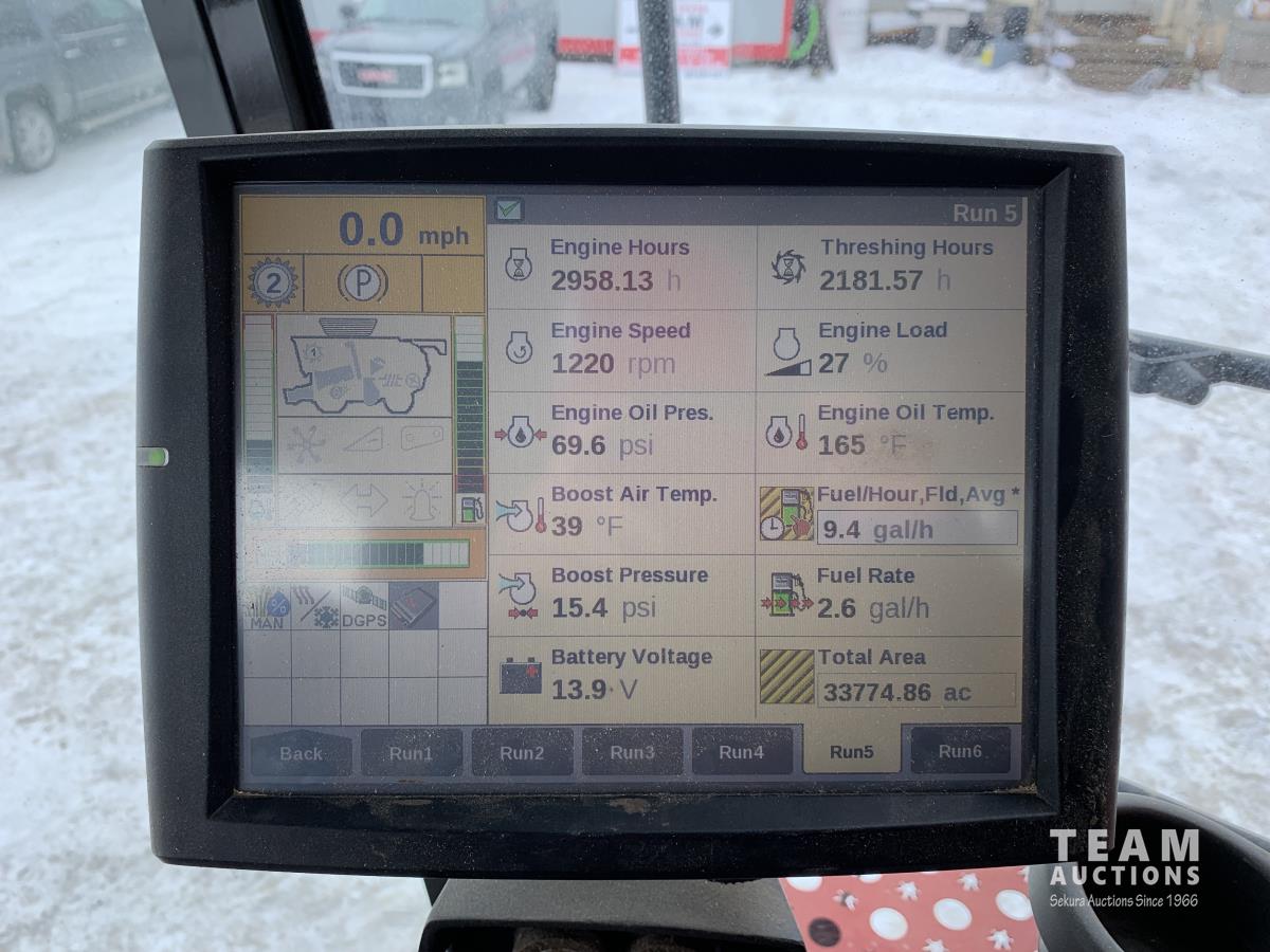 Variable speed reel, auto header height control, fore & aft, reverser, AFS Pro 700, grain tank extensions, rock trap, chaff spreader, fine cut chopper, 900/60R32 front tires, 600/65R28 rear tires, 2181 seperator hrs