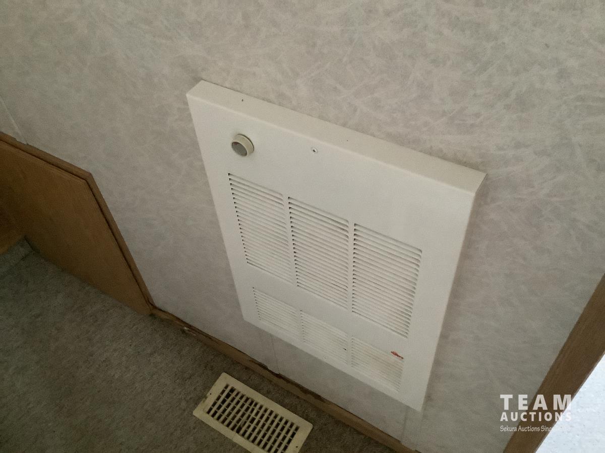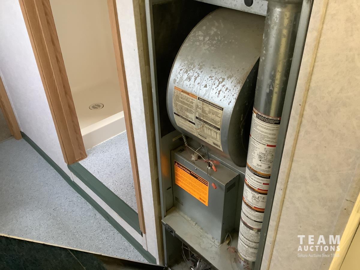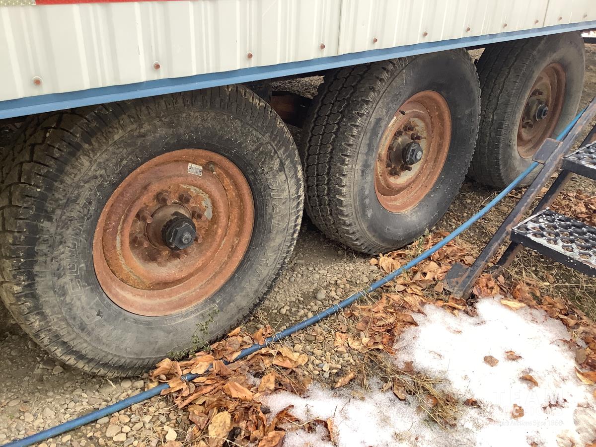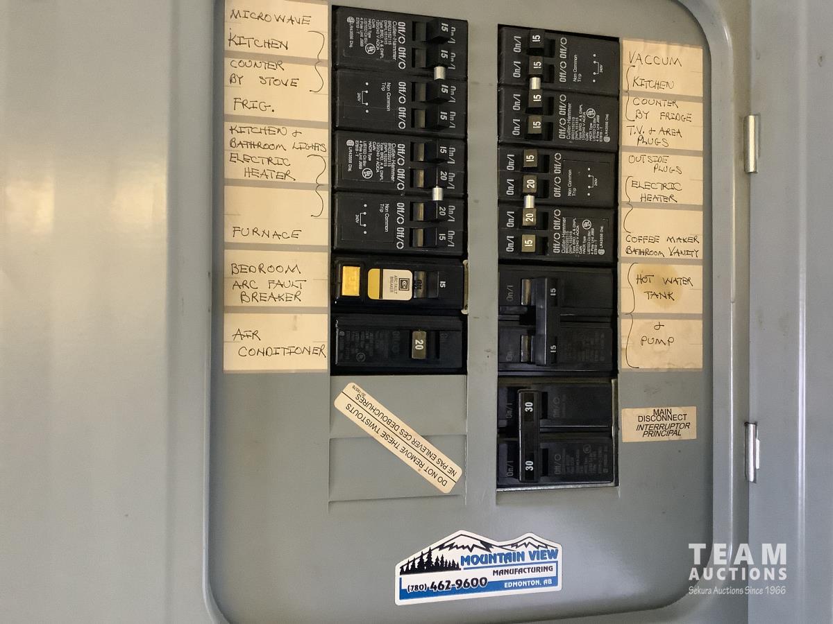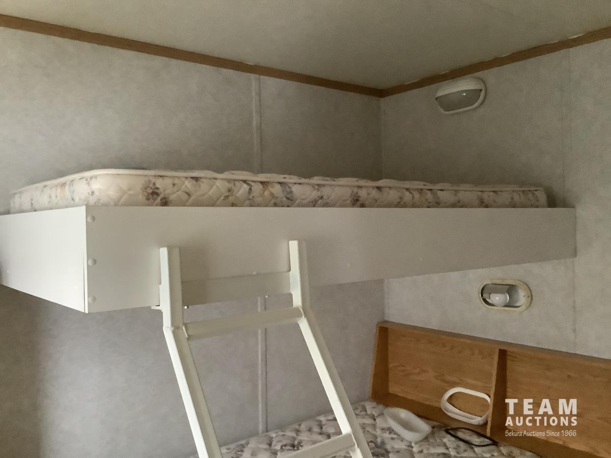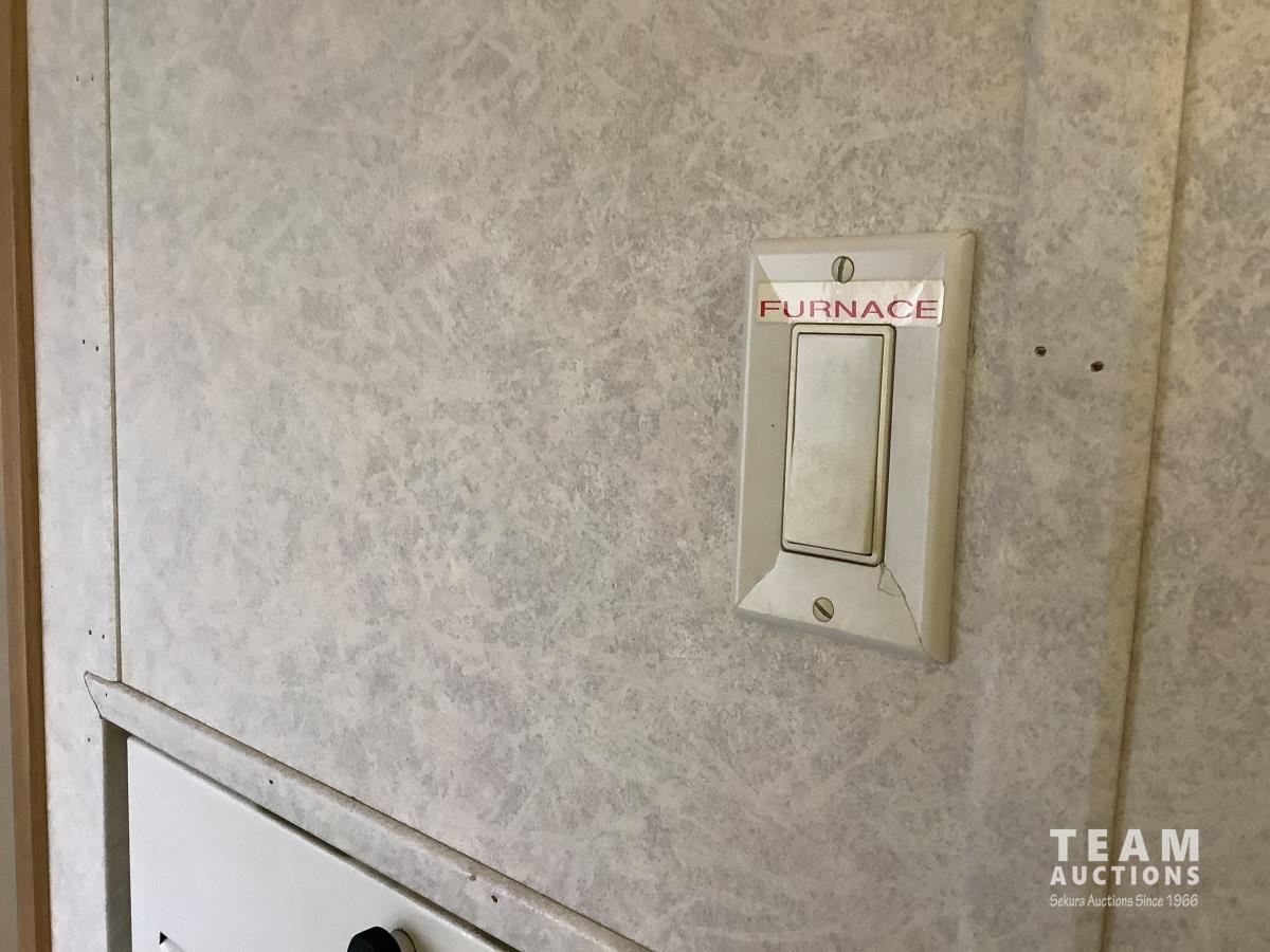 220 single Phase power, (2) Electric wall mount heaters, main large propane forced air furnace, AC, water storage tank, bed room with bunk beds, fridge, stove, microwave, coffee machine, central vac system, full bathroom with toilet, sink and shower, 8,000 lb axles with oil bath bearings, out door metal stairs, long electrical cord, air over hydraulic brakes, storage tool box, pintle hitch, 16 inch tires