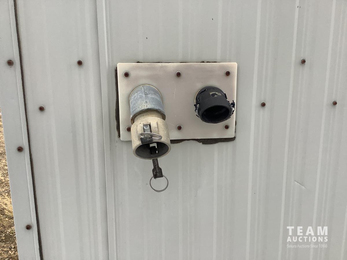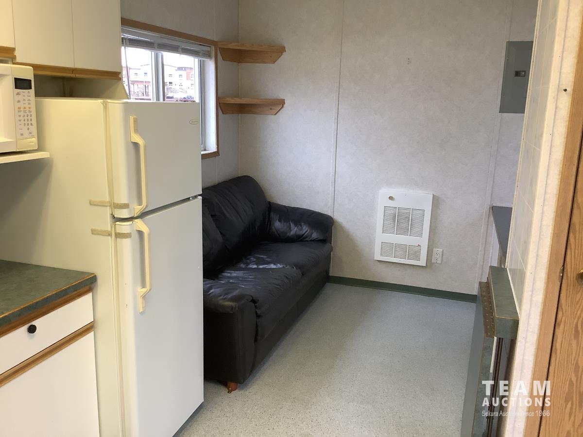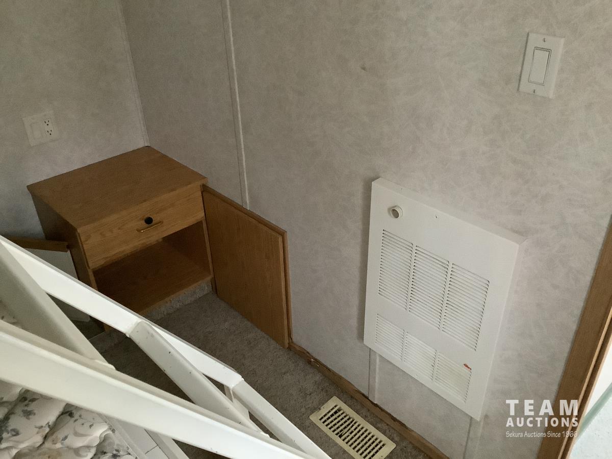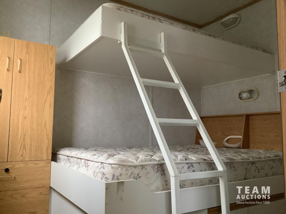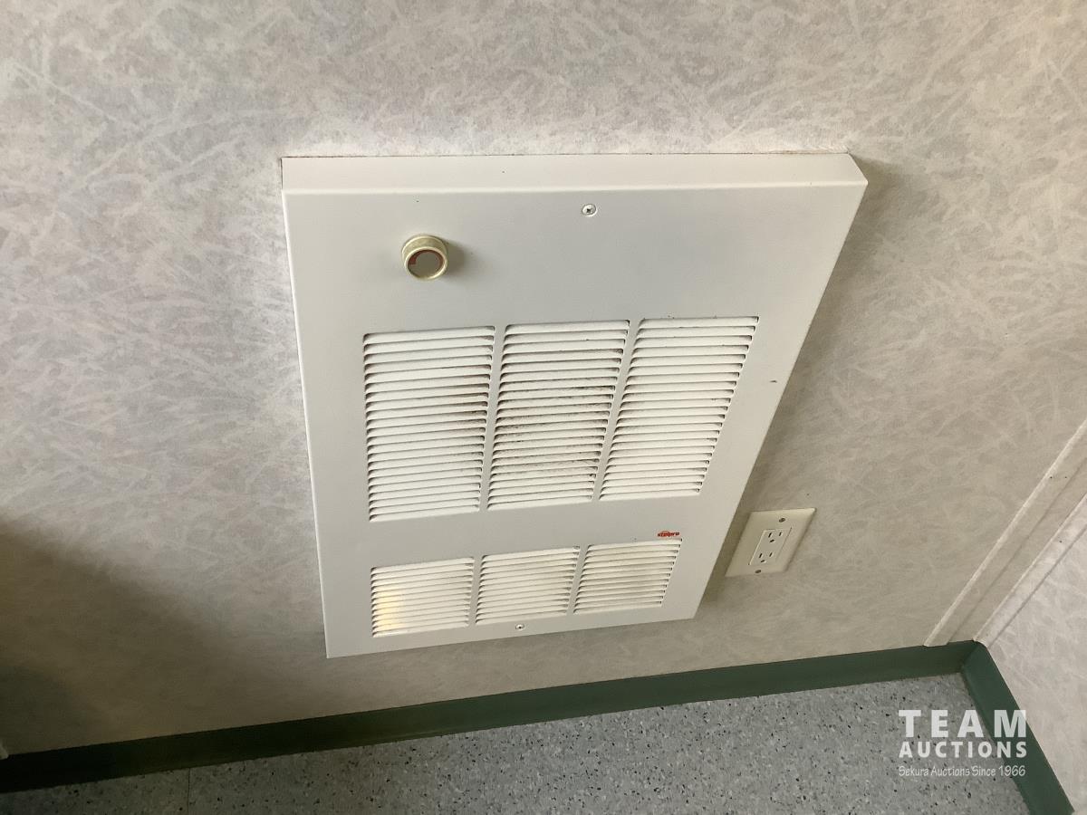 220 single Phase power, (2) Electric wall mount heaters, main large propane forced air furnace, AC, water storage tank, bed room with bunk beds, fridge, stove, microwave, coffee machine, central vac system, full bathroom with toilet, sink and shower, 8,000 lb axles with oil bath bearings, out door metal stairs, long electrical cord, air over hydraulic brakes, storage tool box, pintle hitch, 16 inch tires