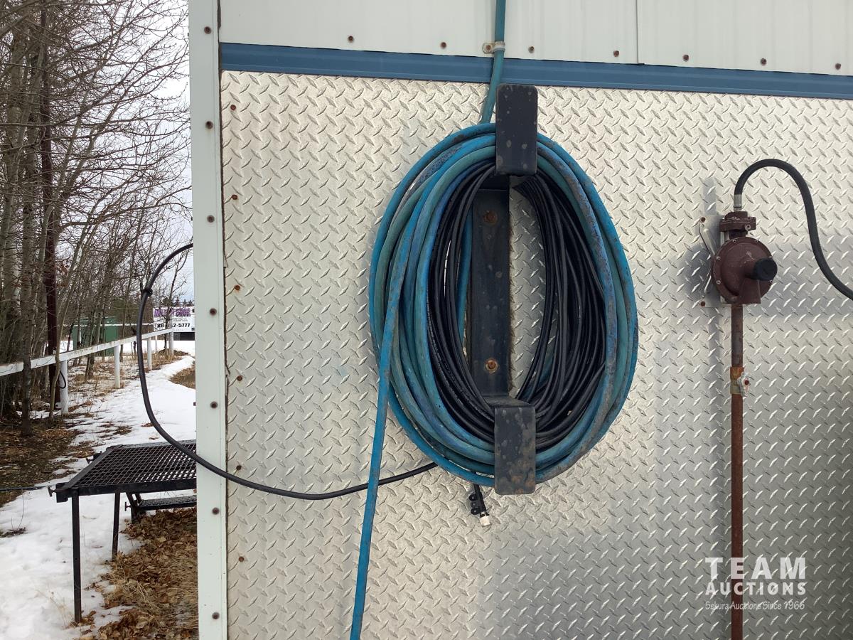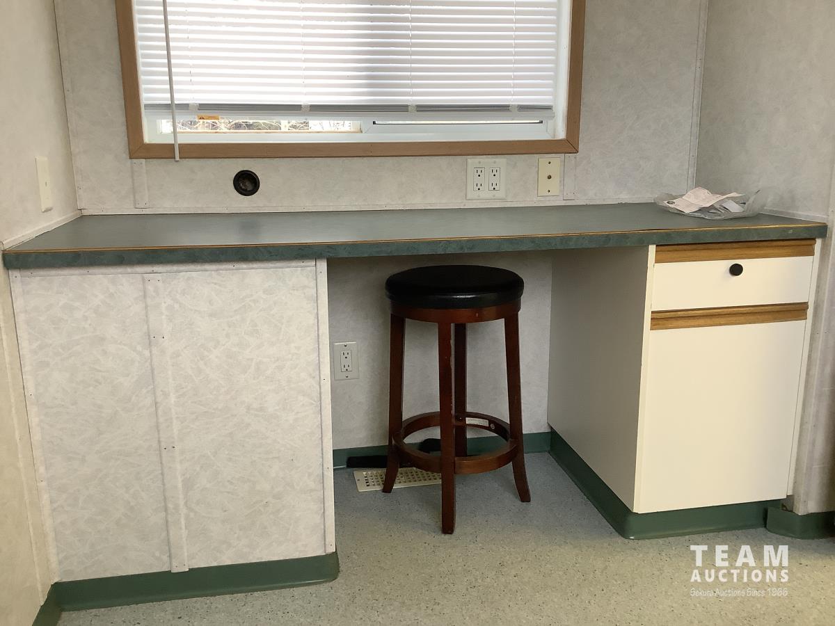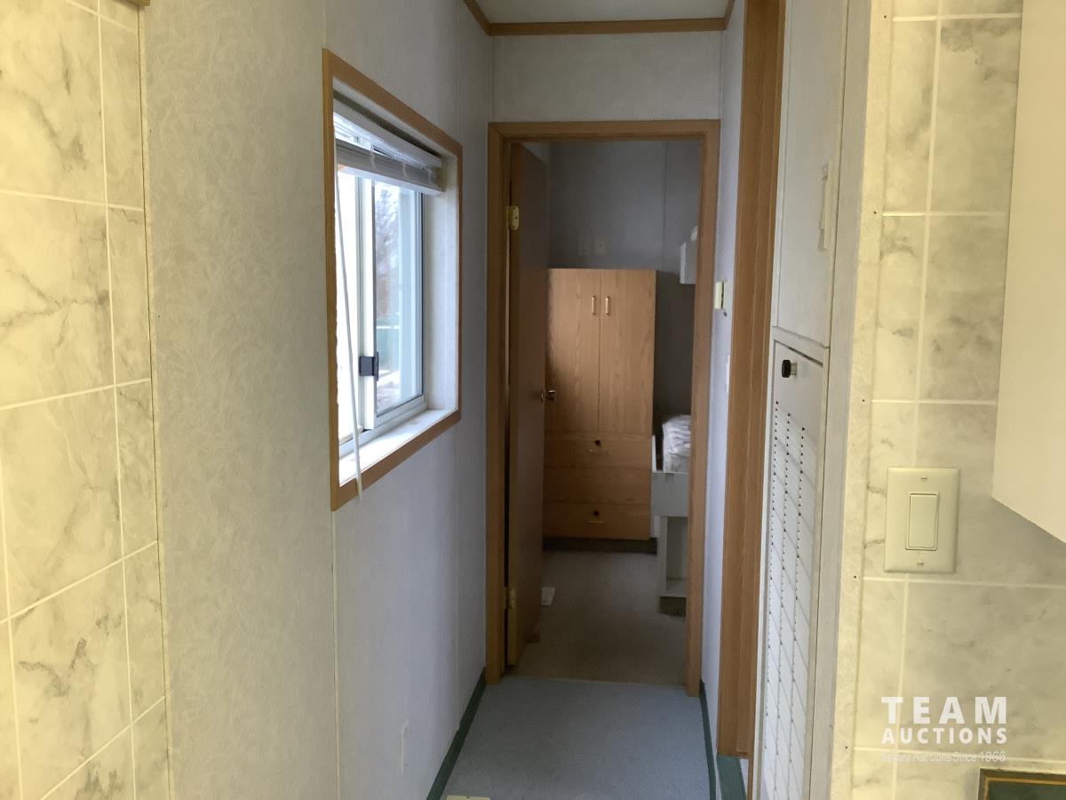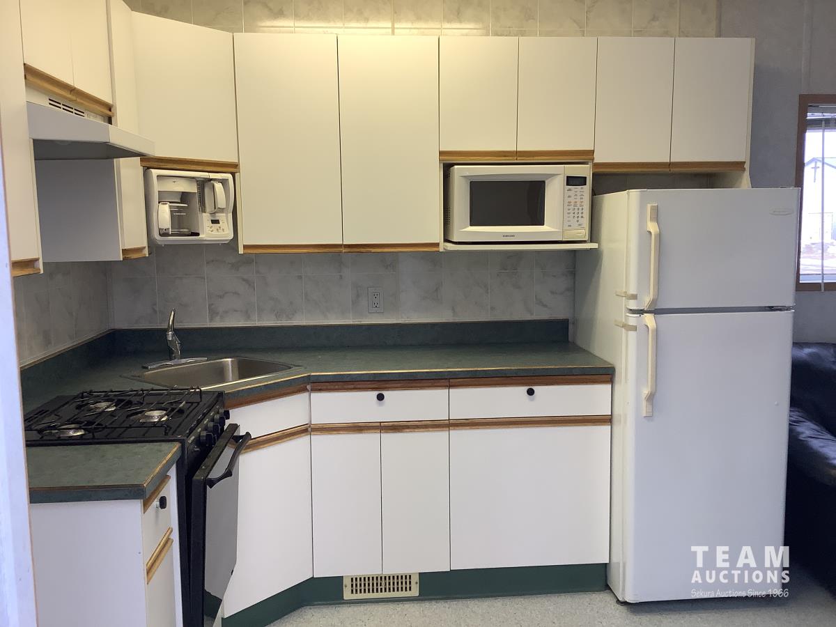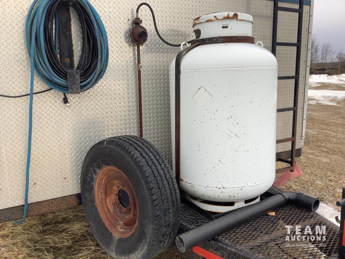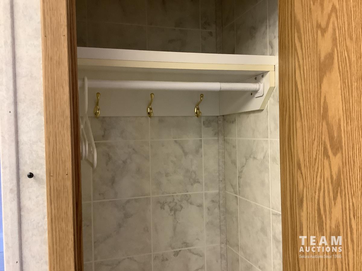 220 single Phase power, (2) Electric wall mount heaters, main large propane forced air furnace, AC, water storage tank, bed room with bunk beds, fridge, stove, microwave, coffee machine, central vac system, full bathroom with toilet, sink and shower, 8,000 lb axles with oil bath bearings, out door metal stairs, long electrical cord, air over hydraulic brakes, storage tool box, pintle hitch, 16 inch tires