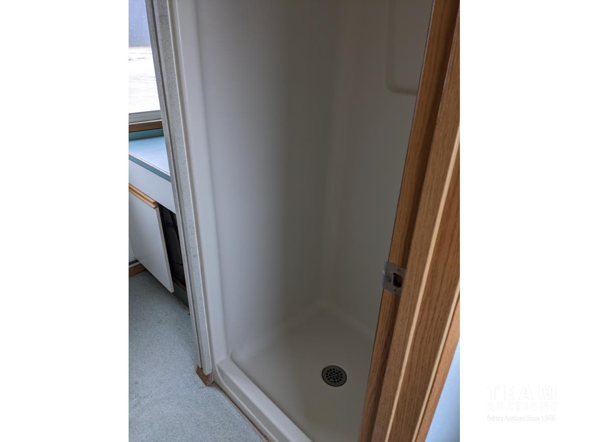 Kitchen with stove, microwave, bathroom with shower, toilet, sink, hot water, living area with couch, TV, furnace, bedroom, leveling jacks, propane pig, 7000 lb axles, pintle hitch, spring suspension, 235/85R16 tires
