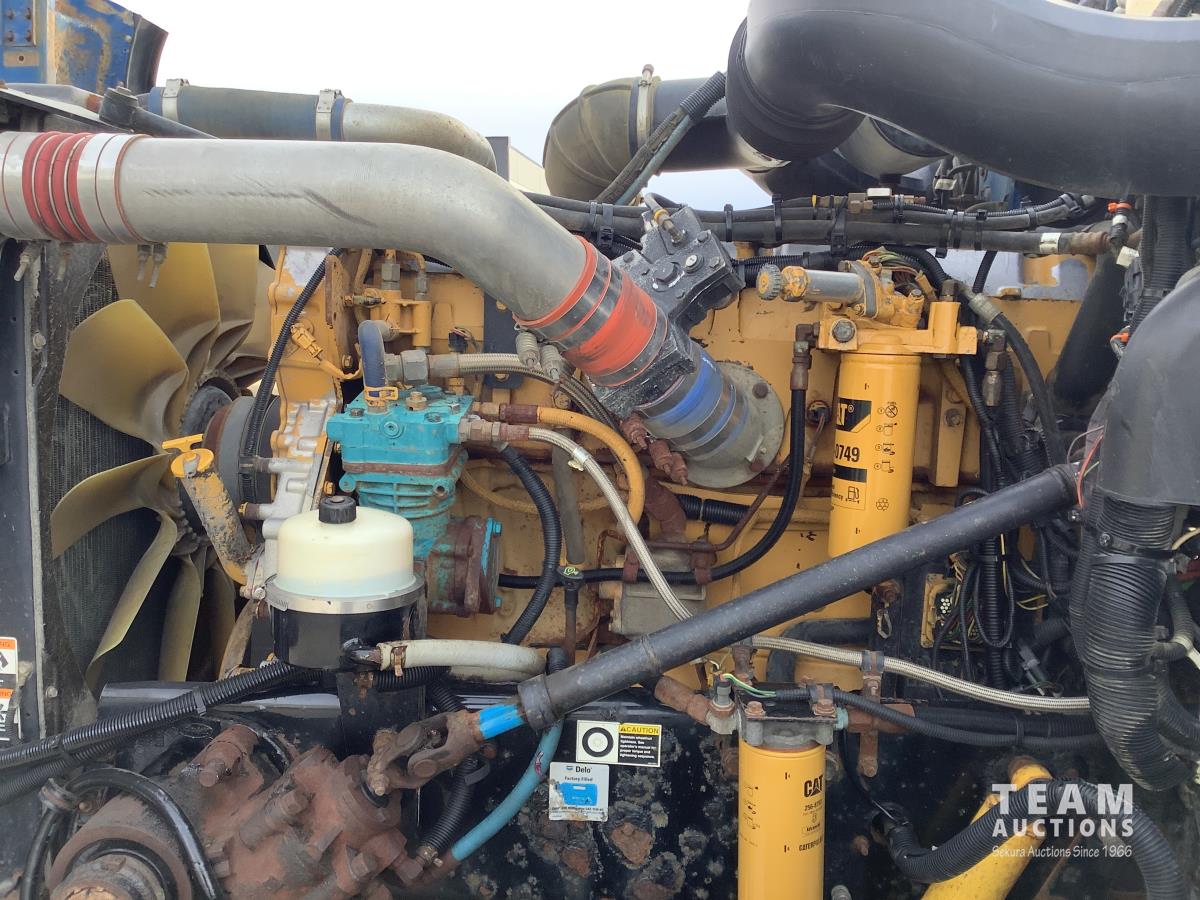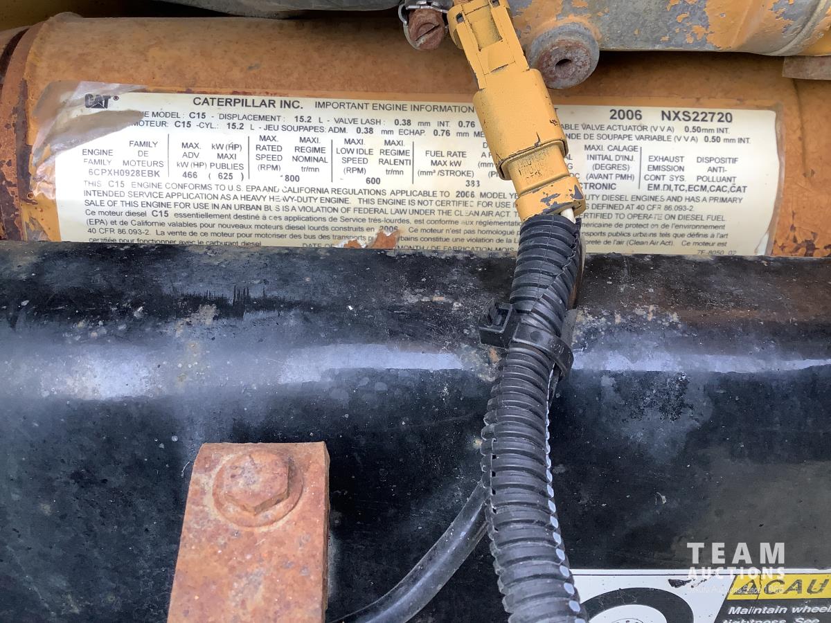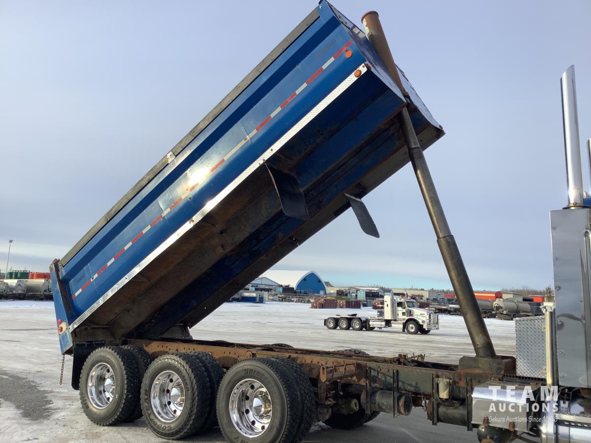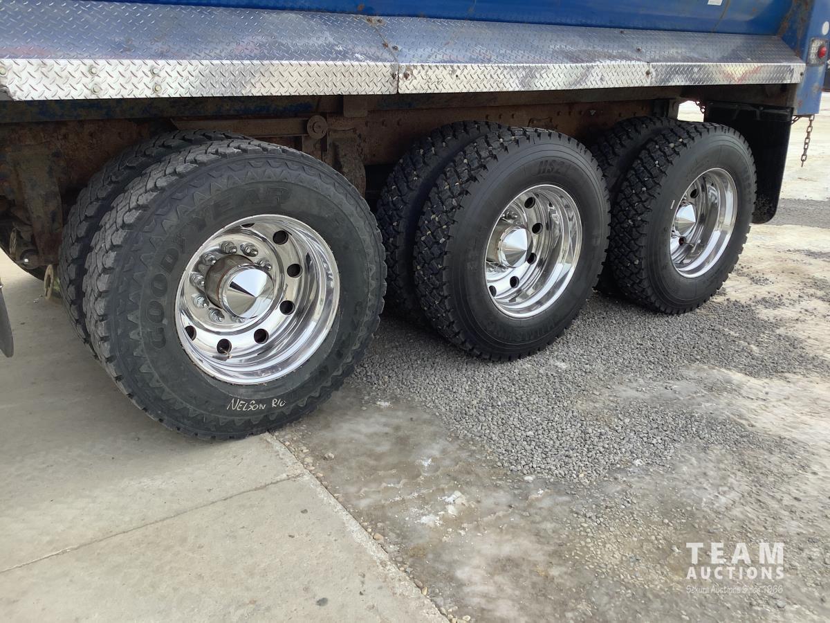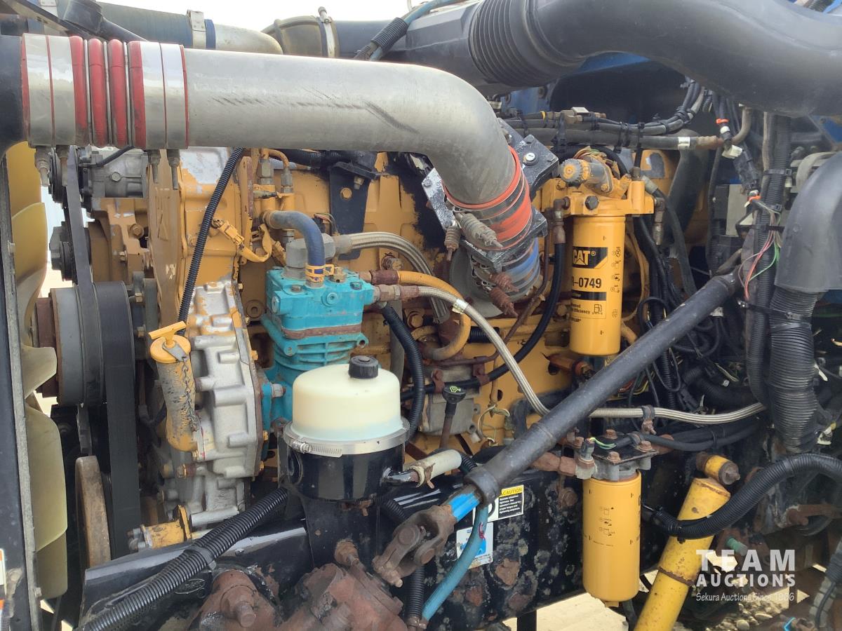 Caterpillar Pre Emission NXS22720 15.2 L 6 cylinder 500 HP diesel engine, engine brake, Fuller 18 speed manual transmission, air suspension, 20,000 lb front axle, full lockers, Roda air shut off, front tow hook, rear tool box, Midland 20 ft gravel box with sealed tail gate, rear hitch, all aluminum wheels, 445/65R22 front tires, 11R24.5 rear tires
