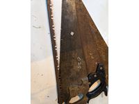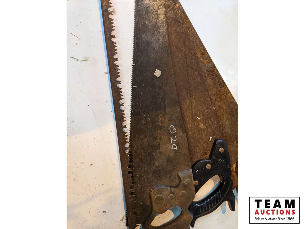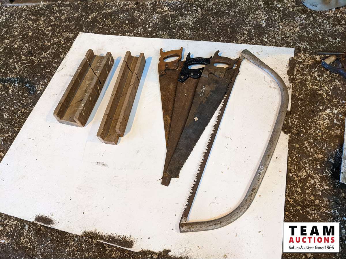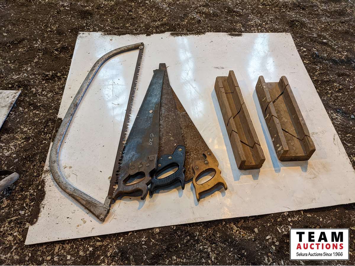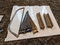 (3) hand saws, (1) swede saw, (2) wooden mitre boxes