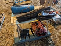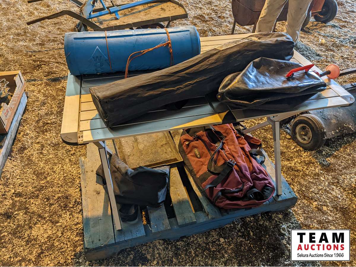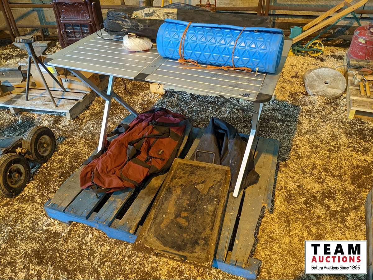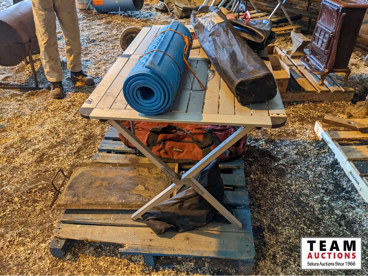Folding table, custom made griddle, shower bag, duffle bag, camp chair, foam