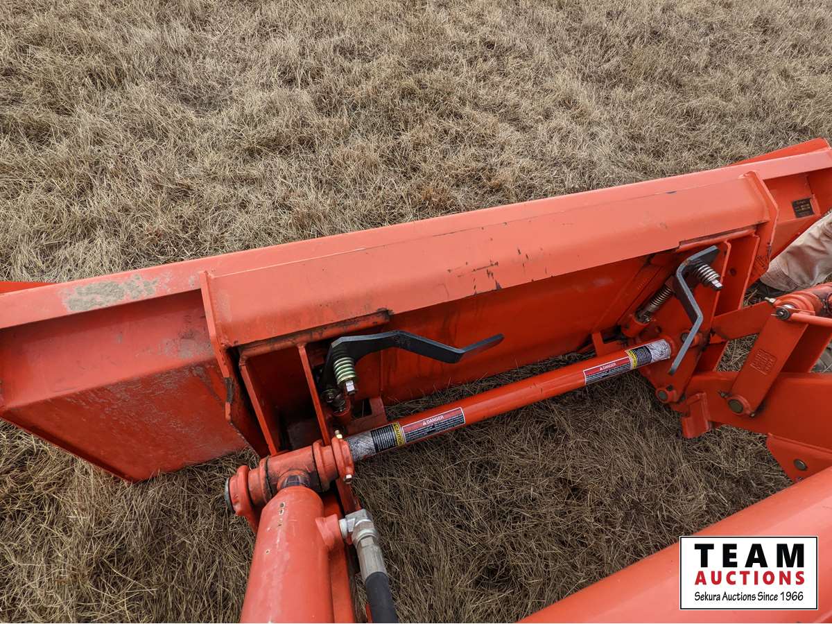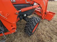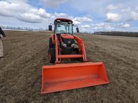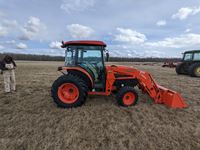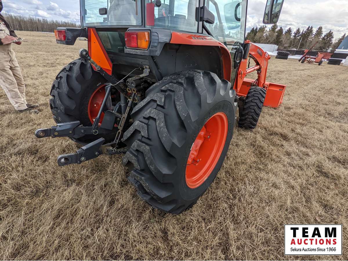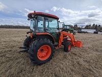 Kubota LA854 loader, skid steer Q/A 6 ft bucket, joystick, joystick, s peed hydro transmission, dual entry cab, heat, AC, radio, 3 PT hitch, 540 PTO, (2) rear hydraulic outlets, 10-16.5 front, 17.5-24 rear tires