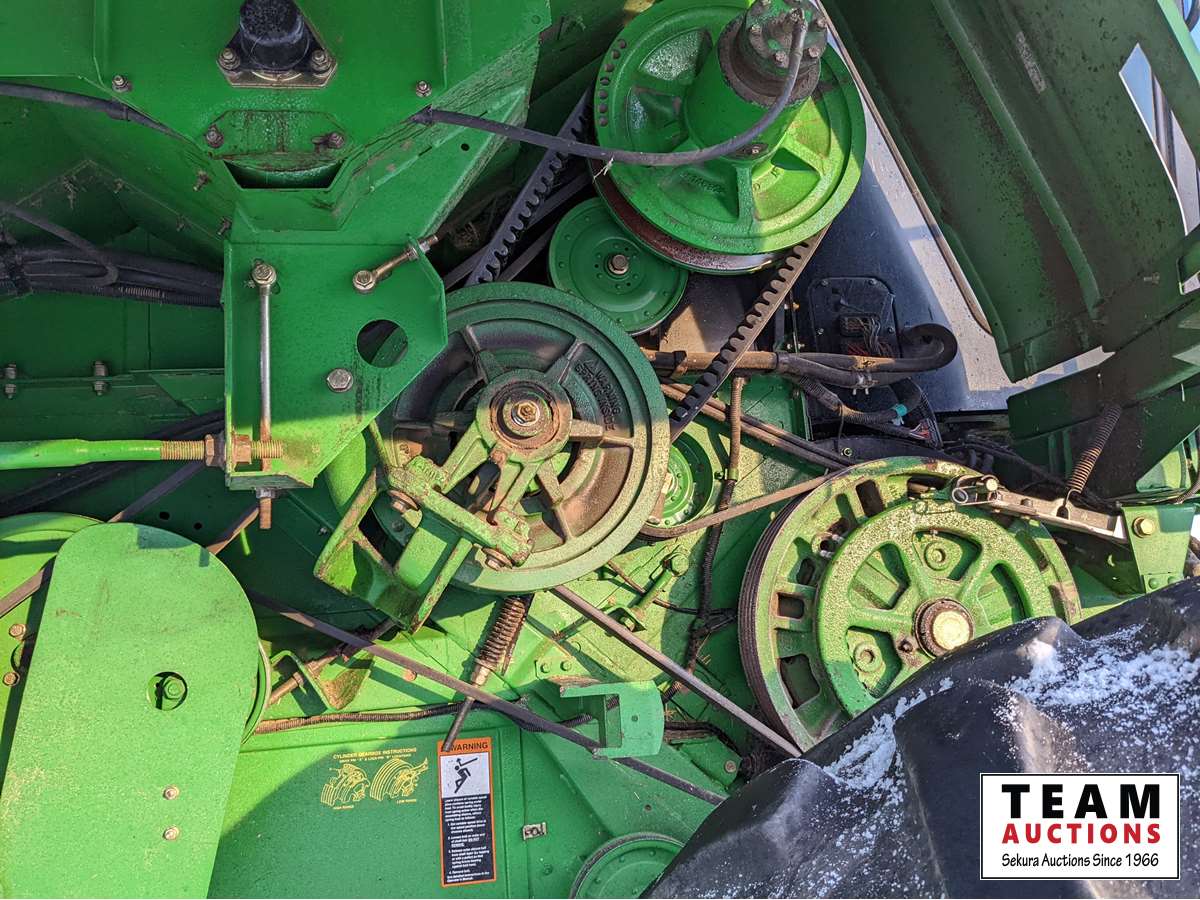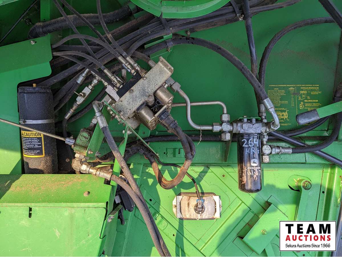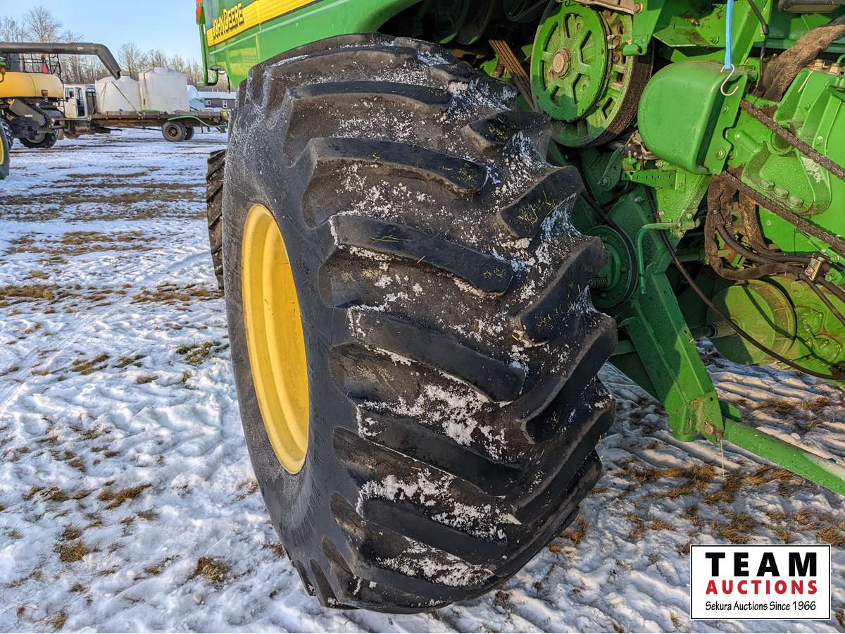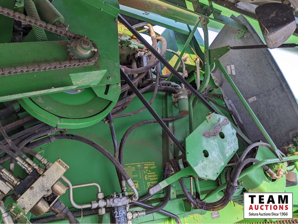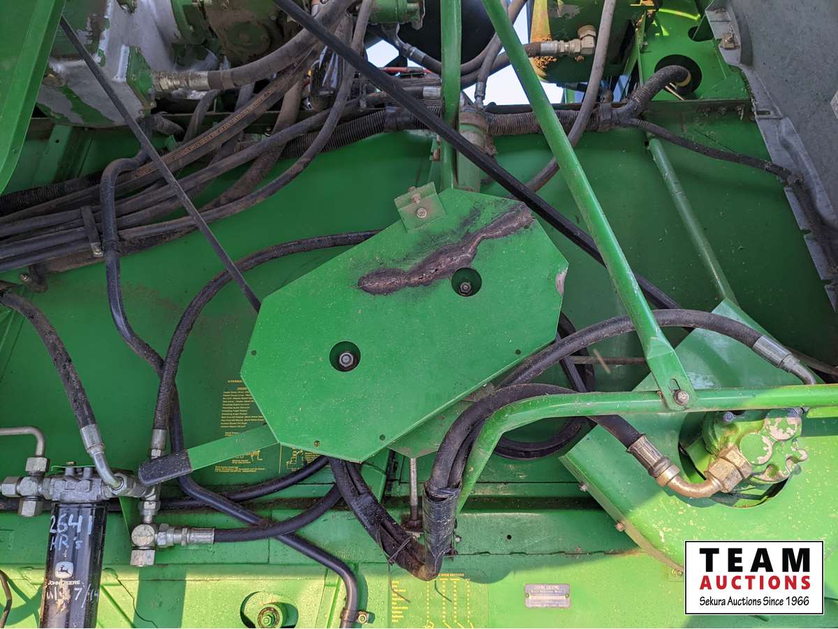 John Deere 914 pickup header, variable speed reel, rock trap, yield moisture monitor, chaff spreader, chopper, 20 ft unload auger, 30.5 L -32 front, 14.9-24 rear, separator hrs 2597