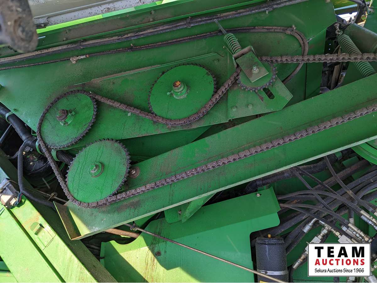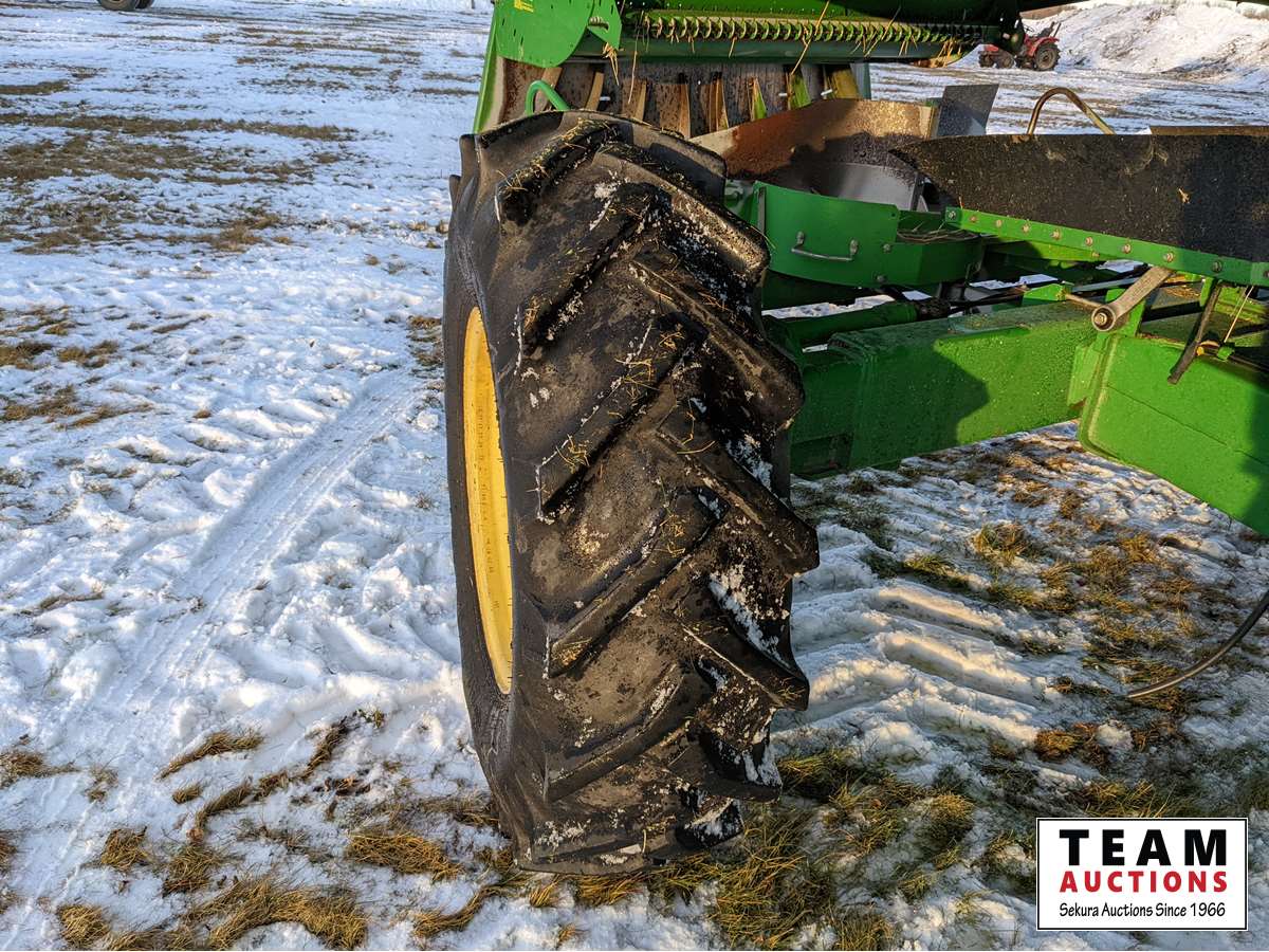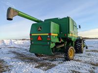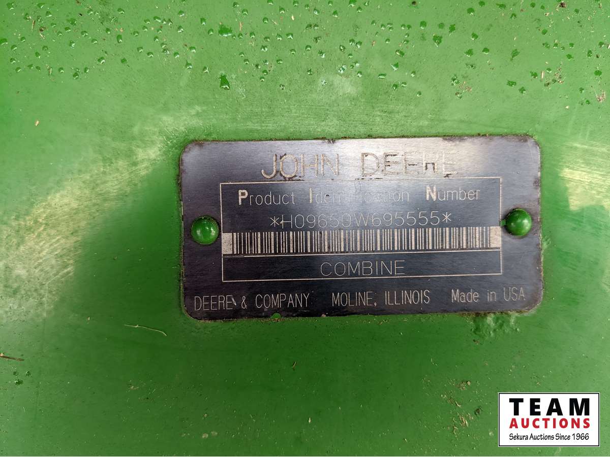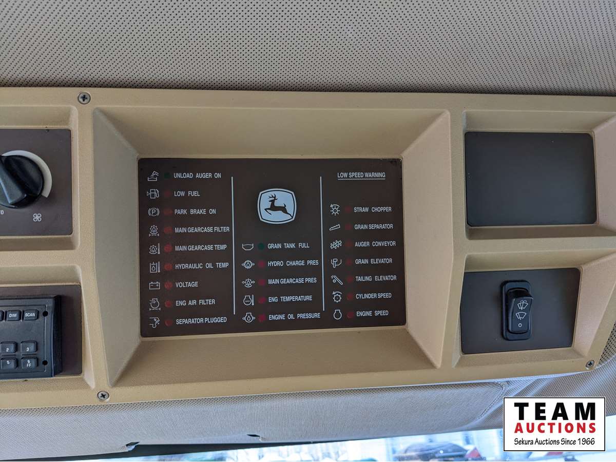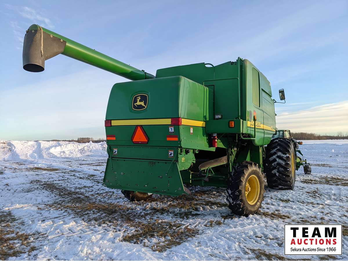 John Deere 914 pickup header, variable speed reel, rock trap, yield moisture monitor, chaff spreader, chopper, 20 ft unload auger, 30.5 L -32 front, 14.9-24 rear, separator hrs 2597