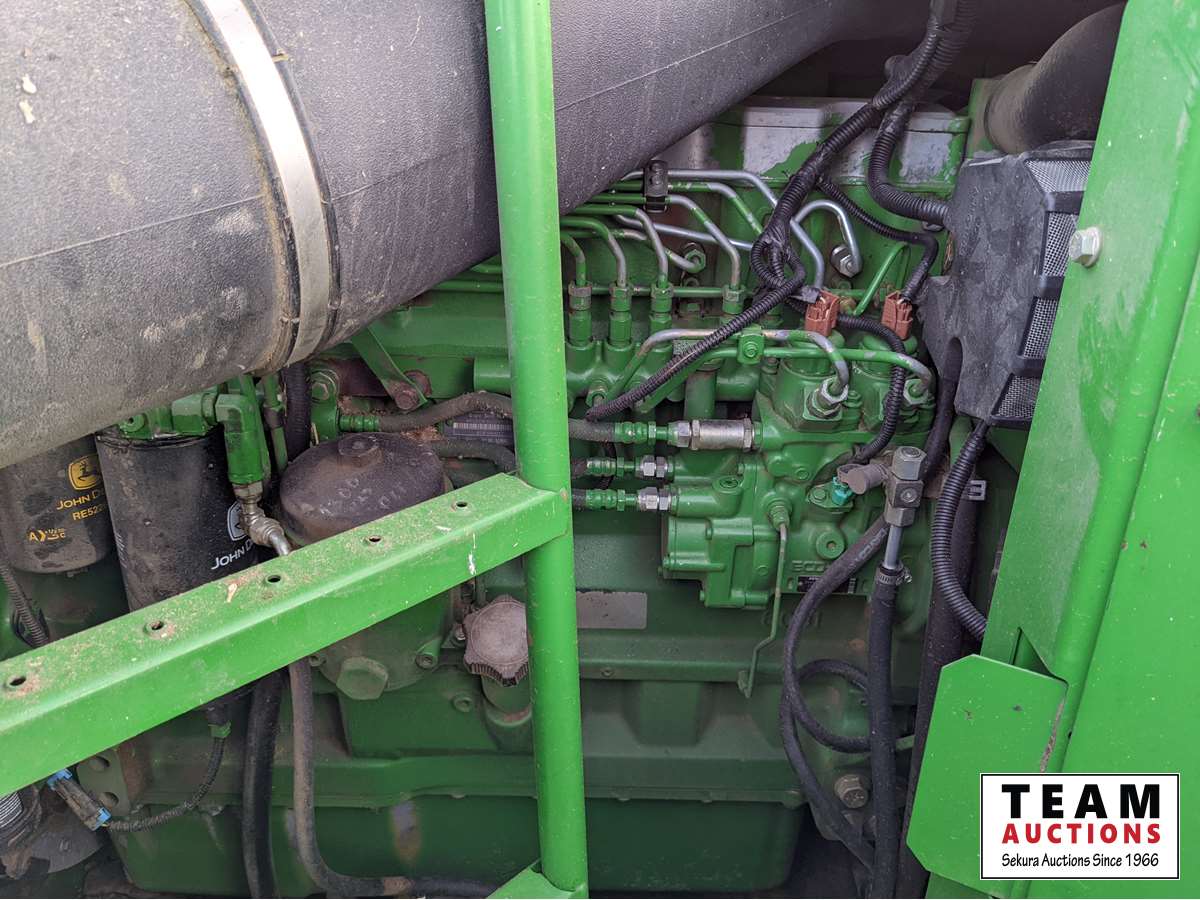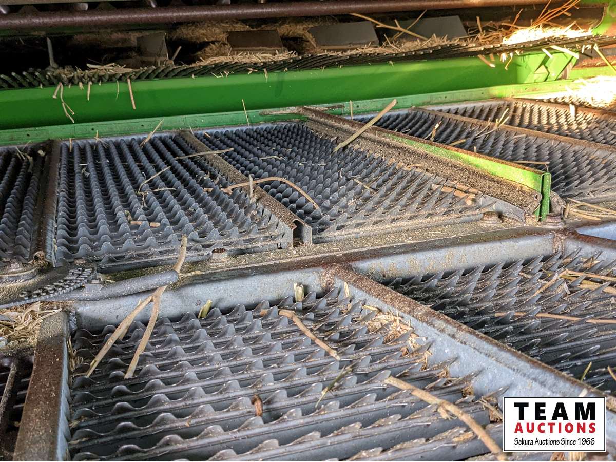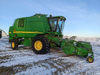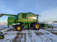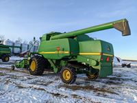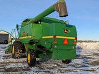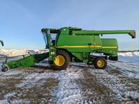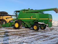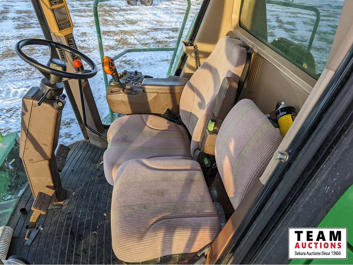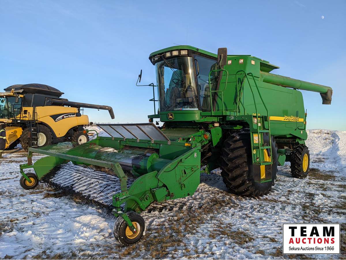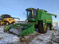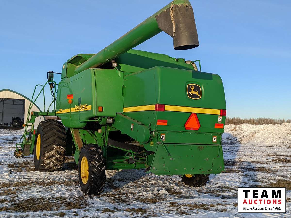 John Deere 914 pickup header, variable speed reel, rock trap, yield moisture monitor, chaff spreader, chopper, 20 ft unload auger, 30.5 L -32 front, 14.9-24 rear, separator hrs 2597
