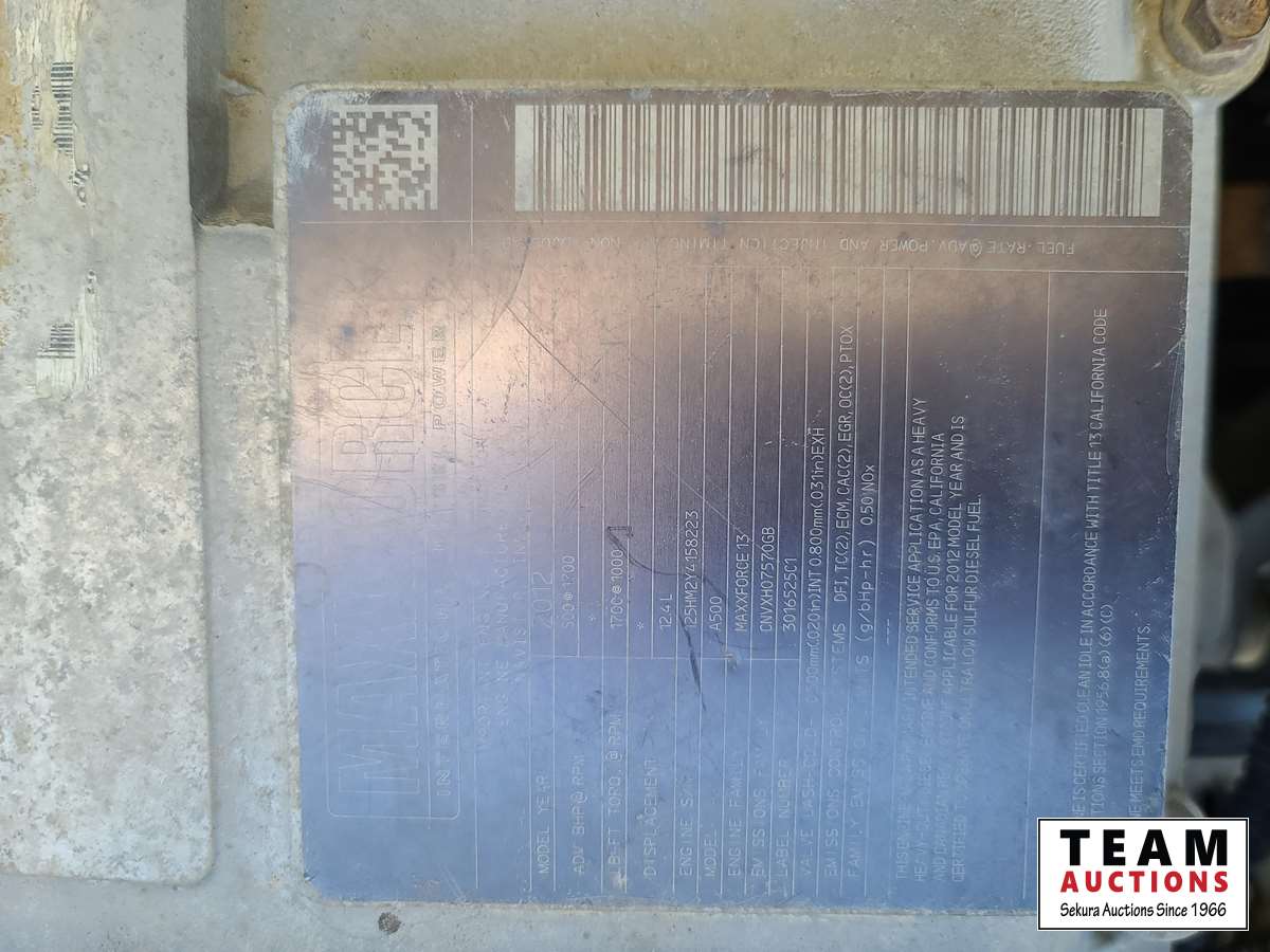 Maxxforce 13 500 HP engine, Eaton Fuller 18 speed transmission, air ride suspension, 13,220 lb front axle, 46,000 rear axle, locking differential, sliding 5th wheel, double acting hydraulic drive pump, front Rue bar, aluminum rims, fridge, storage cabinets, 11R24.5
