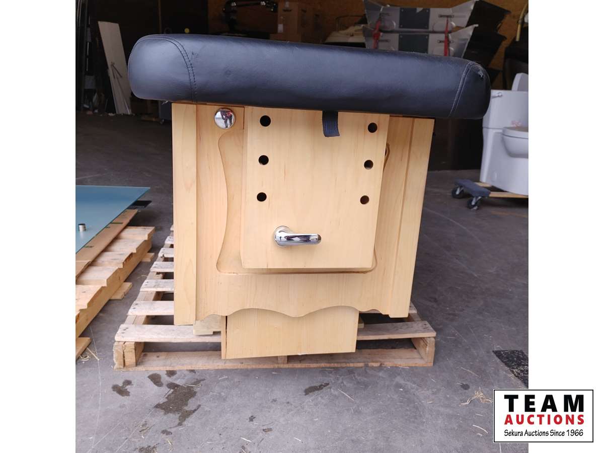 Tilt up headrest, foot bath, storage cabinets below.