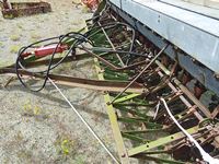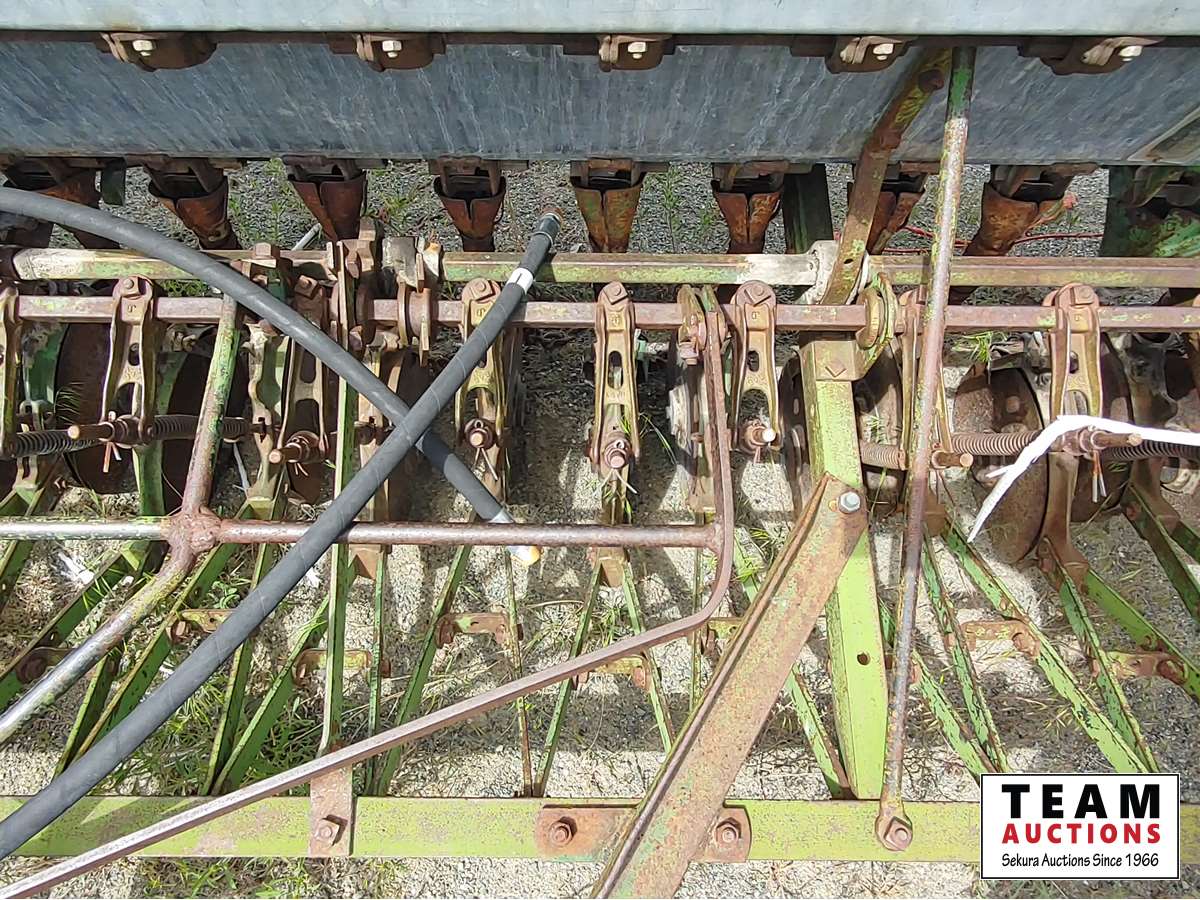 End run grain drill. Grass seed box, 24 run with 6 inch spacing and double disc openers. Grass seed box, double grain box.