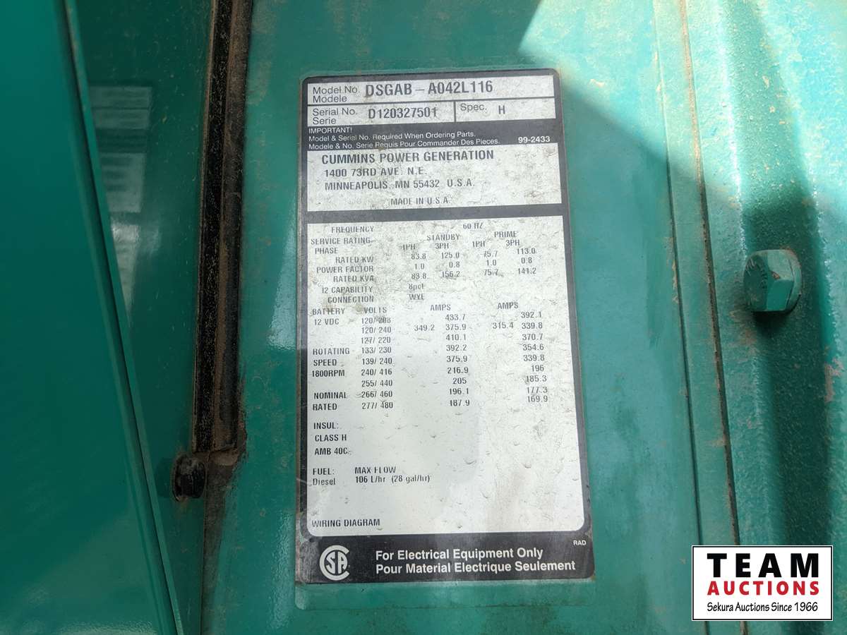 203 2012 Cummins DSGAB-A042L116 125 kW T/A Generator Trailer