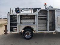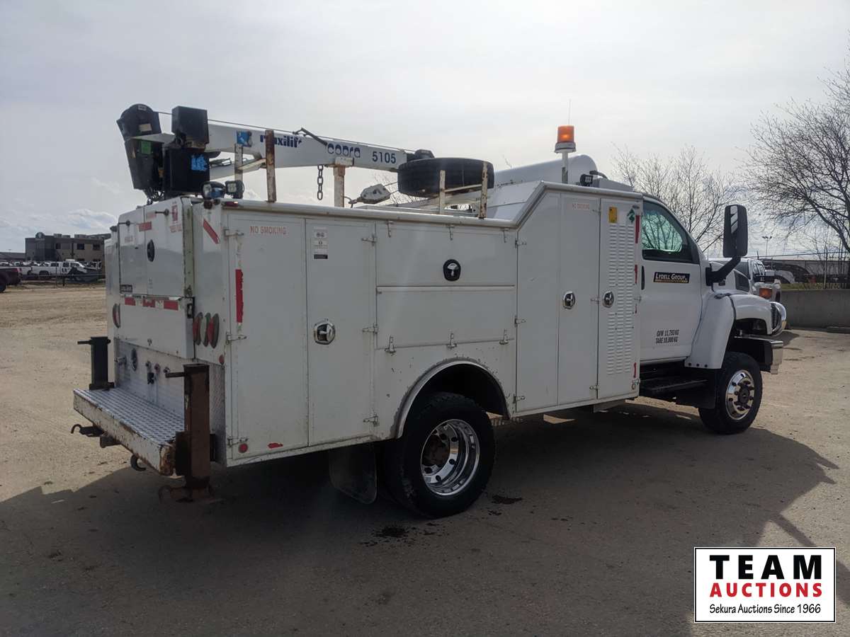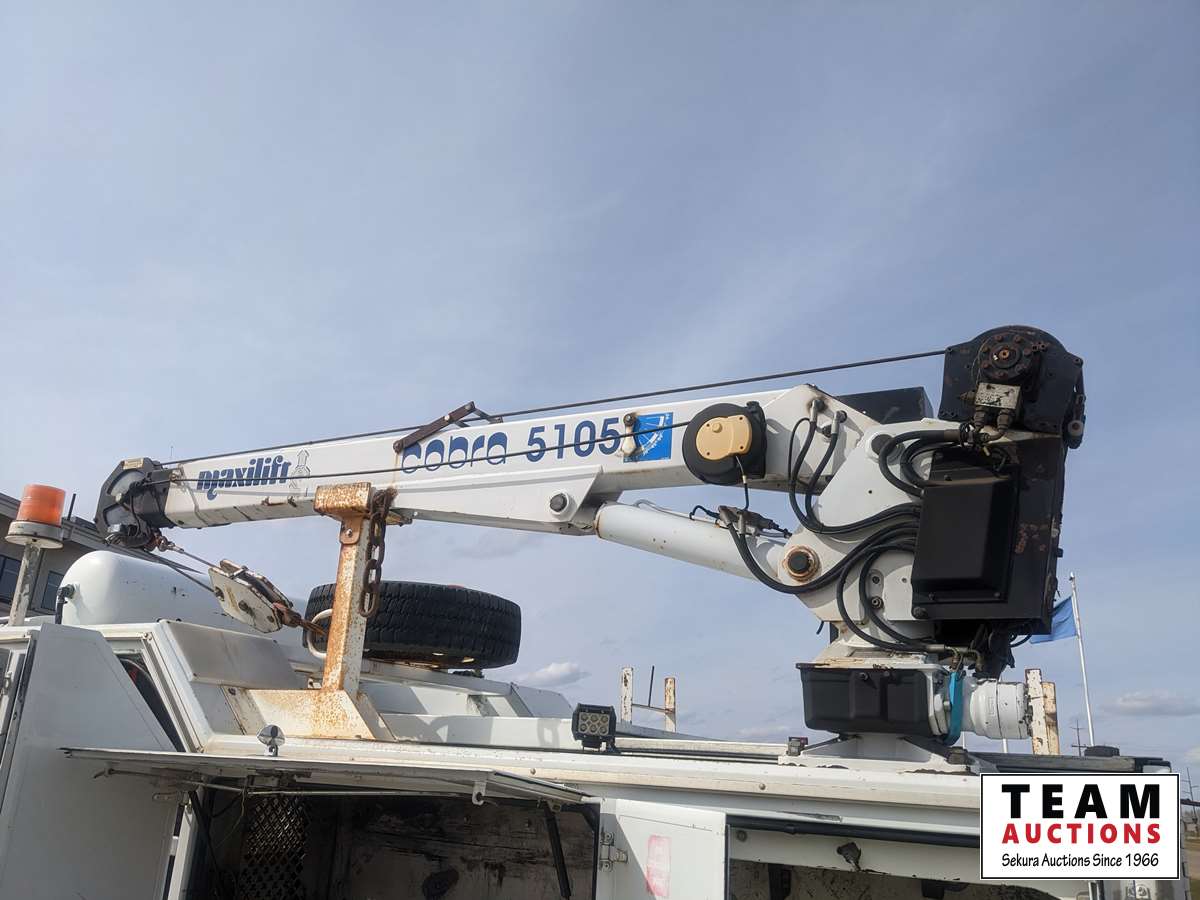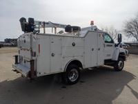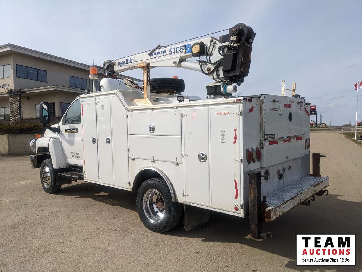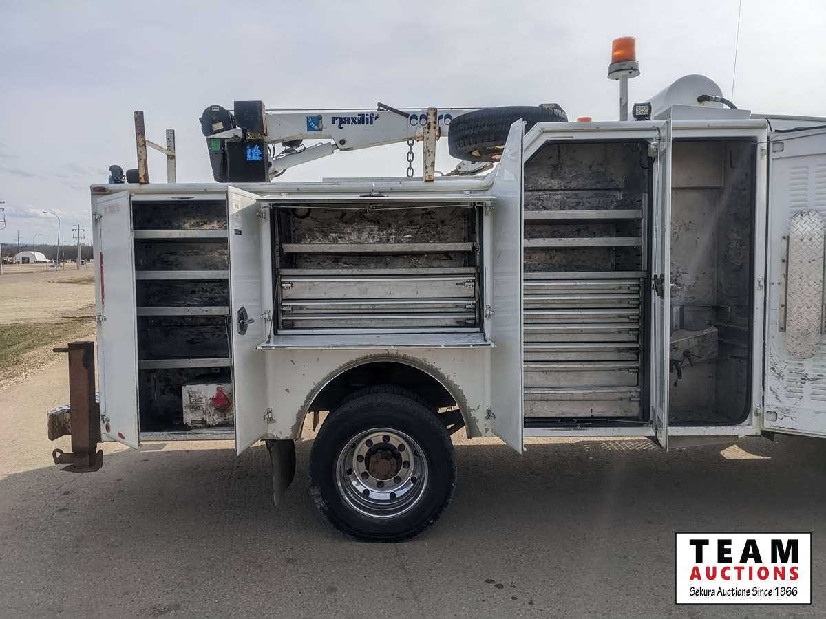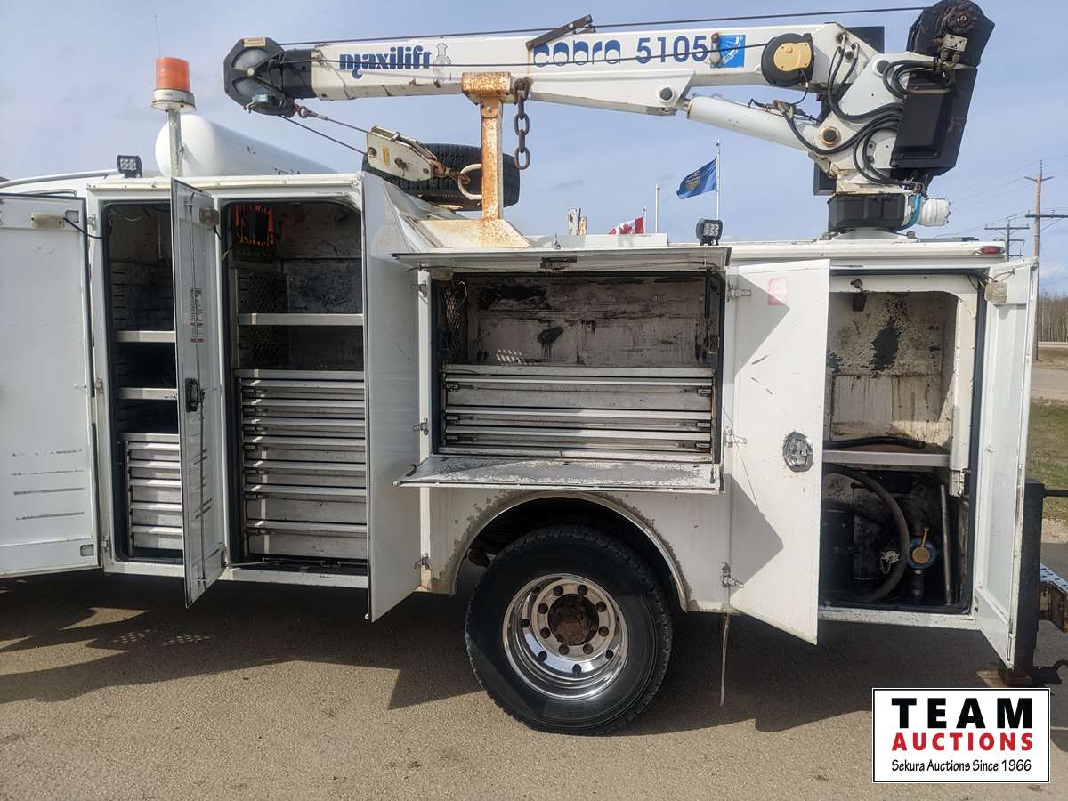 Duramax, 6.6 L, V8, diesel, automatic transmission, 2008 Milron 18343 12 ft service body, 2007 Maxilift Cobra 5105KPE12 crane, s/n 13427, remote control, Vmac air compressor, air storage tank, waste oil recovery system, aluminum front bumper, 245/70R19.5