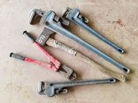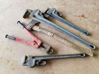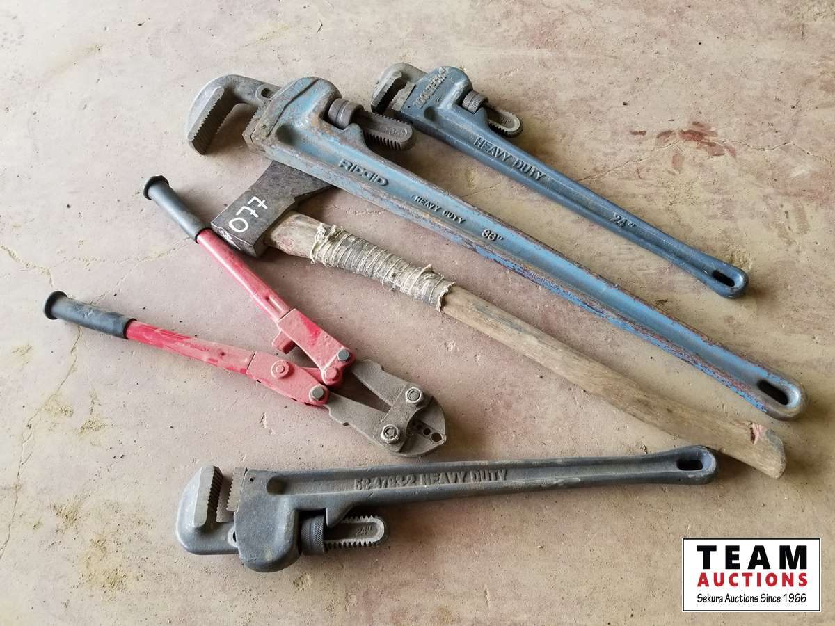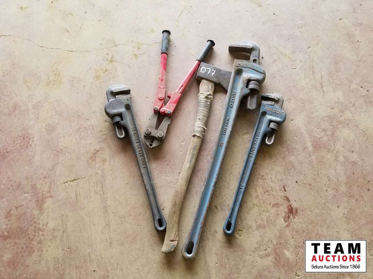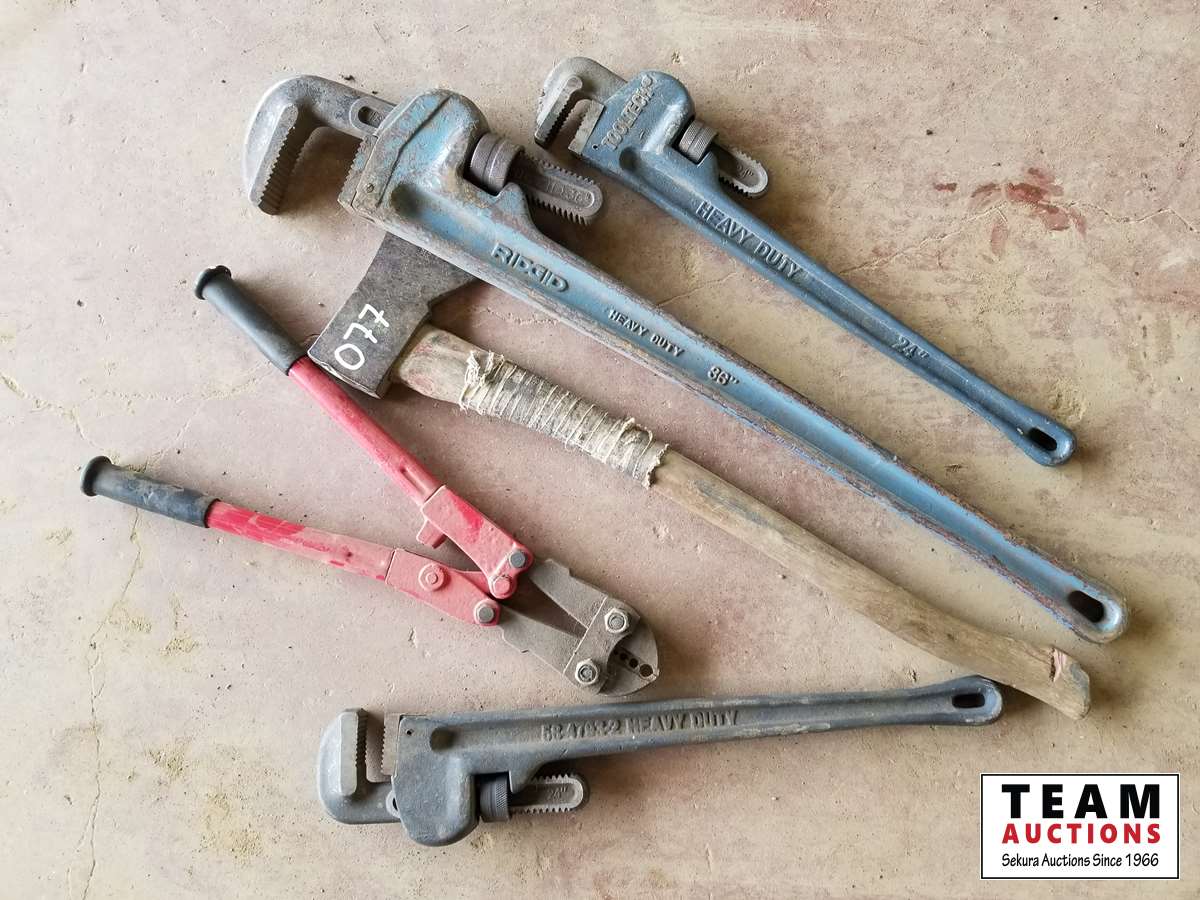 Large pipe wrenches, bolt cutter, axe