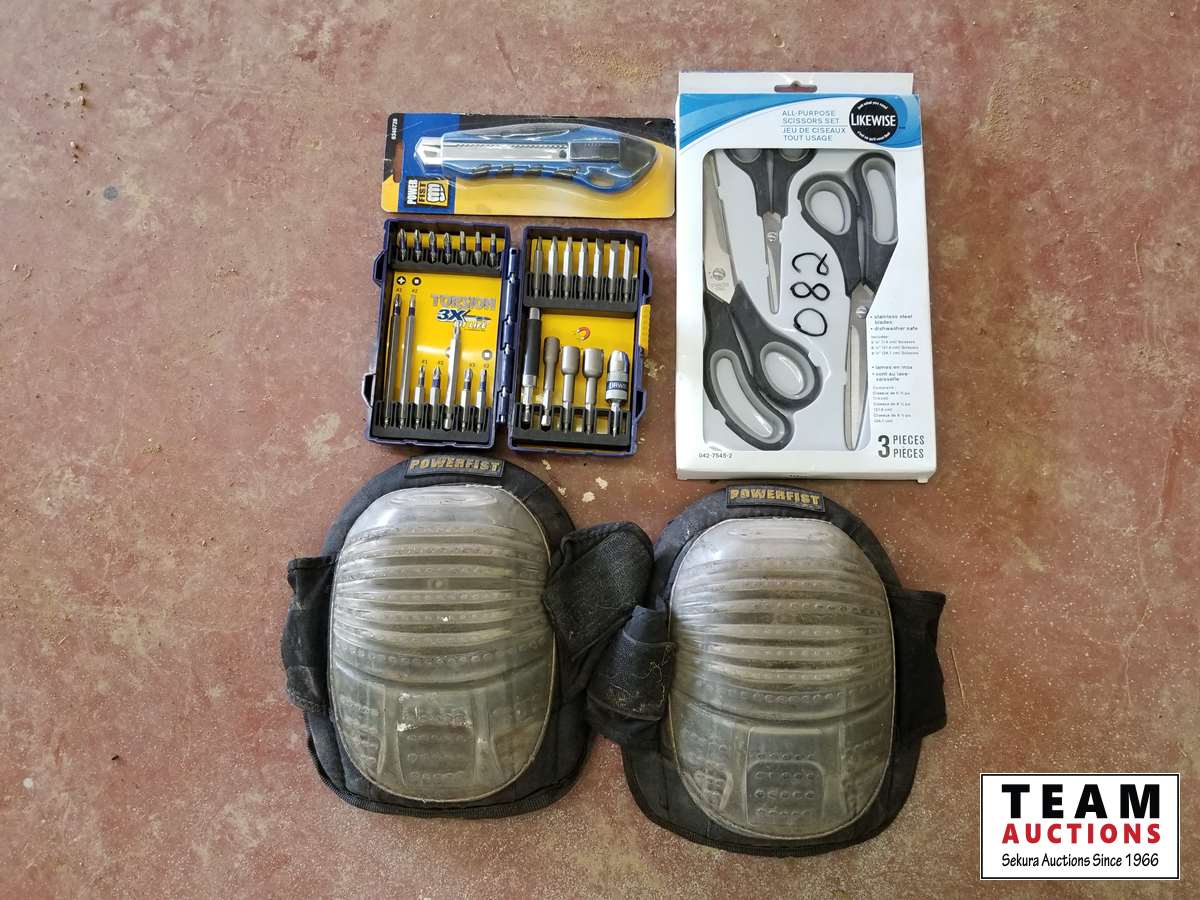 Knee pads, scissors, bits