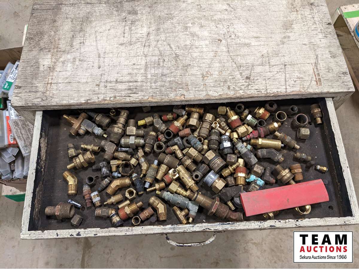 (1) box of 5/8 inch fine thread unused taps, various cam locks, various fittings, wire, miscellaneous
