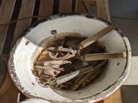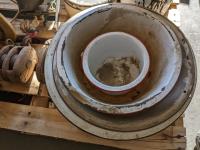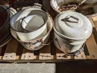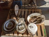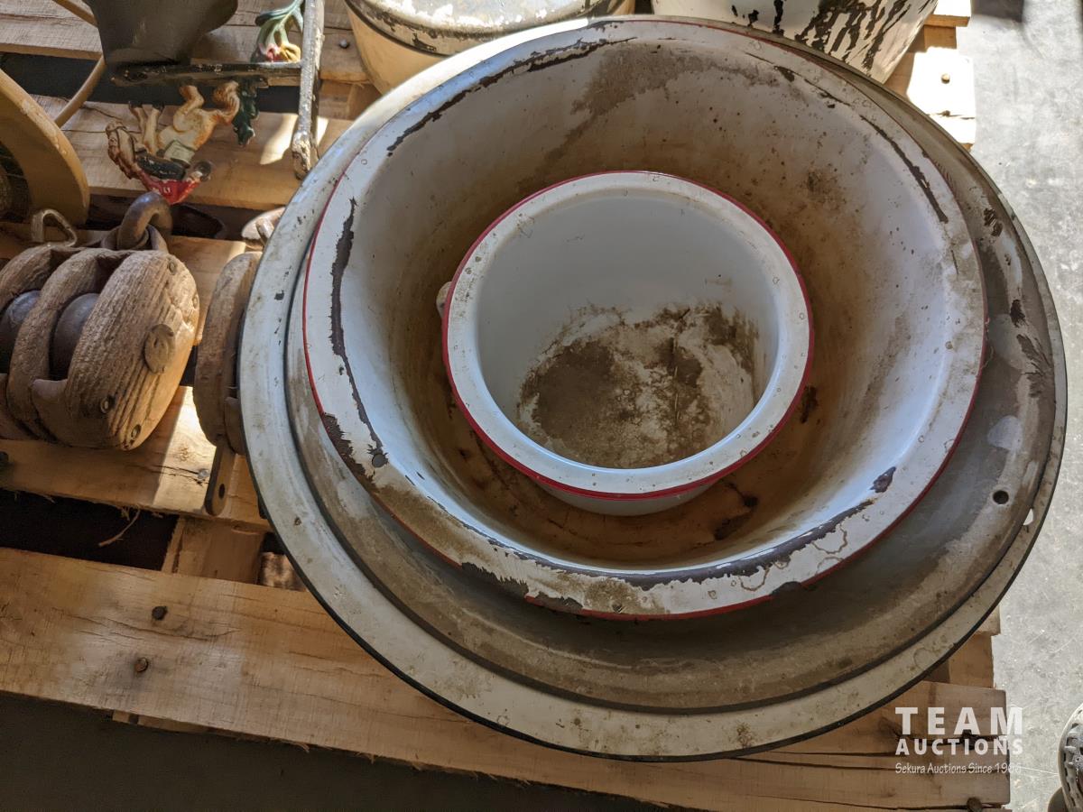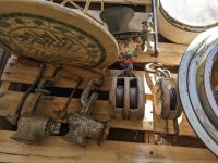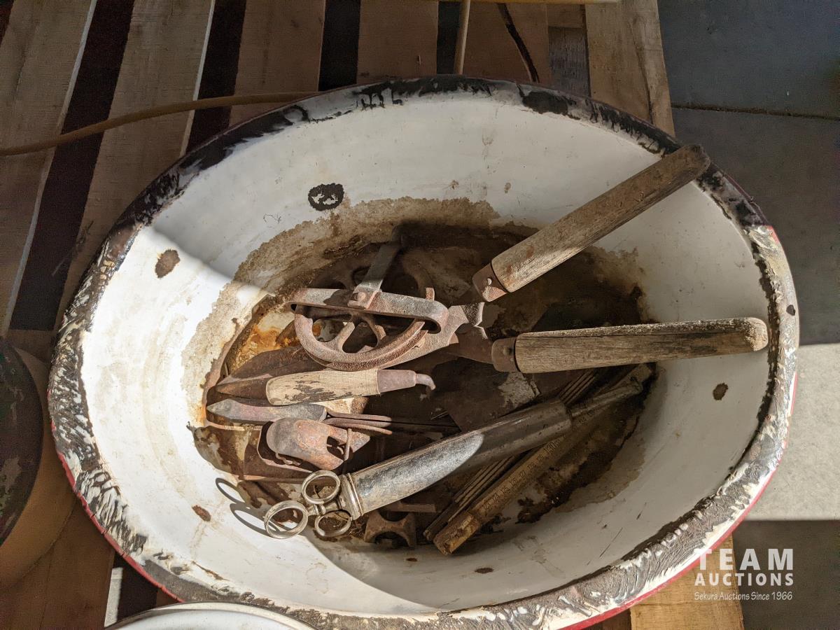 Wash basins, cooking pots, bell, snatch blocks, clamp, syringe, meat grinders, hedge trimmers, end table