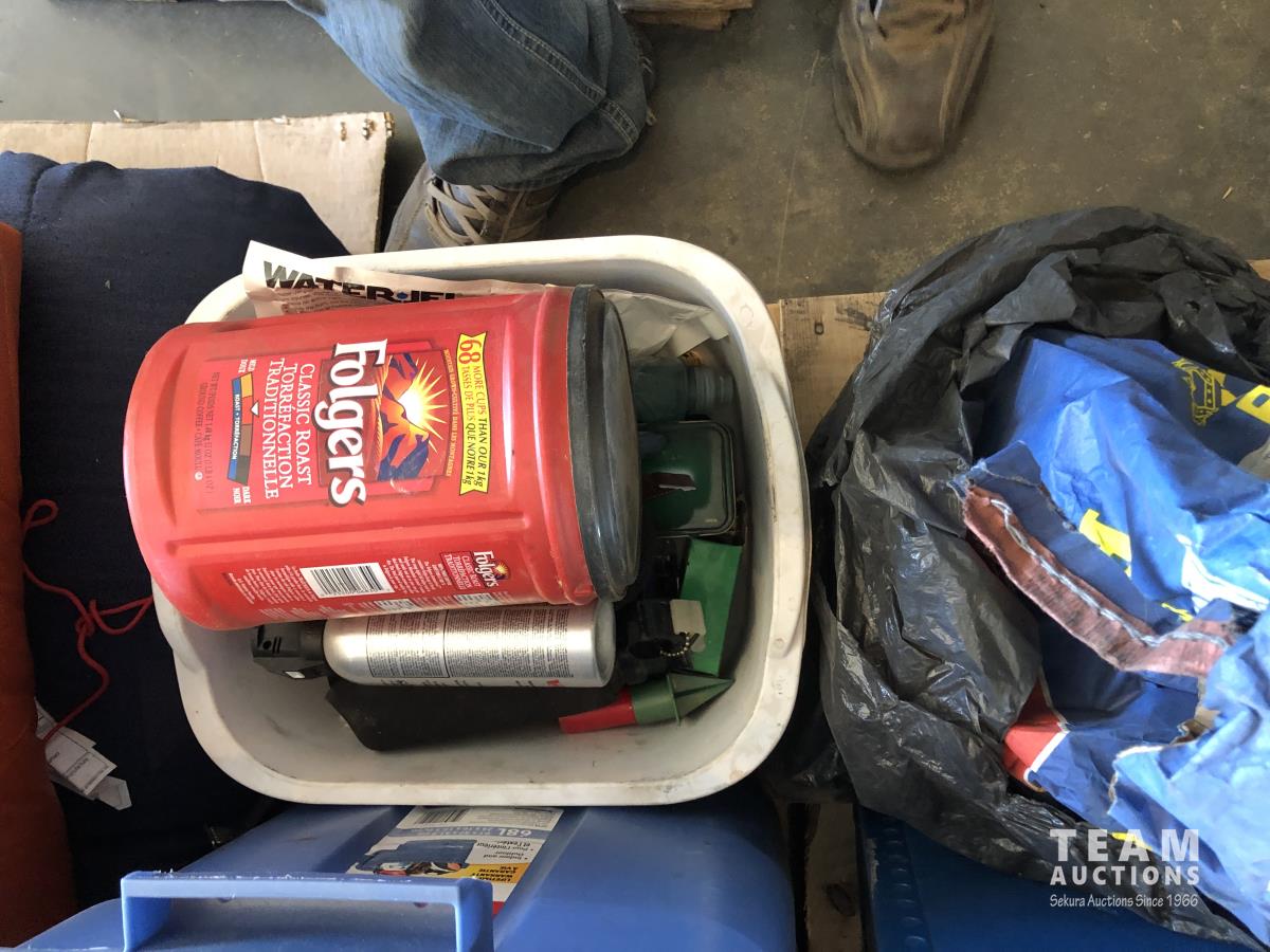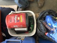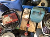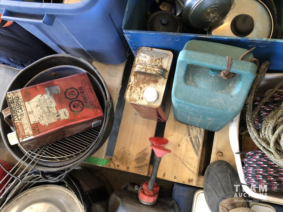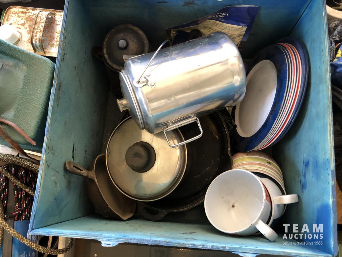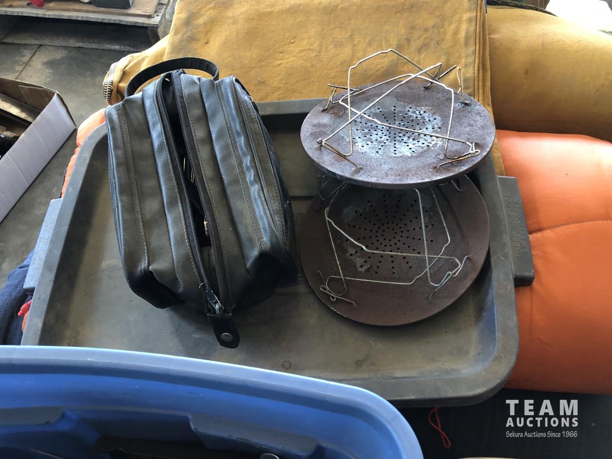 tent pegs, rope, cooking pots, pans, frying pans, bowls, scales, plates, cutlery, glasses, (2) portable showers, (2) dish pans, (3) cans bear spray, candles, fire starter, campfire toaster, propane heater, gas camp stove, gas camp lantern, fold out table in bag