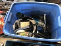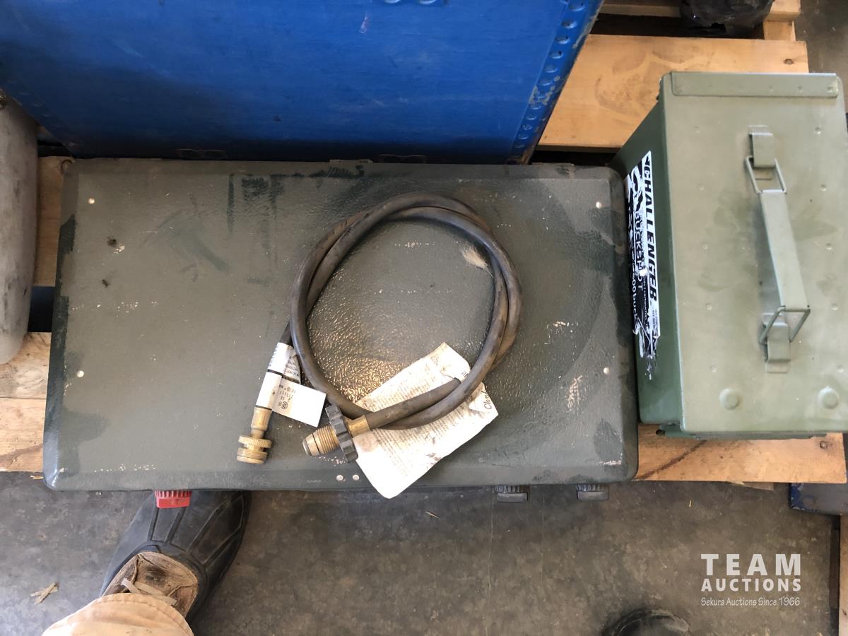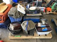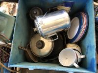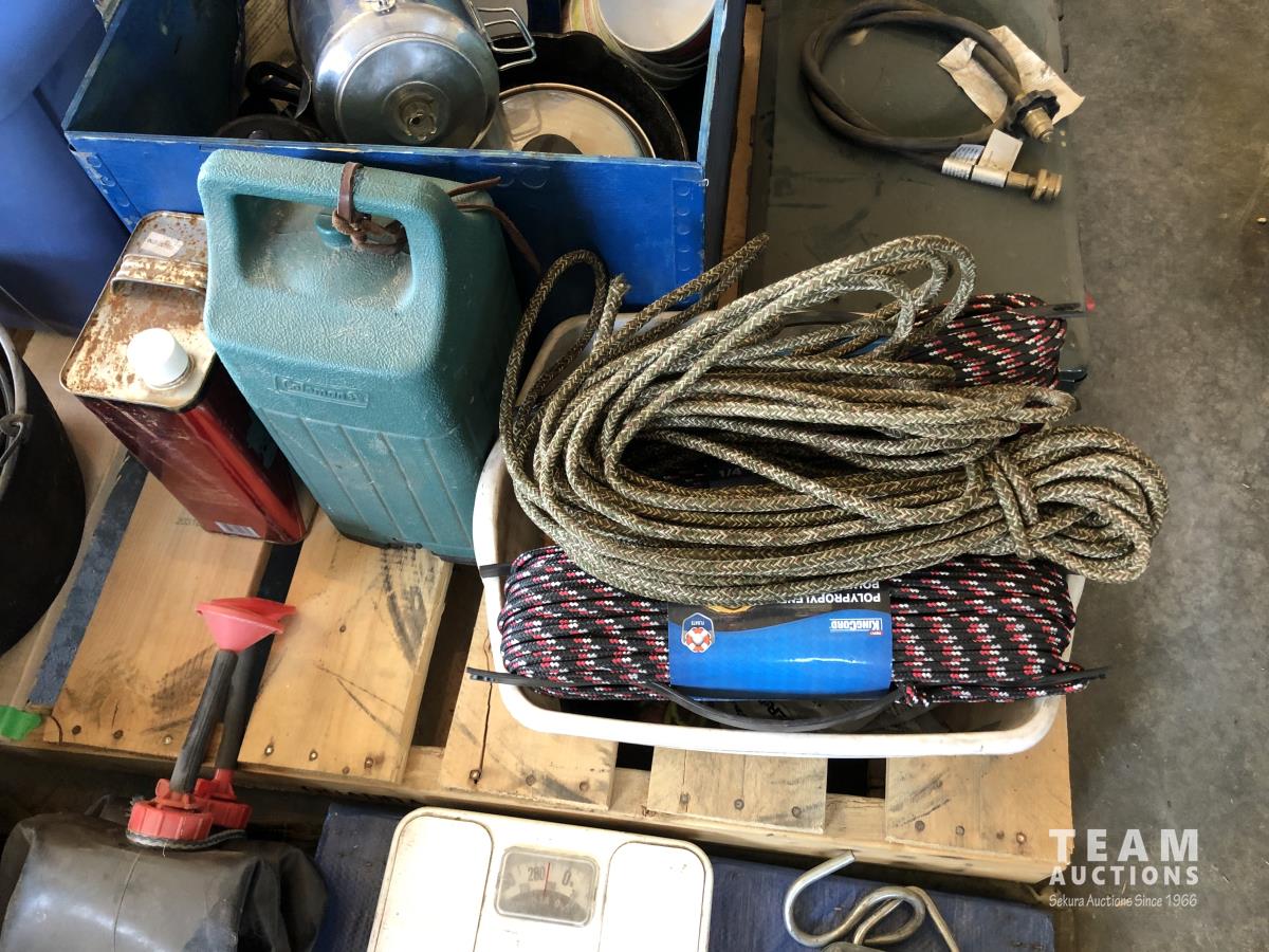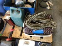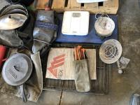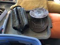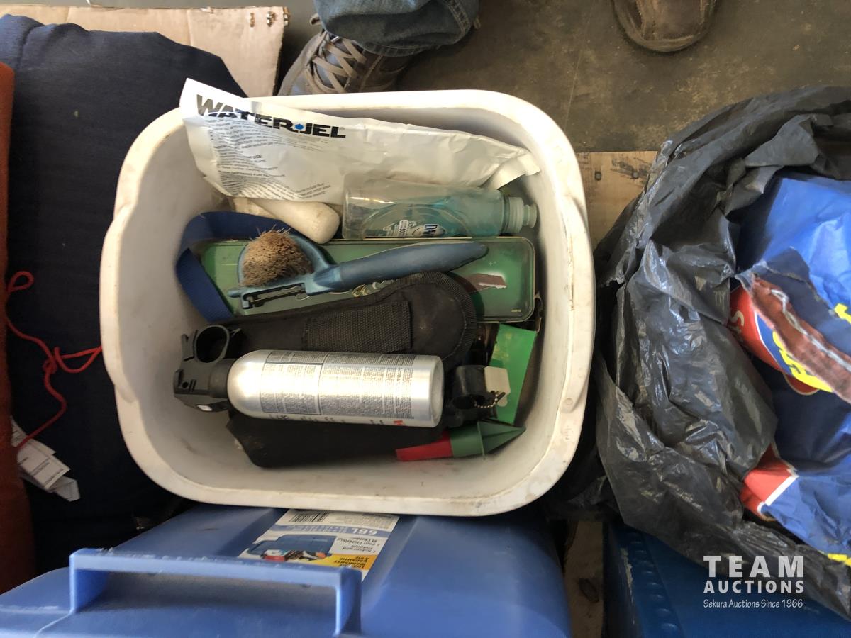 tent pegs, rope, cooking pots, pans, frying pans, bowls, scales, plates, cutlery, glasses, (2) portable showers, (2) dish pans, (3) cans bear spray, candles, fire starter, campfire toaster, propane heater, gas camp stove, gas camp lantern, fold out table in bag