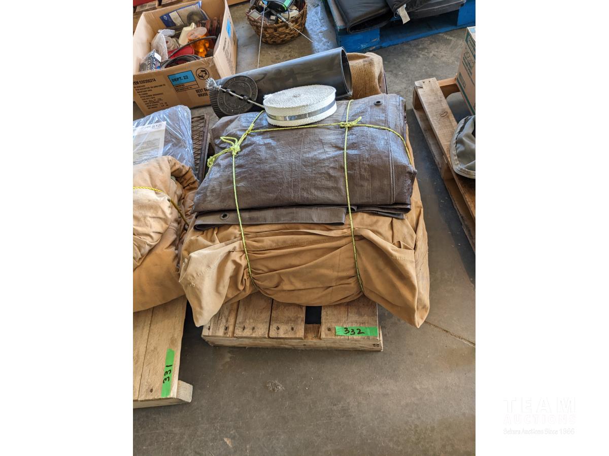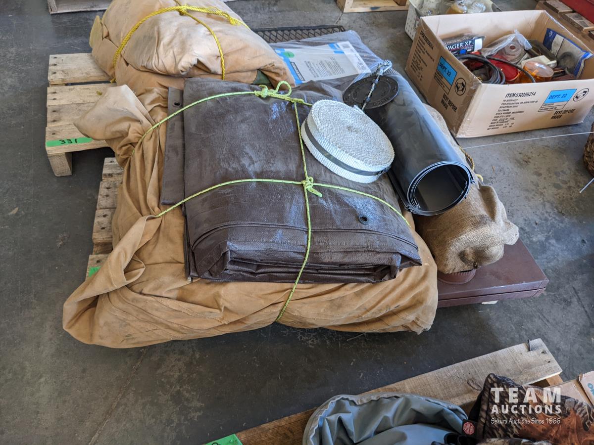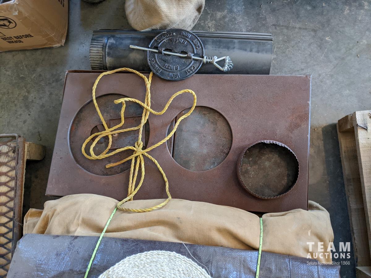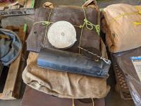 10 ft X 12 ft wall tent, 16 ft X 20 ft trap, collapsible wood stove, telescopic stove pipe, nylon webbing, (6) new stove pipes and dampener