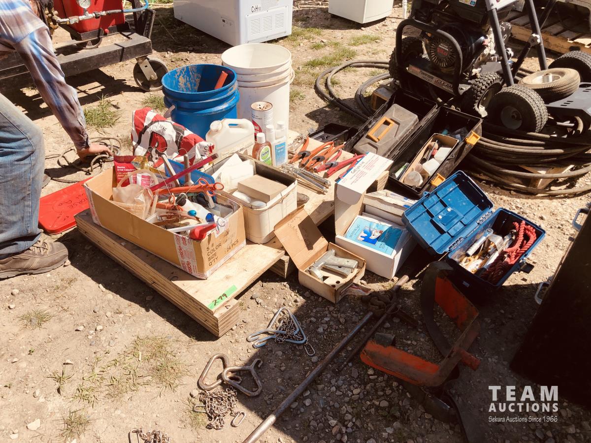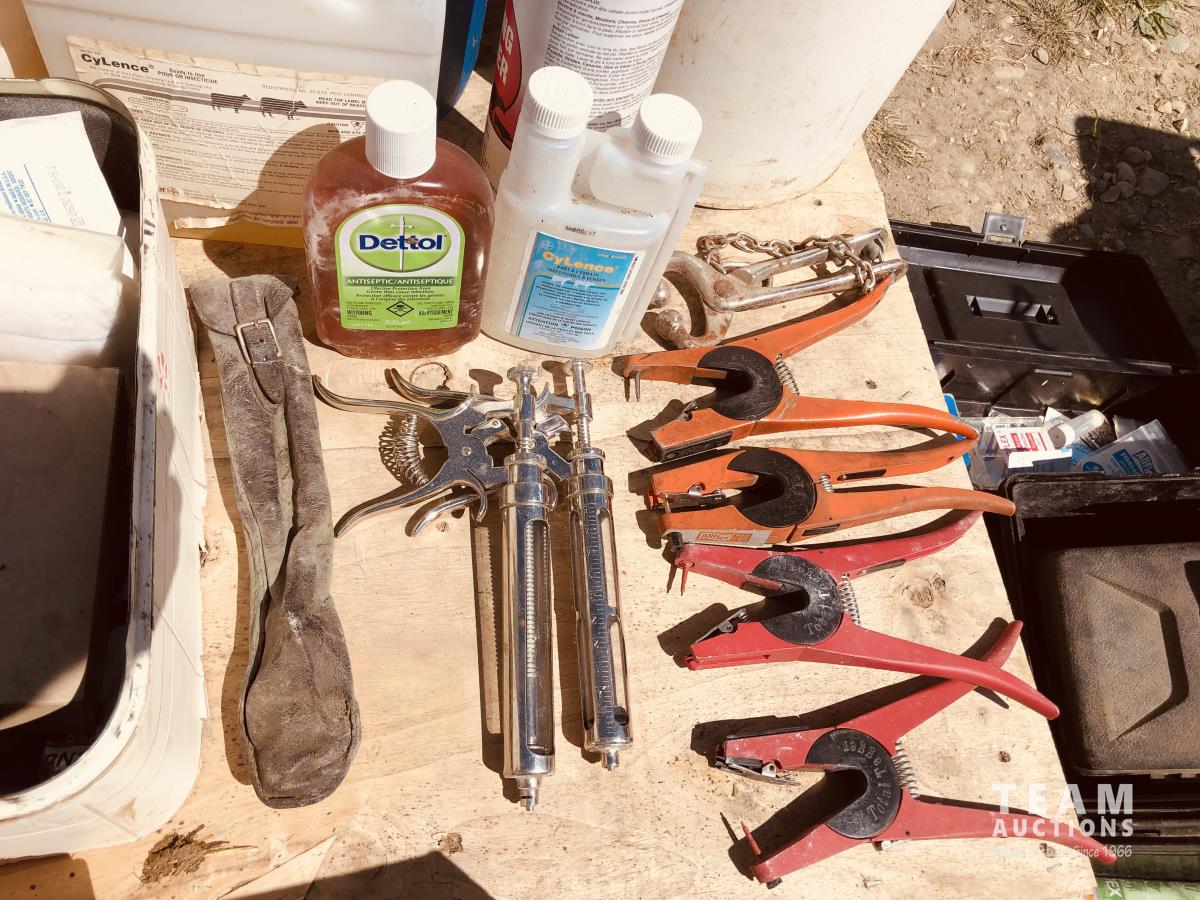 calf puller, taggers, syringes, needles, horse first aid kit, miscellaneous
