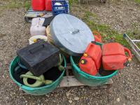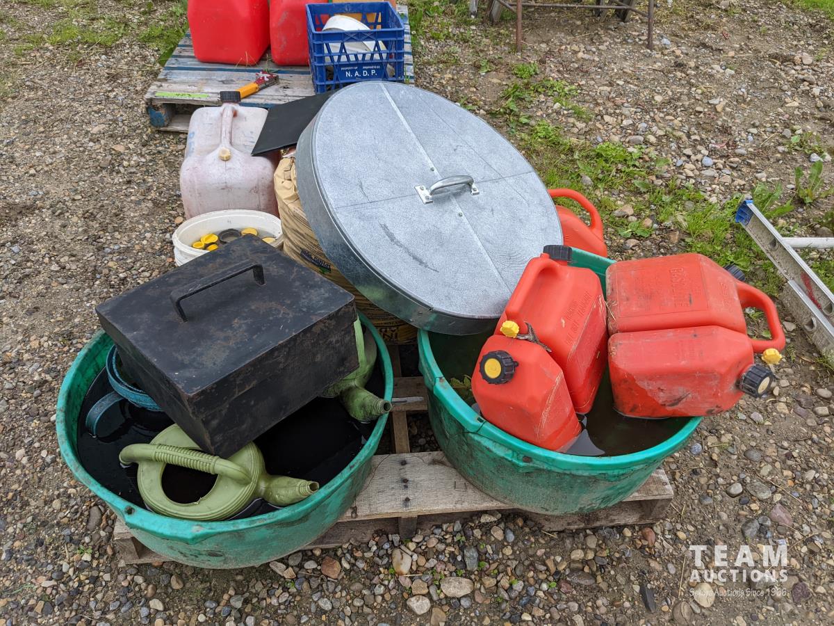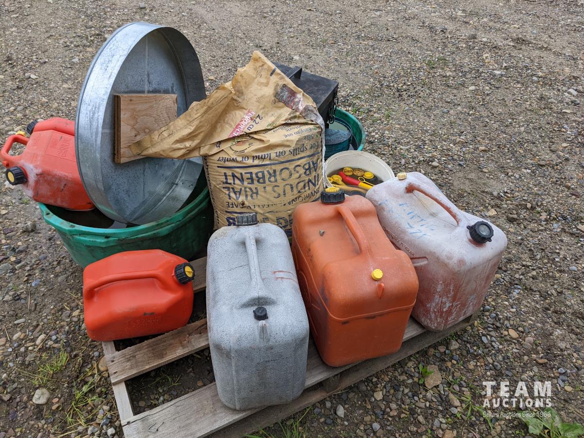 Sphag Sorb absorbent, oil drain pans, qty of Jerry cans, funnels, oil jugs, mineral tubs