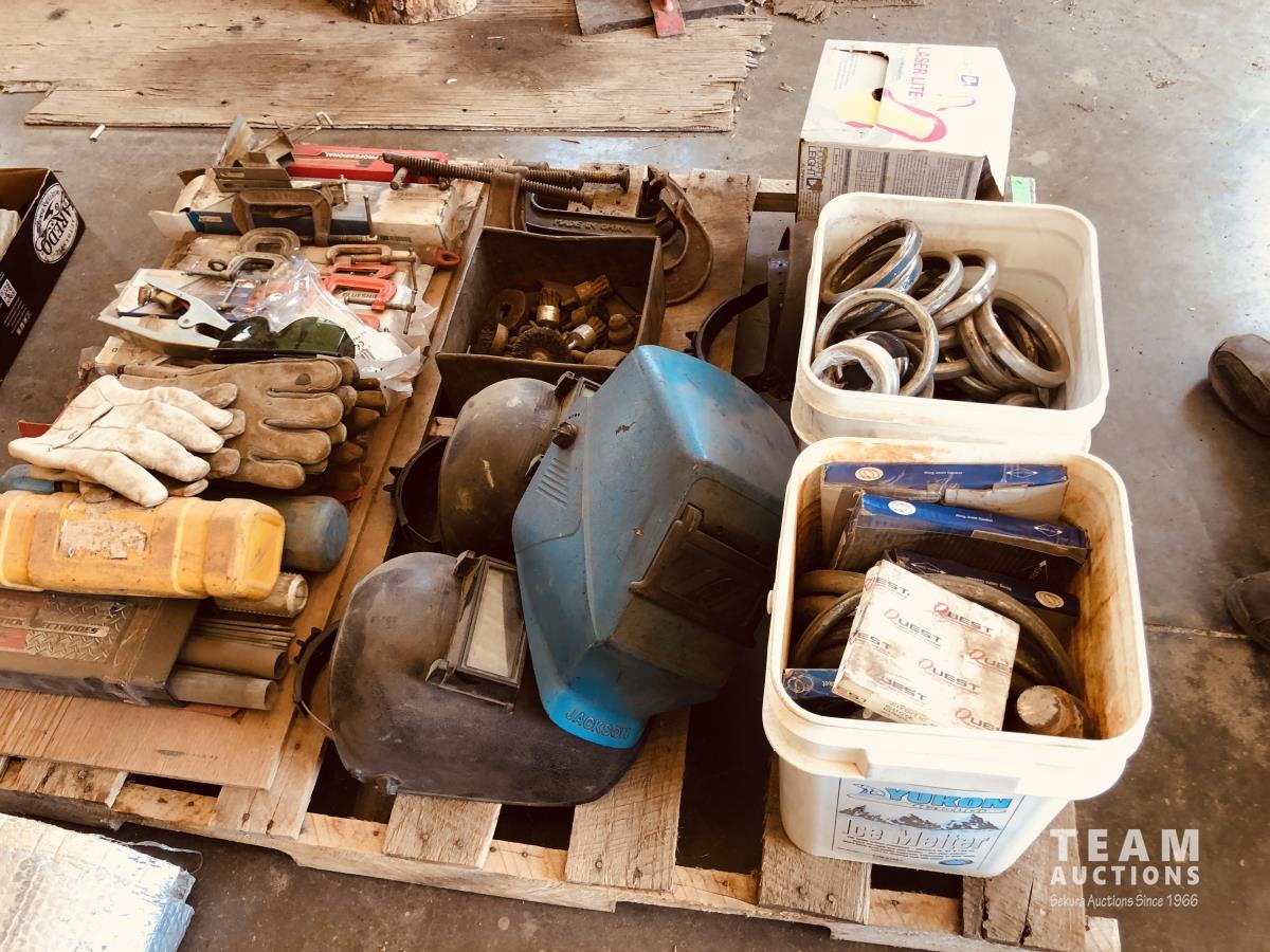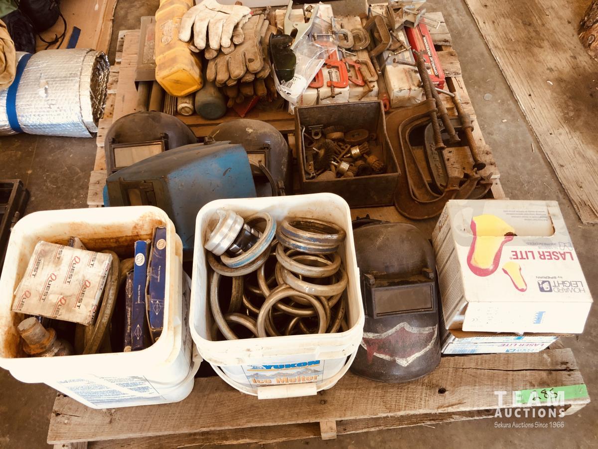 C clamps, ear plugs, welding gloves, corner clamps, buffing wheels, assorted welding rods, rings, miscellaneous