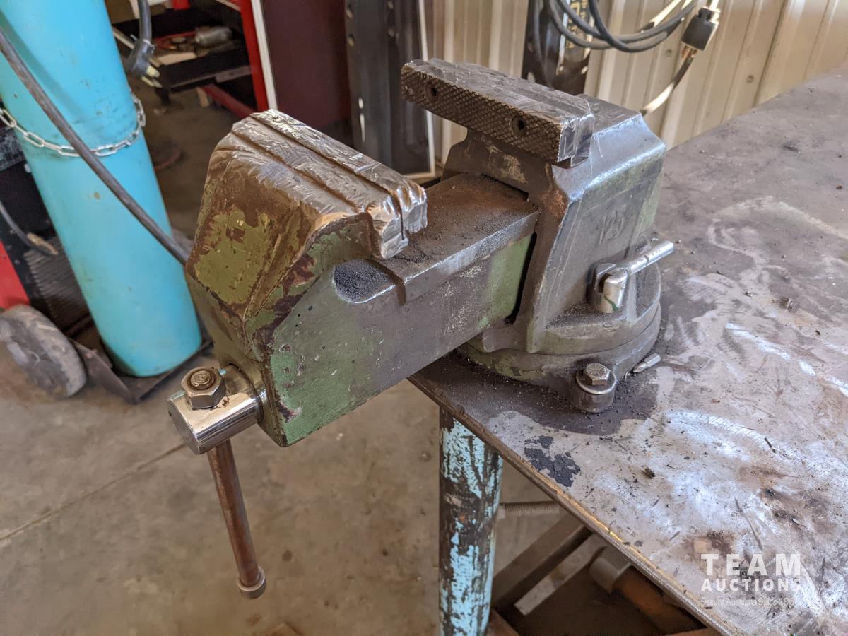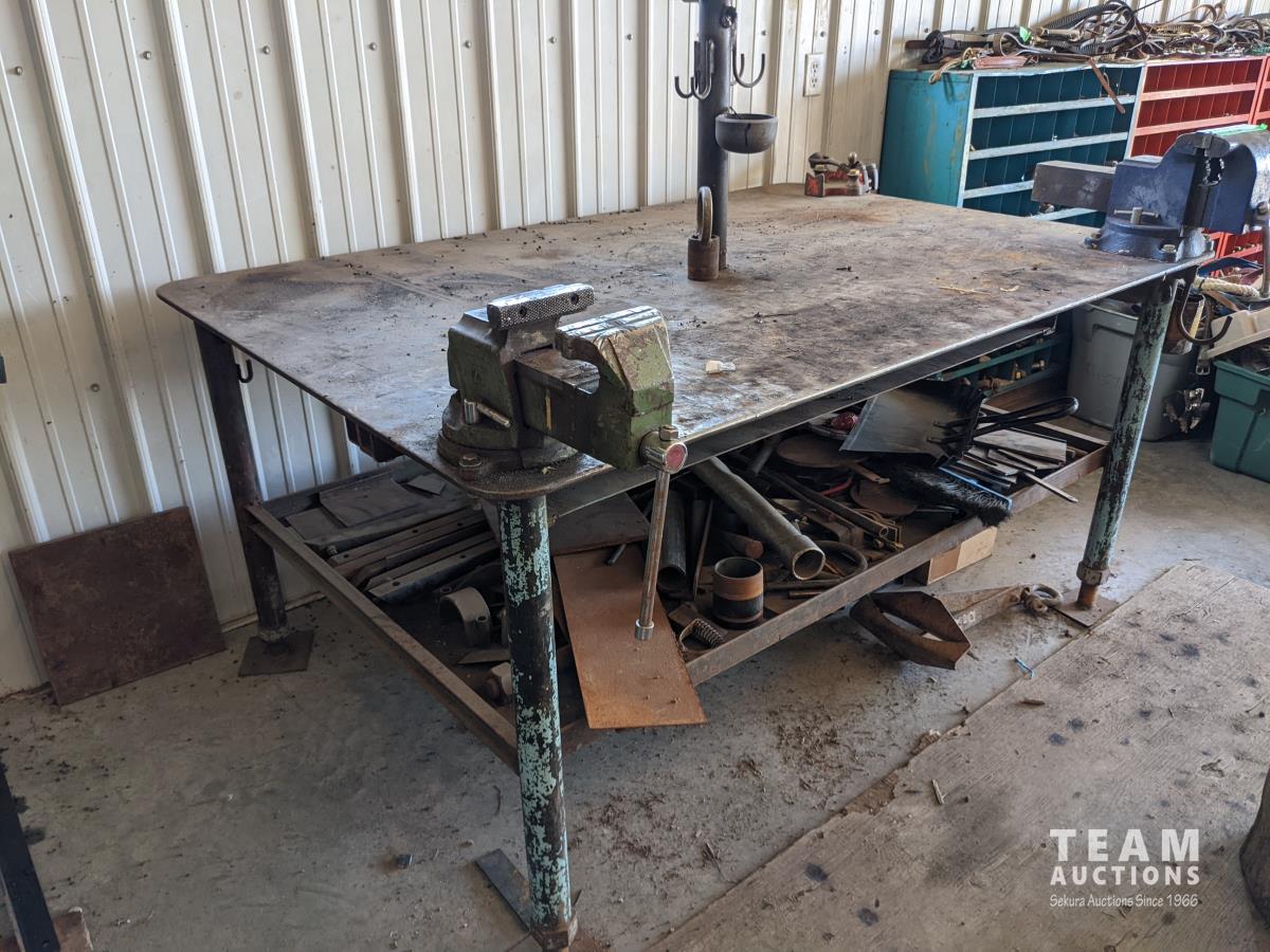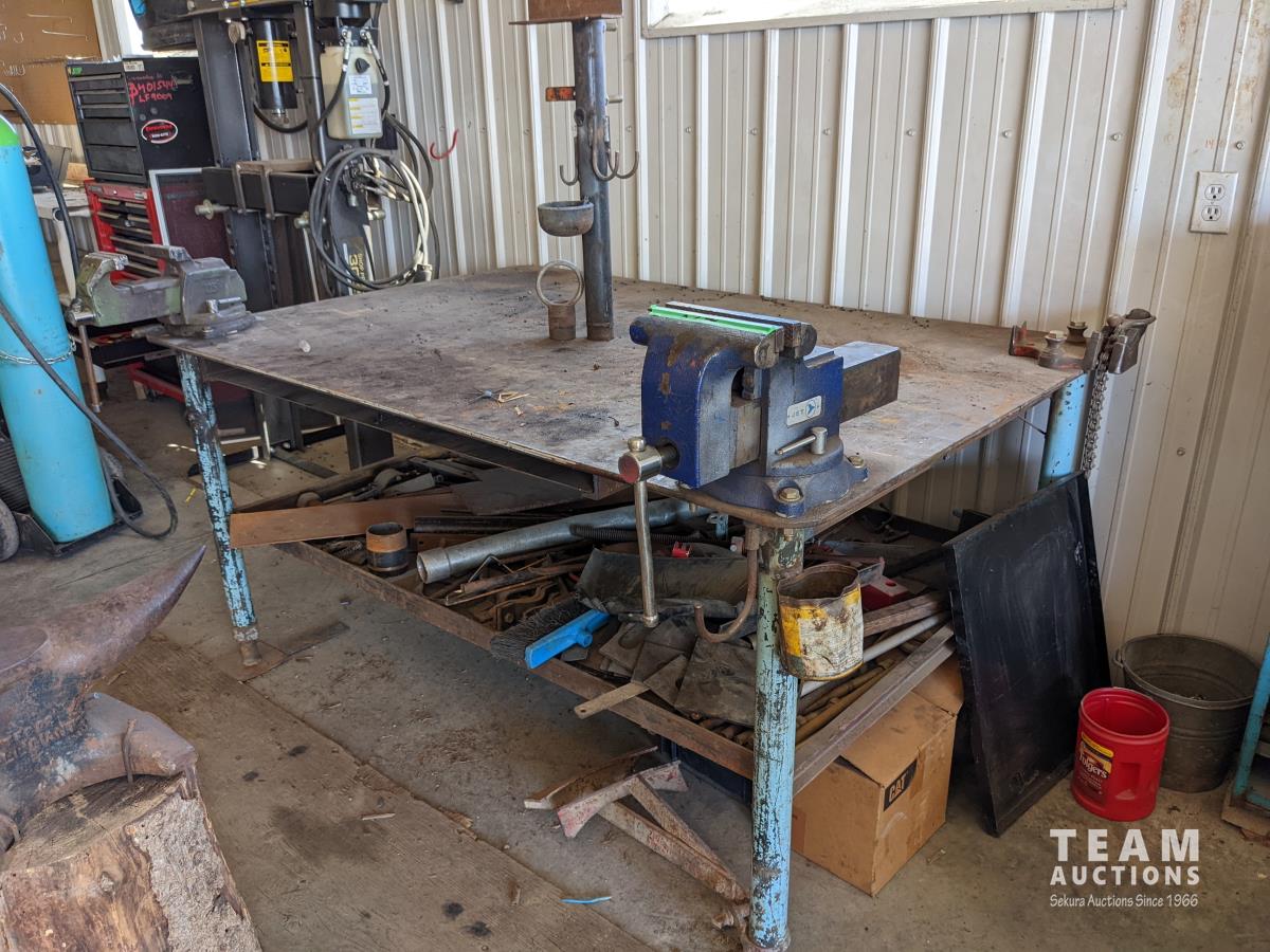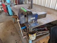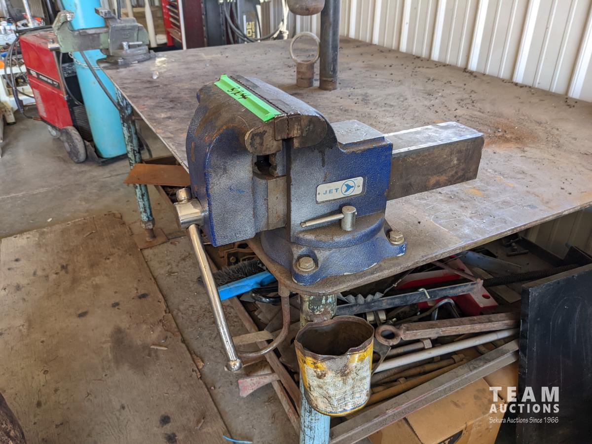 with assorted steel material, 8 inch vise, 6 inch vise, pipe vise