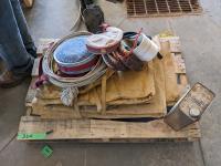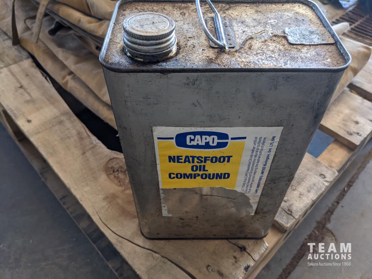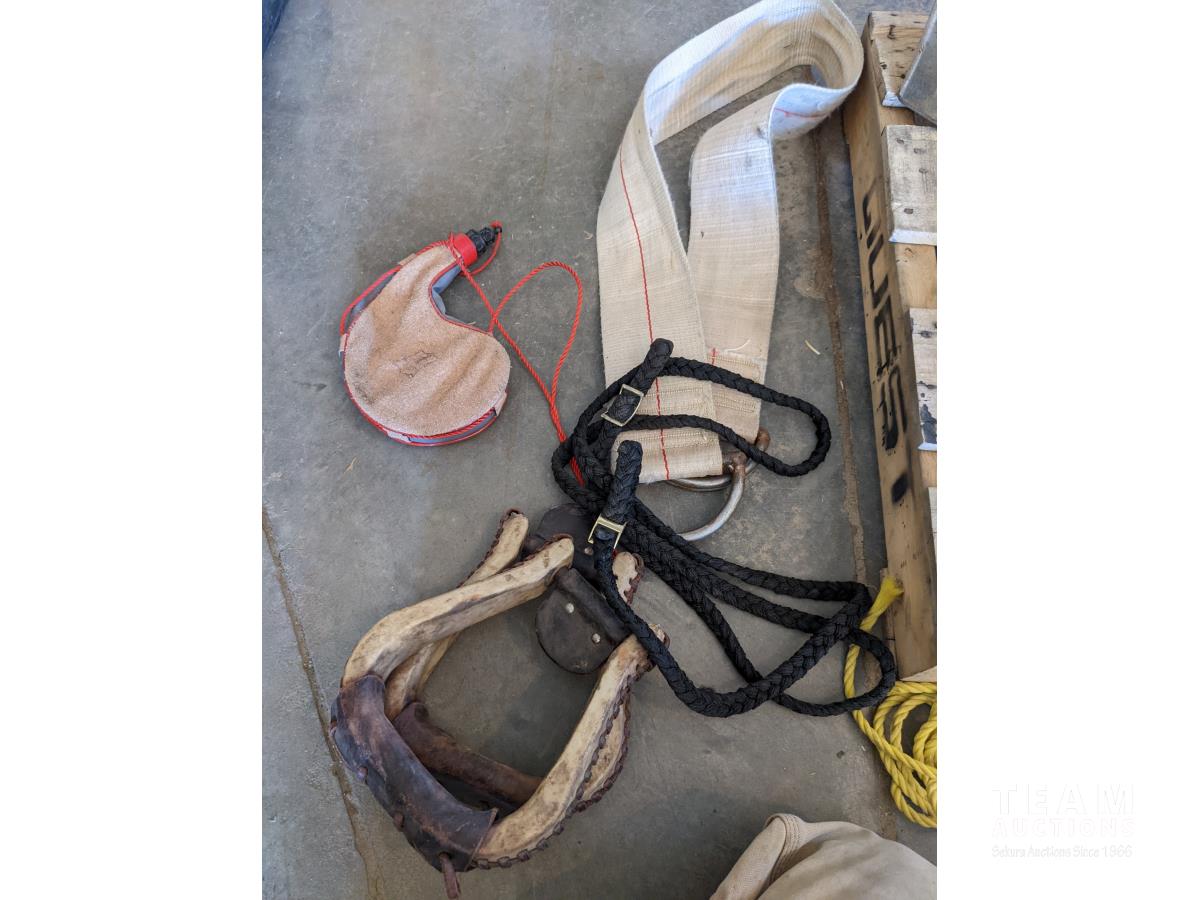 (4) Canvas tarps, canteen, wine skin, (2) lariat ropes, canvas saddle bags, over sized stirrups, part can of Neats foot oil