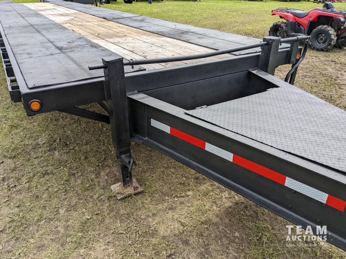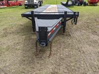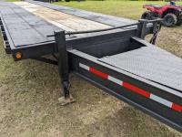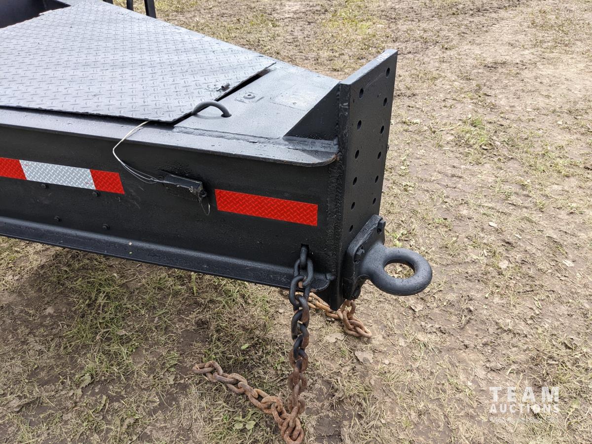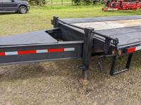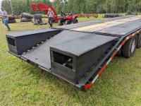 10,000 lb axles, pintle hitch, dual jacks, stake pockets, rub rail, spring suspension, flip over ramps with center pop up deck, new 235/85R16 tires