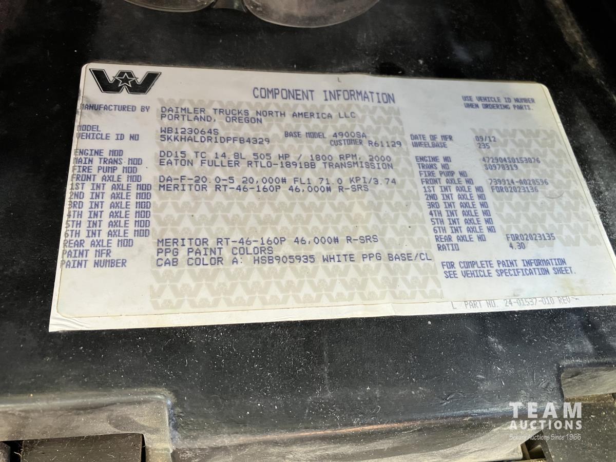 Detroit DD15, 14.8 L 505 HP diesel, Eaton Fuller 18 speed, double differential lock w/ cross lock, 18,000 lb front, 46,000 lb rear, double frame, 4.30 ratio, 2013 Advance tank, T&E 3 inch hydraulic driven pump, 234 inch WB, air ride suspension, 385/65R22.5 front, 11R24.5 rear
