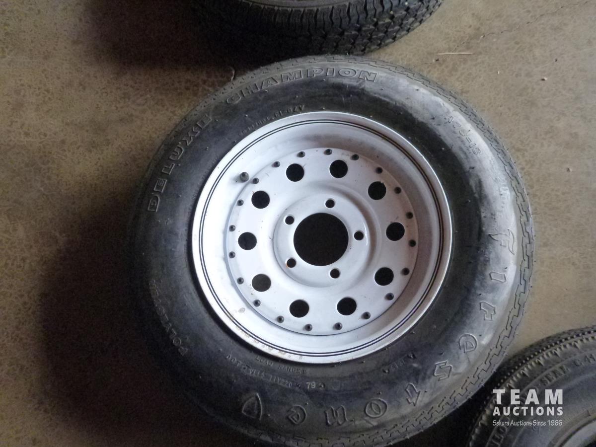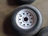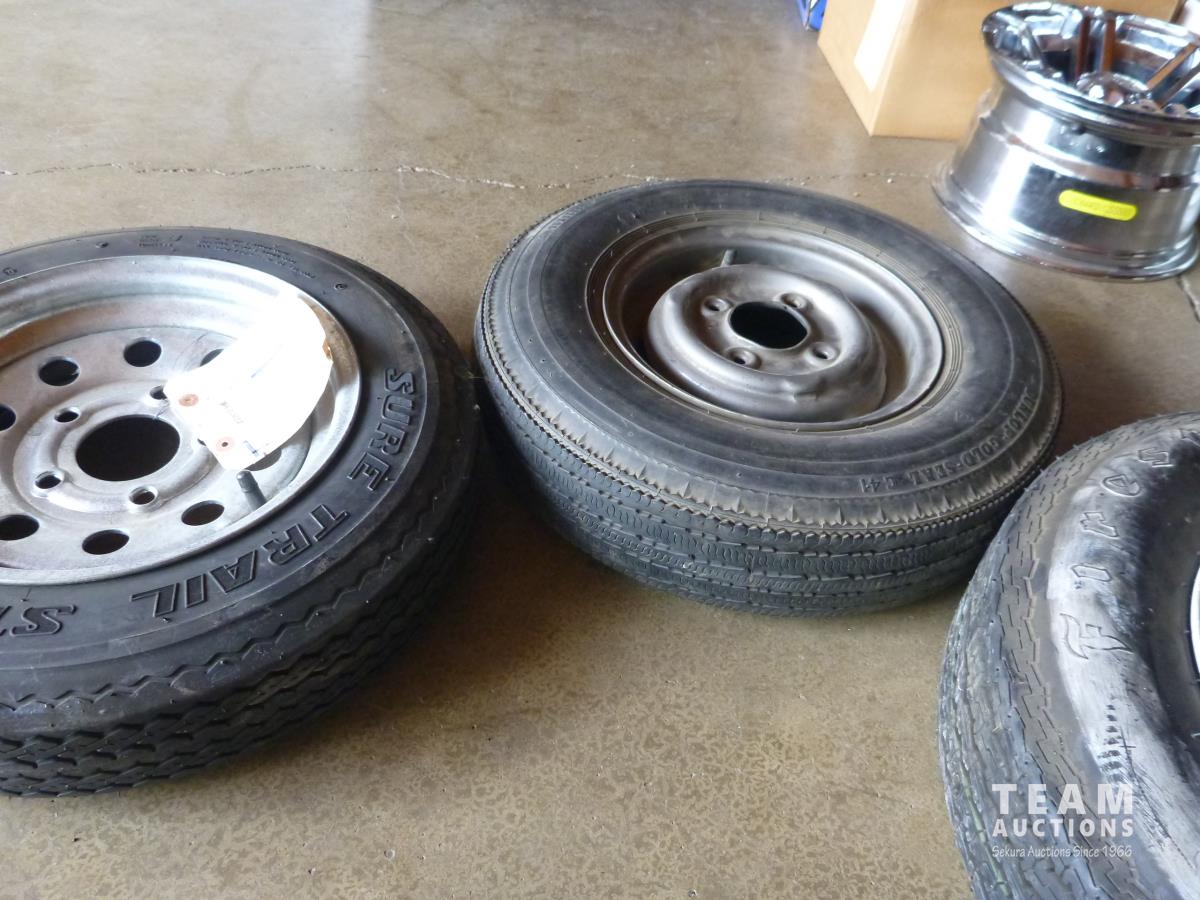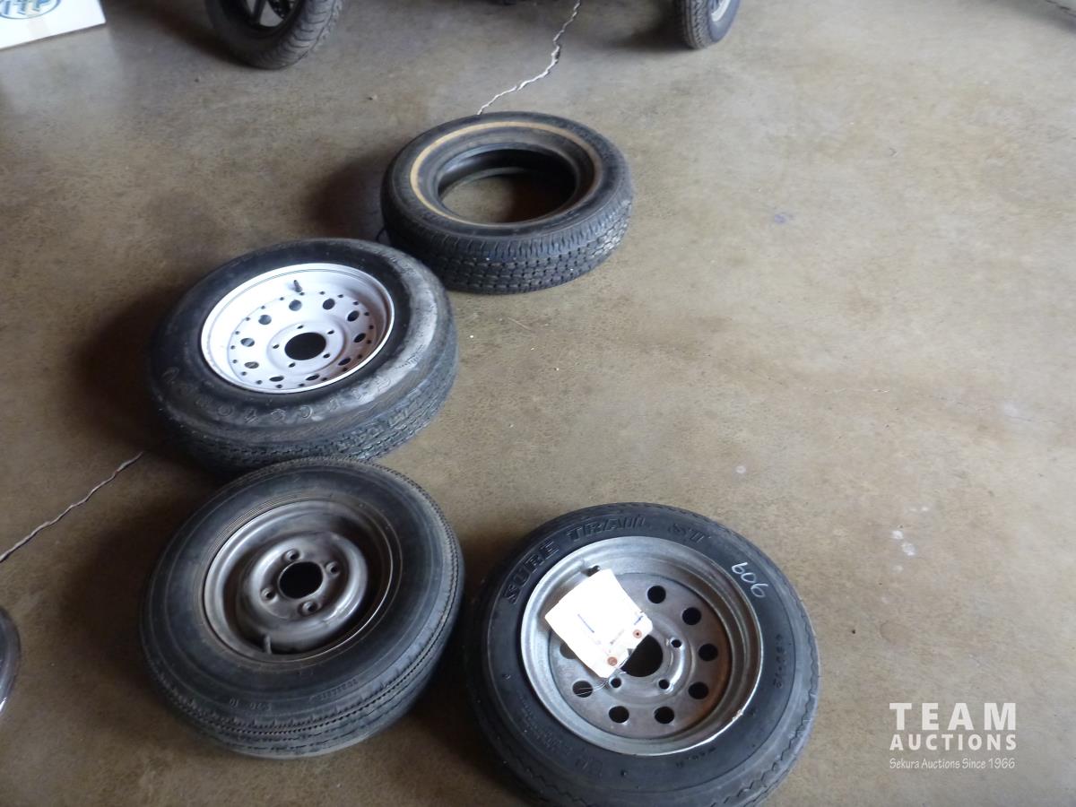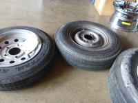 (1) A78-13 tire with 5 bolt rim, (1) 4.80-12 tire with 5 bolt rim, (1) 5.20-10 tire with 4 bolt rim, (1) P165/80R13 tire