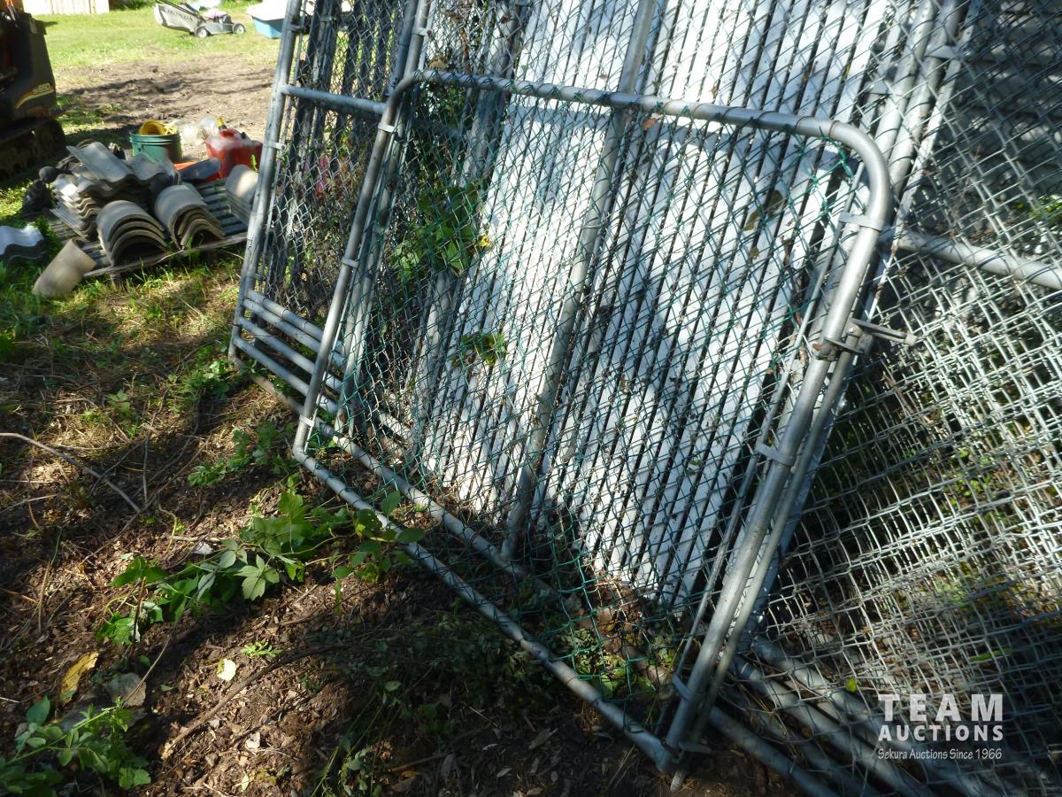 (7) 10 ft 6 inch chain link panels, (1) 11 ft chain link panel with 30 inch walk thru gate, (2) divder panels