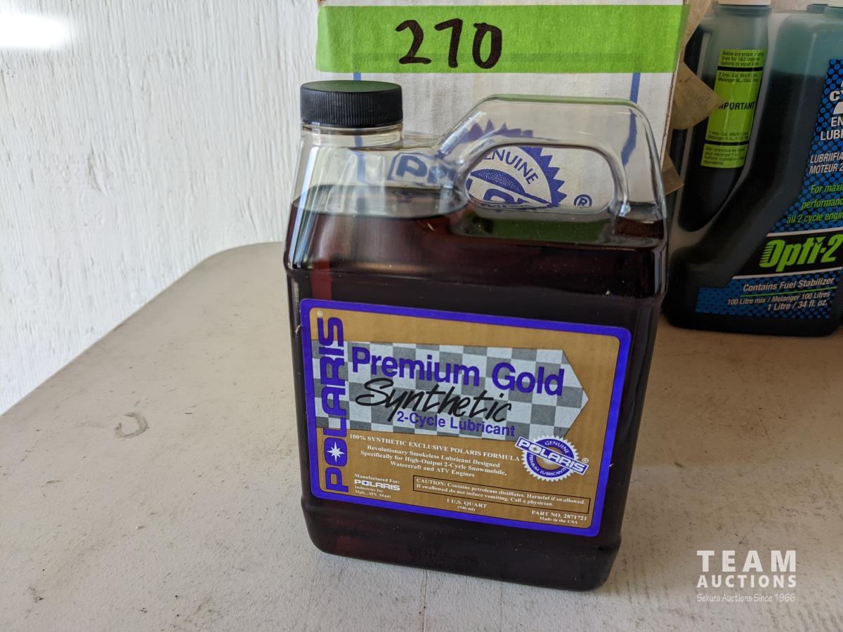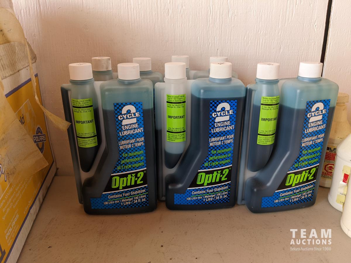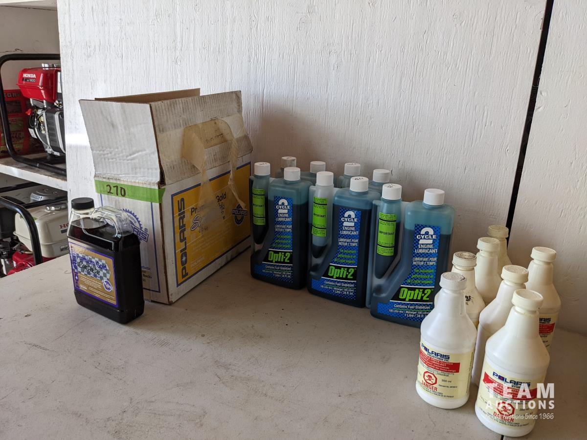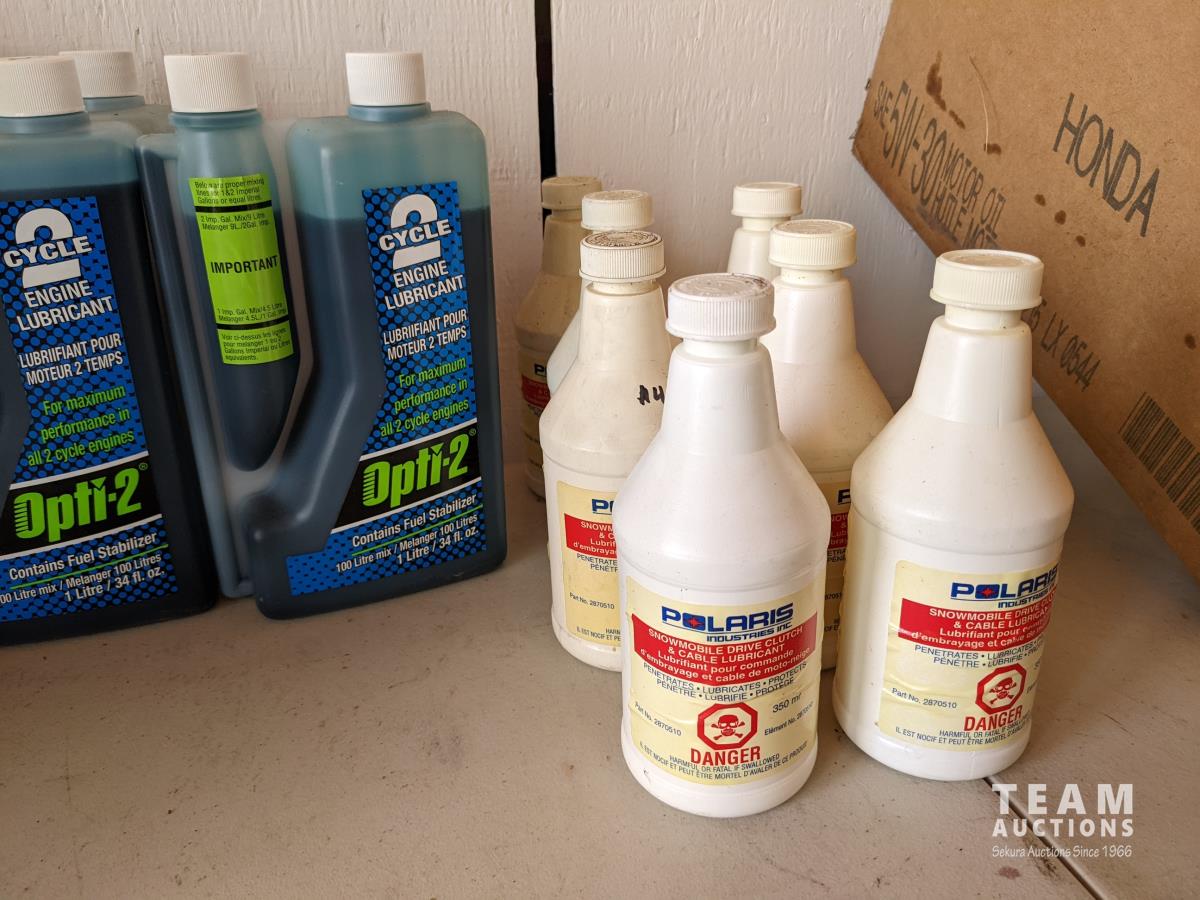 (6) 1 US Qt Polaris Synthetic 2 cycle oil, (5) 1 Litre Opti-2 2 cycle oil, (7) Polaris clutch drive and cable lubricant