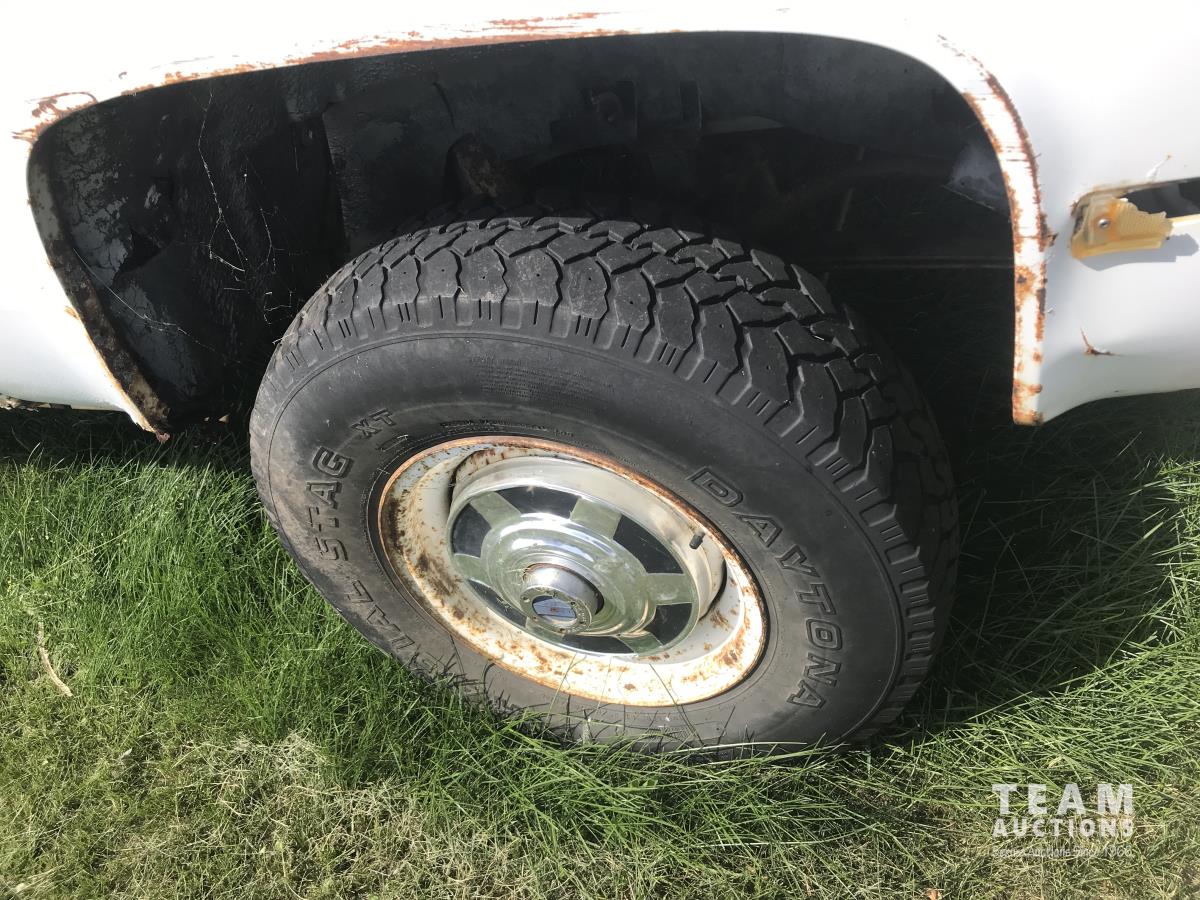 4 speed, bench seat, tool box, Warn winch, bale forks, headache rack, 235/85R16, hood does not open