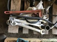 (2) 20 ton pneumatic bottle jack's, hand winch, drill, wrench set, assorted tools & drill press stand