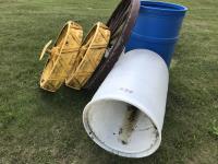 2 x vintage steel equipment wheels 1 x wooden wagon wheel 2 x poly barrels 1 x poly feed tub