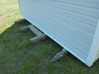 Man door, vinyl siding, k asphalt roof, on (4) pressure treated skids, 6 ft work bemch, 8 ft wooden shelving