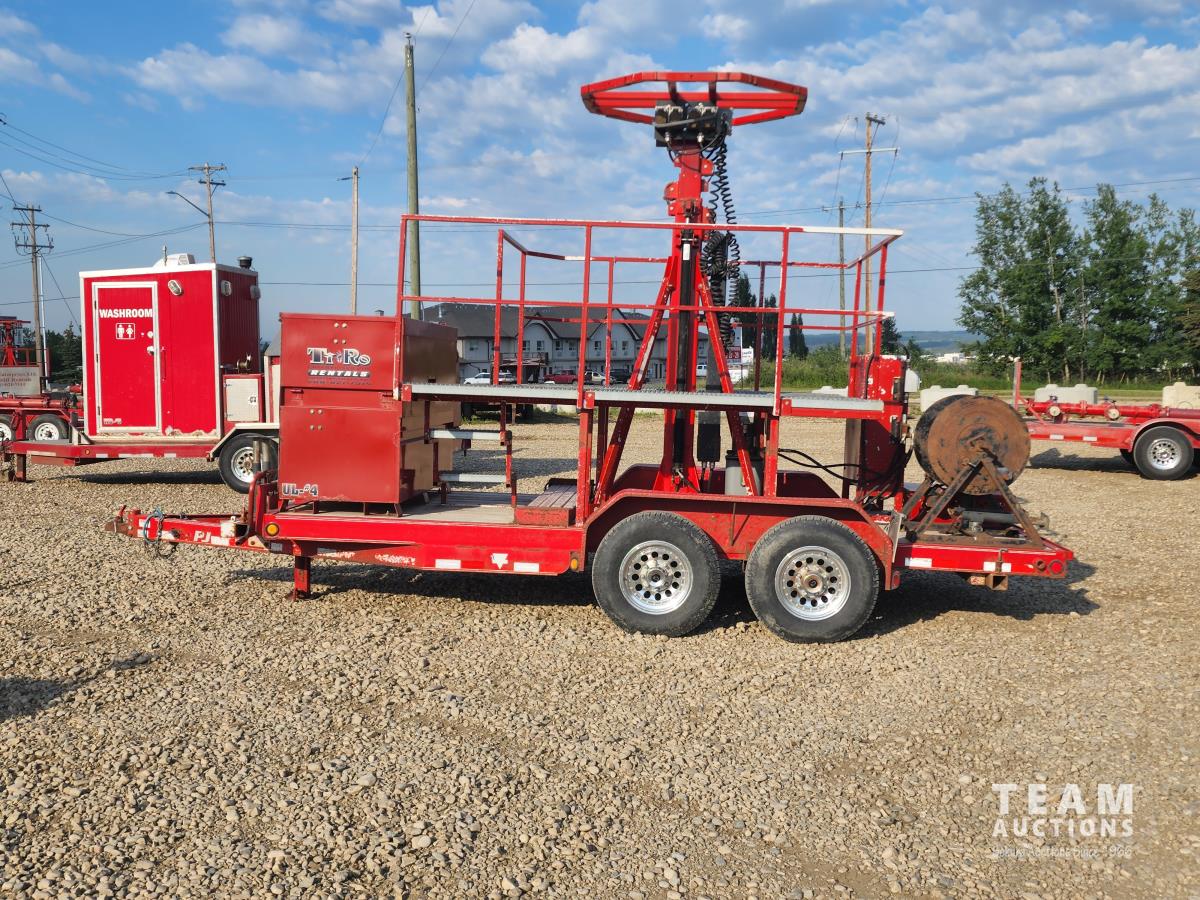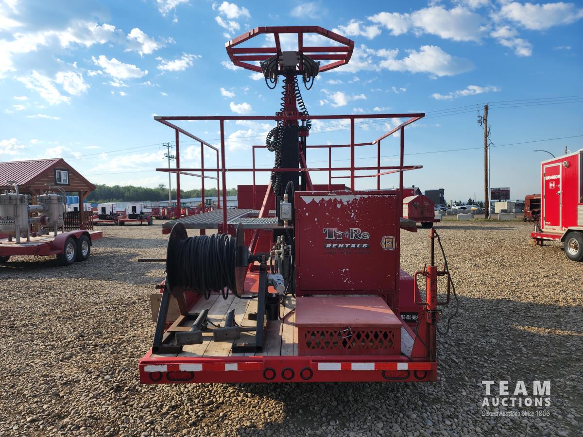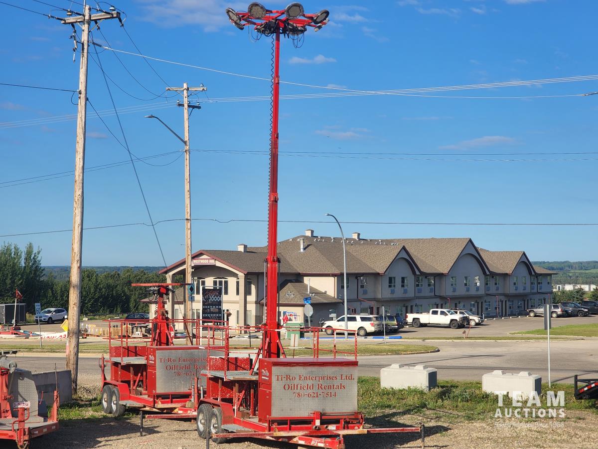 (2) 7,000 lb axles, 80 inch wide, torflex suspension, (8) lights, 235/80R16 tires on aluminum rims, 45 ft height, (8) LED lumen 26,000 watt lights, lights over a 400 ft circle, operates with 220 watt single phase power